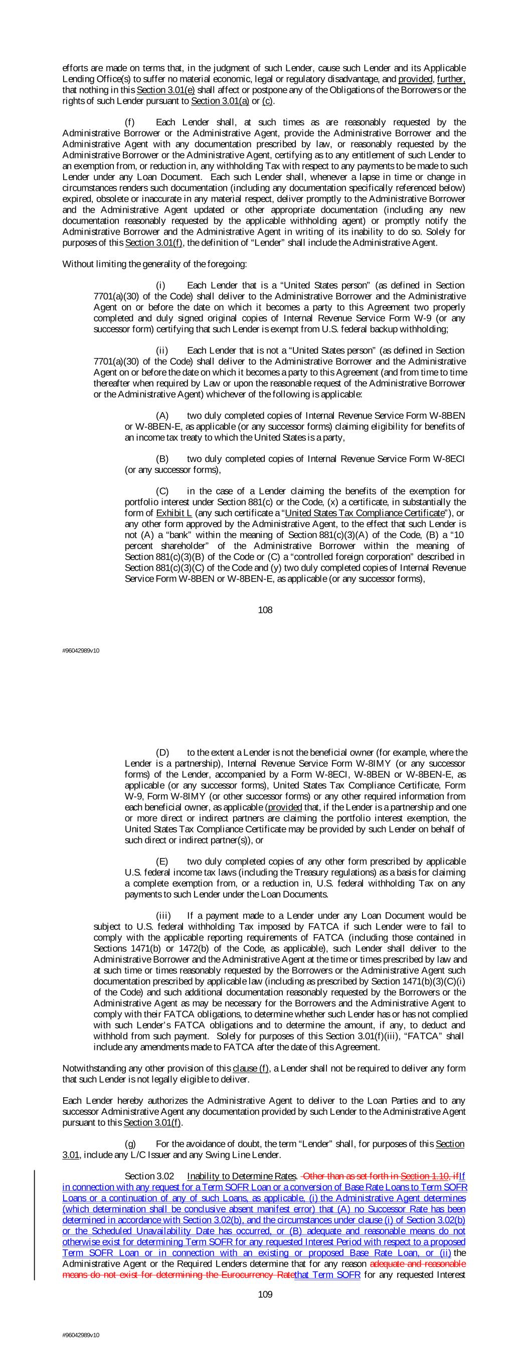 efforts are made on terms that, in the judgment of such Lender, cause such Lender and its Applicable Lending Office(s) to suffer no material economic, legal or regulatory disadvantage, and provided, further, that nothing in this Section 3.01(e) shall affect or postpone any of the Obligations of the Borrowers or the rights of such Lender pursuant to Section 3.01(a) or (c). (f) Each Lender shall, at such times as are reasonably requested by the Administrative Borrower or the Administrative Agent, provide the Administrative Borrower and the Administrative Agent with any documentation prescribed by law, or reasonably requested by the Administrative Borrower or the Administrative Agent, certifying as to any entitlement of such Lender to an exemption from, or reduction in, any withholding Tax with respect to any payments to be made to such Lender under any Loan Document. Each such Lender shall, whenever a lapse in time or change in circumstances renders such documentation (including any documentation specifically referenced below) expired, obsolete or inaccurate in any material respect, deliver promptly to the Administrative Borrower and the Administrative Agent updated or other appropriate documentation (including any new documentation reasonably requested by the applicable withholding agent) or promptly notify the Administrative Borrower and the Administrative Agent in writing of its inability to do so. Solely for purposes of this Section 3.01(f), the definition of “Lender” shall include the Administrative Agent. Without limiting the generality of the foregoing: (i) Each Lender that is a “United States person” (as defined in Section 7701(a)(30) of the Code) shall deliver to the Administrative Borrower and the Administrative Agent on or before the date on which it becomes a party to this Agreement two properly completed and duly signed original copies of Internal Revenue Service Form W-9 (or any successor form) certifying that such Lender is exempt from U.S. federal backup withholding; (ii) Each Lender that is not a “United States person” (as defined in Section 7701(a)(30) of the Code) shall deliver to the Administrative Borrower and the Administrative Agent on or before the date on which it becomes a party to this Agreement (and from time to time thereafter when required by Law or upon the reasonable request of the Administrative Borrower or the Administrative Agent) whichever of the following is applicable: (A) two duly completed copies of Internal Revenue Service Form W-8BEN or W-8BEN-E, as applicable (or any successor forms) claiming eligibility for benefits of an income tax treaty to which the United States is a party, (B) two duly completed copies of Internal Revenue Service Form W-8ECI (or any successor forms), (C) in the case of a Lender claiming the benefits of the exemption for portfolio interest under Section 881(c) or the Code, (x) a certificate, in substantially the form of Exhibit L (any such certificate a “United States Tax Compliance Certificate”), or any other form approved by the Administrative Agent, to the effect that such Lender is not (A) a “bank” within the meaning of Section 881(c)(3)(A) of the Code, (B) a “10 percent shareholder” of the Administrative Borrower within the meaning of Section 881(c)(3)(B) of the Code or (C) a “controlled foreign corporation” described in Section 881(c)(3)(C) of the Code and (y) two duly completed copies of Internal Revenue Service Form W-8BEN or W-8BEN-E, as applicable (or any successor forms), 108 #96042989v10 (D) to the extent a Lender is not the beneficial owner (for example, where the Lender is a partnership), Internal Revenue Service Form W-8IMY (or any successor forms) of the Lender, accompanied by a Form W-8ECI, W-8BEN or W-8BEN-E, as applicable (or any successor forms), United States Tax Compliance Certificate, Form W-9, Form W-8IMY (or other successor forms) or any other required information from each beneficial owner, as applicable (provided that, if the Lender is a partnership and one or more direct or indirect partners are claiming the portfolio interest exemption, the United States Tax Compliance Certificate may be provided by such Lender on behalf of such direct or indirect partner(s)), or (E) two duly completed copies of any other form prescribed by applicable U.S. federal income tax laws (including the Treasury regulations) as a basis for claiming a complete exemption from, or a reduction in, U.S. federal withholding Tax on any payments to such Lender under the Loan Documents. (iii) If a payment made to a Lender under any Loan Document would be subject to U.S. federal withholding Tax imposed by FATCA if such Lender were to fail to comply with the applicable reporting requirements of FATCA (including those contained in Sections 1471(b) or 1472(b) of the Code, as applicable), such Lender shall deliver to the Administrative Borrower and the Administrative Agent at the time or times prescribed by law and at such time or times reasonably requested by the Borrowers or the Administrative Agent such documentation prescribed by applicable law (including as prescribed by Section 1471(b)(3)(C)(i) of the Code) and such additional documentation reasonably requested by the Borrowers or the Administrative Agent as may be necessary for the Borrowers and the Administrative Agent to comply with their FATCA obligations, to determine whether such Lender has or has not complied with such Lender’s FATCA obligations and to determine the amount, if any, to deduct and withhold from such payment. Solely for purposes of this Section 3.01(f)(iii), “FATCA” shall include any amendments made to FATCA after the date of this Agreement. Notwithstanding any other provision of this clause (f), a Lender shall not be required to deliver any form that such Lender is not legally eligible to deliver. Each Lender hereby authorizes the Administrative Agent to deliver to the Loan Parties and to any successor Administrative Agent an