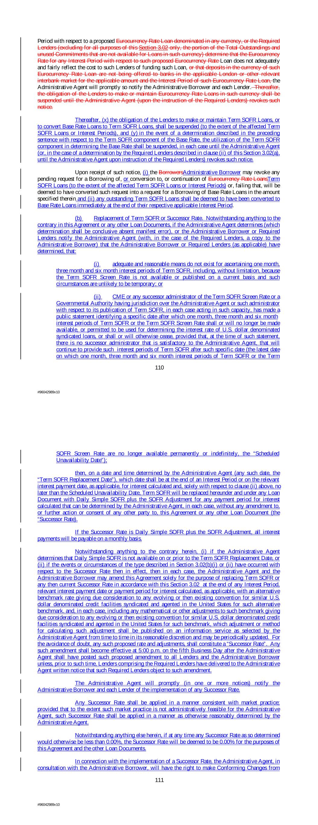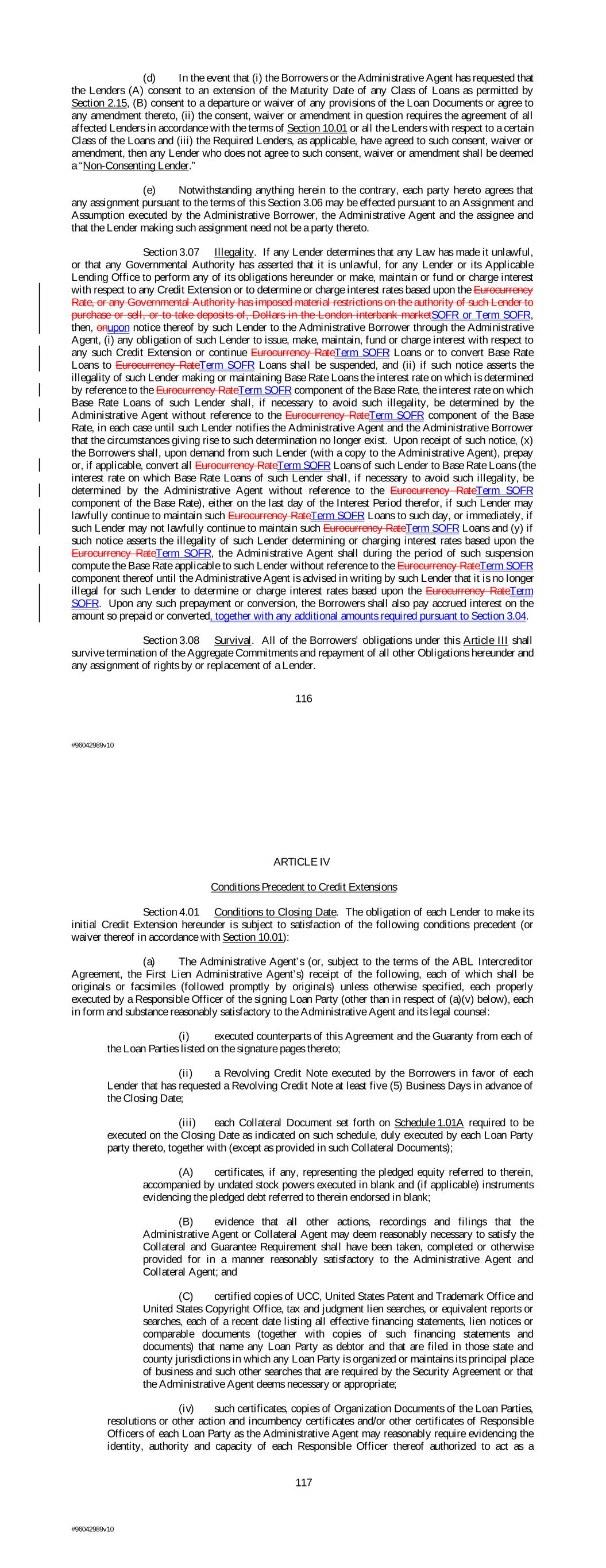 (d) In the event that (i) the Borrowers or the Administrative Agent has requested that the Lenders (A) consent to an extension of the Maturity Date of any Class of Loans as permitted by Section 2.15, (B) consent to a departure or waiver of any provisions of the Loan Documents or agree to any amendment thereto, (ii) the consent, waiver or amendment in question requires the agreement of all affected Lenders in accordance with the terms of Section 10.01 or all the Lenders with respect to a certain Class of the Loans and (iii) the Required Lenders, as applicable, have agreed to such consent, waiver or amendment, then any Lender who does not agree to such consent, waiver or amendment shall be deemed a “Non-Consenting Lender.” (e) Notwithstanding anything herein to the contrary, each party hereto agrees that any assignment pursuant to the terms of this Section 3.06 may be effected pursuant to an Assignment and Assumption executed by the Administrative Borrower, the Administrative Agent and the assignee and that the Lender making such assignment need not be a party thereto. Section 3.07 Illegality. If any Lender determines that any Law has made it unlawful, or that any Governmental Authority has asserted that it is unlawful, for any Lender or its Applicable Lending Office to perform any of its obligations hereunder or make, maintain or fund or charge interest with respect to any Credit Extension or to determine or charge interest rates based upon the Eurocurrency Rate, or any Governmental Authority has imposed material restrictions on the authority of such Lender to purchase or sell, or to take deposits of, Dollars in the London interbank marketSOFR or Term SOFR, then, onupon notice thereof by such Lender to the Administrative Borrower through the Administrative Agent, (i) any obligation of such Lender to issue, make, maintain, fund or charge interest with respect to any such Credit Extension or continue Eurocurrency RateTerm SOFR Loans or to convert Base Rate Loans to Eurocurrency RateTerm SOFR Loans shall be suspended, and (ii) if such notice asserts the illegality of such Lender making or maintaining Base Rate Loans the interest rate on which is determined by reference to the Eurocurrency RateTerm SOFR component of the Base Rate, the interest rate on which Base Rate Loans of such Lender shall, if necessary to avoid such illegality, be determined by the Administrative Agent without reference to the Eurocurrency RateTerm SOFR component of the Base Rate, in each case until such Lender notifies the Administrative Agent and the Administrative Borrower that the circumstances giving rise to such determination no longer exist. Upon receipt of such notice, (x) the Borrowers shall, upon demand from such Lender (with a copy to the Administrative Agent), prepay or, if applicable, convert all Eurocurrency RateTerm SOFR Loans of such Lender to Base Rate Loans (the interest rate on which Base Rate Loans of such Lender shall, if necessary to avoid such illegality, be determined by the Administrative Agent without reference to the Eurocurrency RateTerm SOFR component of the Base Rate), either on the last day of the Interest Period therefor, if such Lender may lawfully continue to maintain such Eurocurrency RateTerm SOFR Loans to such day, or immediately, if such Lender may not lawfully continue to maintain such Eurocurrency RateTerm SOFR Loans and (y) if such notice asserts the illegality of such Lender determining or charging interest rates based upon the Eurocurrency RateTerm SOFR, the Administrative Agent shall during the period of such suspension compute the Base Rate applicable to such Lender without reference to the Eurocurrency RateTerm SOFR component thereof until the Administrative Agent is advised in writing by such Lender that it is no longer illegal for such Lender to determine or charge interest rates based upon the Eurocurrency RateTerm SOFR. Upon any such prepayment or conversion, the Borrowers shall also pay accrued interest on the amount so prepaid or converted, together with any additional amounts required pursuant to Section 3.04. Section 3.08 Survival. All of the Borrowers’ obligations under this Article III shall survive termination of the Aggregate Commitments and repayment of all other Obligations hereunder and any assignment of rights by or replacement of a Lender. 116 #96042989v10 ARTICLE IV Conditions Precedent to Credit Extensions Section 4.01 Conditions to Closing Date. The obligation of each Lender to make its initial Credit Extension hereunder is subject to satisfaction of the following conditions precedent (or waiver thereof in accordance with Section 10.01): (a) The Administrative Agent’s (or, subject to the terms of the ABL Intercreditor Agreement, the First Lien Administrative Agent’s) receipt of the following, each of which shall be originals or facsimiles (followed promptly by originals) unless otherwise specified, each properly executed by a Responsible Officer of the signing Loan Party (other than in respect of (a)(v) below), each in form and substance reasonably satisfactory to the Administrative Agent and its legal counsel: (i) executed counterparts of this Agreement and the Guaranty from each of the Loan Parties listed on the signature pages thereto; (ii) a Revolving Credit Note executed by the Borrowers in favor of each Lender that has requested a Revolving Credit Note at least five (5) Business Days in advance of the Closing Date; (iii) each Collateral Document set forth on Schedule 1.01A required to be executed on the Closing Date as indicated on such schedule, duly executed by each Loan Party party thereto, together with (except as provided in such Collateral Documents); (A) certificates, if any, representing the pledged equity referred to therein, accompanied by undated stock powers executed in blank and (if applicable) instruments evidencing the pledged debt referred to therein endorsed in blank; (B) evidence that all other actions, recordings and fili