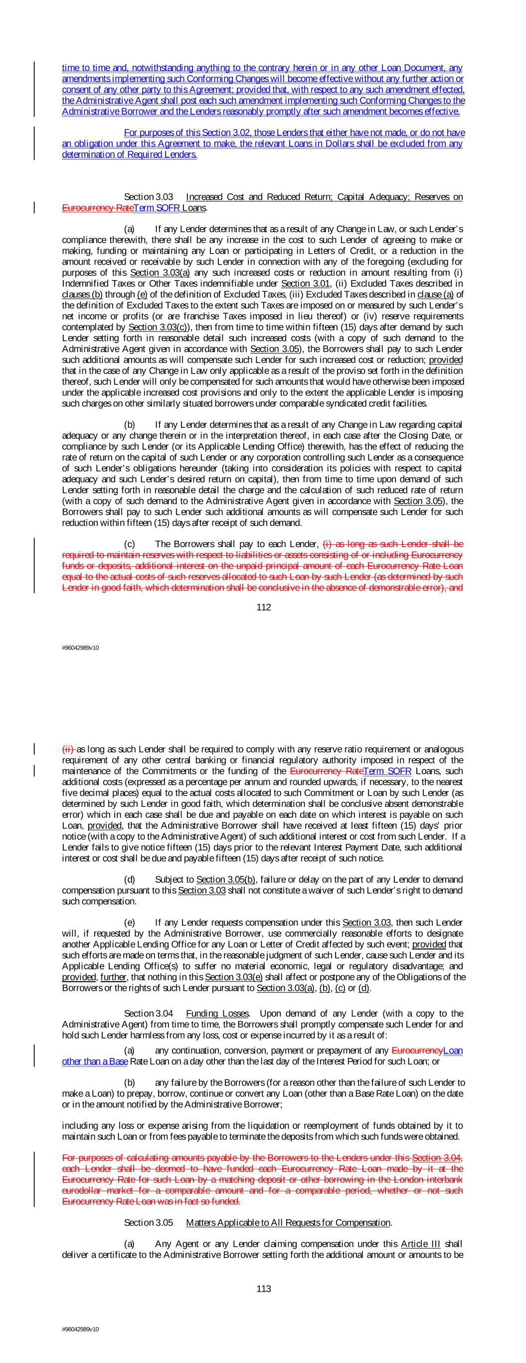 time to time and, notwithstanding anything to the contrary herein or in any other Loan Document, any amendments implementing such Conforming Changes will become effective without any further action or consent of any other party to this Agreement; provided that, with respect to any such amendment effected, the Administrative Agent shall post each such amendment implementing such Conforming Changes to the Administrative Borrower and the Lenders reasonably promptly after such amendment becomes effective. For purposes of this Section 3.02, those Lenders that either have not made, or do not have an obligation under this Agreement to make, the relevant Loans in Dollars shall be excluded from any determination of Required Lenders. Section 3.03 Increased Cost and Reduced Return; Capital Adequacy; Reserves on Eurocurrency RateTerm SOFR Loans. (a) If any Lender determines that as a result of any Change in Law, or such Lender’s compliance therewith, there shall be any increase in the cost to such Lender of agreeing to make or making, funding or maintaining any Loan or participating in Letters of Credit, or a reduction in the amount received or receivable by such Lender in connection with any of the foregoing (excluding for purposes of this Section 3.03(a) any such increased costs or reduction in amount resulting from (i) Indemnified Taxes or Other Taxes indemnifiable under Section 3.01, (ii) Excluded Taxes described in clauses (b) through (e) of the definition of Excluded Taxes, (iii) Excluded Taxes described in clause (a) of the definition of Excluded Taxes to the extent such Taxes are imposed on or measured by such Lender’s net income or profits (or are franchise Taxes imposed in lieu thereof) or (iv) reserve requirements contemplated by Section 3.03(c)), then from time to time within fifteen (15) days after demand by such Lender setting forth in reasonable detail such increased costs (with a copy of such demand to the Administrative Agent given in accordance with Section 3.05), the Borrowers shall pay to such Lender such additional amounts as will compensate such Lender for such increased cost or reduction; provided that in the case of any Change in Law only applicable as a result of the proviso set forth in the definition thereof, such Lender will only be compensated for such amounts that would have otherwise been imposed under the applicable increased cost provisions and only to the extent the applicable Lender is imposing such charges on other similarly situated borrowers under comparable syndicated credit facilities. (b) If any Lender determines that as a result of any Change in Law regarding capital adequacy or any change therein or in the interpretation thereof, in each case after the Closing Date, or compliance by such Lender (or its Applicable Lending Office) therewith, has the effect of reducing the rate of return on the capital of such Lender or any corporation controlling such Lender as a consequence of such Lender’s obligations hereunder (taking into consideration its policies with respect to capital adequacy and such Lender’s desired return on capital), then from time to time upon demand of such Lender setting forth in reasonable detail the charge and the calculation of such reduced rate of return (with a copy of such demand to the Administrative Agent given in accordance with Section 3.05), the Borrowers shall pay to such Lender such additional amounts as will compensate such Lender for such reduction within fifteen (15) days after receipt of such demand. (c) The Borrowers shall pay to each Lender, (i) as long as such Lender shall be required to maintain reserves with respect to liabilities or assets consisting of or including Eurocurrency funds or deposits, additional interest on the unpaid principal amount of each Eurocurrency Rate Loan equal to the actual costs of such reserves allocated to such Loan by such Lender (as determined by such Lender in good faith, which determination shall be conclusive in the absence of demonstrable error), and 112 #96042989v10 (ii) as long as such Lender shall be required to comply with any reserve ratio requirement or analogous requirement of any other central banking or financial regulatory authority imposed in respect of the maintenance of the Commitments or the funding of the Eurocurrency RateTerm SOFR Loans, such additional costs (expressed as a percentage per annum and rounded upwards, if necessary, to the nearest five decimal places) equal to the actual costs allocated to such Commitment or Loan by such Lender (as determined by such Lender in good faith, which determination shall be conclusive absent demonstrable error) which in each case shall be due and payable on each date on which interest is payable on such Loan, provided, that the Administrative Borrower shall have received at least fifteen (15) days’ prior notice (with a copy to the Administrative Agent) of such additional interest or cost from such Lender. If a Lender fails to give notice fifteen (15) days prior to the relevant Interest Payment Date, such additional interest or cost shall be due and payable fifteen (15) days after receipt of such notice. (d) Subject to Section 3.05(b), failure or delay on the part of any Lender to demand compensation pursuant to this Section 3.03 shall not constitute a waiver of such Lender’s right to demand such compensation. (e) If any Lender requests compensation under this Section 3.03, then such Lender will, if requested by the Administrative Borrower, use commercially reasonable efforts to designate another Applicable Lending Office for any Loan or Letter of Credit affected by such event; provided that such efforts are made on terms that, in the reasonable judgment of such Lender, cause such Lender and its Applicable Lending Office(s) to suffer no material economic, legal or regulatory disadvantage; and provided, further, that nothing in this Section 3.03(e) shall affect or postpone any of the Obligations of the Borrowers or the rig
