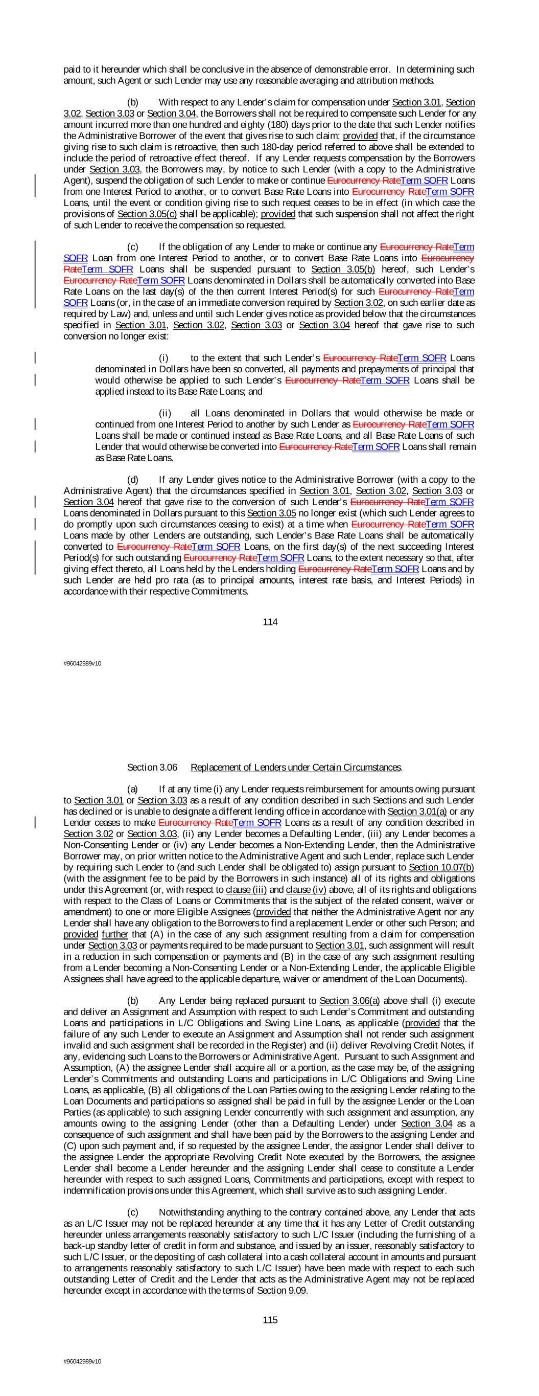 paid to it hereunder which shall be conclusive in the absence of demonstrable error. In determining such amount, such Agent or such Lender may use any reasonable averaging and attribution methods. (b) With respect to any Lender’s claim for compensation under Section 3.01, Section 3.02, Section 3.03 or Section 3.04, the Borrowers shall not be required to compensate such Lender for any amount incurred more than one hundred and eighty (180) days prior to the date that such Lender notifies the Administrative Borrower of the event that gives rise to such claim; provided that, if the circumstance giving rise to such claim is retroactive, then such 180-day period referred to above shall be extended to include the period of retroactive effect thereof. If any Lender requests compensation by the Borrowers under Section 3.03, the Borrowers may, by notice to such Lender (with a copy to the Administrative Agent), suspend the obligation of such Lender to make or continue Eurocurrency RateTerm SOFR Loans from one Interest Period to another, or to convert Base Rate Loans into Eurocurrency RateTerm SOFR Loans, until the event or condition giving rise to such request ceases to be in effect (in which case the provisions of Section 3.05(c) shall be applicable); provided that such suspension shall not affect the right of such Lender to receive the compensation so requested. (c) If the obligation of any Lender to make or continue any Eurocurrency RateTerm SOFR Loan from one Interest Period to another, or to convert Base Rate Loans into Eurocurrency RateTerm SOFR Loans shall be suspended pursuant to Section 3.05(b) hereof, such Lender’s Eurocurrency RateTerm SOFR Loans denominated in Dollars shall be automatically converted into Base Rate Loans on the last day(s) of the then current Interest Period(s) for such Eurocurrency RateTerm SOFR Loans (or, in the case of an immediate conversion required by Section 3.02, on such earlier date as required by Law) and, unless and until such Lender gives notice as provided below that the circumstances specified in Section 3.01, Section 3.02, Section 3.03 or Section 3.04 hereof that gave rise to such conversion no longer exist: (i) to the extent that such Lender’s Eurocurrency RateTerm SOFR Loans denominated in Dollars have been so converted, all payments and prepayments of principal that would otherwise be applied to such Lender’s Eurocurrency RateTerm SOFR Loans shall be applied instead to its Base Rate Loans; and (ii) all Loans denominated in Dollars that would otherwise be made or continued from one Interest Period to another by such Lender as Eurocurrency RateTerm SOFR Loans shall be made or continued instead as Base Rate Loans, and all Base Rate Loans of such Lender that would otherwise be converted into Eurocurrency RateTerm SOFR Loans shall remain as Base Rate Loans. (d) If any Lender gives notice to the Administrative Borrower (with a copy to the Administrative Agent) that the circumstances specified in Section 3.01, Section 3.02, Section 3.03 or Section 3.04 hereof that gave rise to the conversion of such Lender’s Eurocurrency RateTerm SOFR Loans denominated in Dollars pursuant to this Section 3.05 no longer exist (which such Lender agrees to do promptly upon such circumstances ceasing to exist) at a time when Eurocurrency RateTerm SOFR Loans made by other Lenders are outstanding, such Lender’s Base Rate Loans shall be automatically converted to Eurocurrency RateTerm SOFR Loans, on the first day(s) of the next succeeding Interest Period(s) for such outstanding Eurocurrency RateTerm SOFR Loans, to the extent necessary so that, after giving effect thereto, all Loans held by the Lenders holding Eurocurrency RateTerm SOFR Loans and by such Lender are held pro rata (as to principal amounts, interest rate basis, and Interest Periods) in accordance with their respective Commitments. 114 #96042989v10 Section 3.06 Replacement of Lenders under Certain Circumstances. (a) If at any time (i) any Lender requests reimbursement for amounts owing pursuant to Section 3.01 or Section 3.03 as a result of any condition described in such Sections and such Lender has declined or is unable to designate a different lending office in accordance with Section 3.01(a) or any Lender ceases to make Eurocurrency RateTerm SOFR Loans as a result of any condition described in Section 3.02 or Section 3.03, (ii) any Lender becomes a Defaulting Lender, (iii) any Lender becomes a Non-Consenting Lender or (iv) any Lender becomes a Non-Extending Lender, then the Administrative Borrower may, on prior written notice to the Administrative Agent and such Lender, replace such Lender by requiring such Lender to (and such Lender shall be obligated to) assign pursuant to Section 10.07(b) (with the assignment fee to be paid by the Borrowers in such instance) all of its rights and obligations under this Agreement (or, with respect to clause (iii) and clause (iv) above, all of its rights and obligations with respect to the Class of Loans or Commitments that is the subject of the related consent, waiver or amendment) to one or more Eligible Assignees (provided that neither the Administrative Agent nor any Lender shall have any obligation to the Borrowers to find a replacement Lender or other such Person; and provided further that (A) in the case of any such assignment resulting from a claim for compensation under Section 3.03 or payments required to be made pursuant to Section 3.01, such assignment will result in a reduction in such compensation or payments and (B) in the case of any such assignment resulting from a Lender becoming a Non-Consenting Lender or a Non-Extending Lender, the applicable Eligible Assignees shall have agreed to the applicable departure, waiver or amendment of the Loan Documents). (b) Any Lender being replaced pursuant to Section 3.06(a) above shall (i) execute and deliver an Assignment and Assumption with respect to such Lender’s Commitment and outstanding Loans and participatio