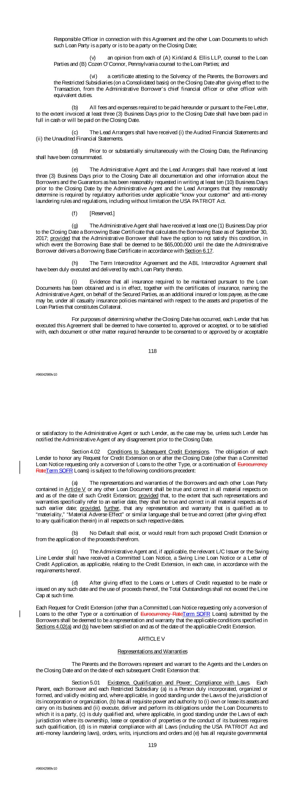 Responsible Officer in connection with this Agreement and the other Loan Documents to which such Loan Party is a party or is to be a party on the Closing Date; (v) an opinion from each of (A) Kirkland & Ellis LLP, counsel to the Loan Parties and (B) Cozen O’Connor, Pennsylvania counsel to the Loan Parties; and (vi) a certificate attesting to the Solvency of the Parents, the Borrowers and the Restricted Subsidiaries (on a Consolidated basis) on the Closing Date after giving effect to the Transaction, from the Administrative Borrower’s chief financial officer or other officer with equivalent duties. (b) All fees and expenses required to be paid hereunder or pursuant to the Fee Letter, to the extent invoiced at least three (3) Business Days prior to the Closing Date shall have been paid in full in cash or will be paid on the Closing Date. (c) The Lead Arrangers shall have received (i) the Audited Financial Statements and (ii) the Unaudited Financial Statements. (d) Prior to or substantially simultaneously with the Closing Date, the Refinancing shall have been consummated. (e) The Administrative Agent and the Lead Arrangers shall have received at least three (3) Business Days prior to the Closing Date all documentation and other information about the Borrowers and the Guarantors as has been reasonably requested in writing at least ten (10) Business Days prior to the Closing Date by the Administrative Agent and the Lead Arrangers that they reasonably determine is required by regulatory authorities under applicable “know your customer” and anti-money laundering rules and regulations, including without limitation the USA PATRIOT Act. (f) [Reserved.] (g) The Administrative Agent shall have received at least one (1) Business Day prior to the Closing Date a Borrowing Base Certificate that calculates the Borrowing Base as of September 30, 2017; provided that the Administrative Borrower shall have the option to not satisfy this condition, in which event the Borrowing Base shall be deemed to be $65,000,000 until the date the Administrative Borrower delivers a Borrowing Base Certificate in accordance with Section 6.17. (h) The Term Intercreditor Agreement and the ABL Intercreditor Agreement shall have been duly executed and delivered by each Loan Party thereto. (i) Evidence that all insurance required to be maintained pursuant to the Loan Documents has been obtained and is in effect, together with the certificates of insurance, naming the Administrative Agent, on behalf of the Secured Parties, as an additional insured or loss payee, as the case may be, under all casualty insurance policies maintained with respect to the assets and properties of the Loan Parties that constitutes Collateral. For purposes of determining whether the Closing Date has occurred, each Lender that has executed this Agreement shall be deemed to have consented to, approved or accepted, or to be satisfied with, each document or other matter required hereunder to be consented to or approved by or acceptable 118 #96042989v10 or satisfactory to the Administrative Agent or such Lender, as the case may be, unless such Lender has notified the Administrative Agent of any disagreement prior to the Closing Date. Section 4.02 Conditions to Subsequent Credit Extensions. The obligation of each Lender to honor any Request for Credit Extension on or after the Closing Date (other than a Committed Loan Notice requesting only a conversion of Loans to the other Type, or a continuation of Eurocurrency RateTerm SOFR Loans) is subject to the following conditions precedent: (a) The representations and warranties of the Borrowers and each other Loan Party contained in Article V or any other Loan Document shall be true and correct in all material respects on and as of the date of such Credit Extension; provided that, to the extent that such representations and warranties specifically refer to an earlier date, they shall be true and correct in all material respects as of such earlier date; provided, further, that any representation and warranty that is qualified as to “materiality,” “Material Adverse Effect” or similar language shall be true and correct (after giving effect to any qualification therein) in all respects on such respective dates. (b) No Default shall exist, or would result from such proposed Credit Extension or from the application of the proceeds therefrom. (c) The Administrative Agent and, if applicable, the relevant L/C Issuer or the Swing Line Lender shall have received a Committed Loan Notice, a Swing Line Loan Notice or a Letter of Credit Application, as applicable, relating to the Credit Extension, in each case, in accordance with the requirements hereof. (d) After giving effect to the Loans or Letters of Credit requested to be made or issued on any such date and the use of proceeds thereof, the Total Outstandings shall not exceed the Line Cap at such time. Each Request for Credit Extension (other than a Committed Loan Notice requesting only a conversion of Loans to the other Type or a continuation of Eurocurrency RateTerm SOFR Loans) submitted by the Borrowers shall be deemed to be a representation and warranty that the applicable conditions specified in Sections 4.02(a) and (b) have been satisfied on and as of the date of the applicable Credit Extension. ARTICLE V Representations and Warranties The Parents and the Borrowers represent and warrant to the Agents and the Lenders on the Closing Date and on the date of each subsequent Credit Extension that: Section 5.01 Existence, Qualification and Power; Compliance with Laws. Each Parent, each Borrower and each Restricted Subsidiary (a) is a Person duly incorporated, organized or formed, and validly existing and, where applicable, in good standing under the Laws of the jurisdiction of its incorporation or organization, (b) has all requisite power and authority to (i) own or lease its assets and carry on its business and (ii) execute, deliver and perform its obligations 