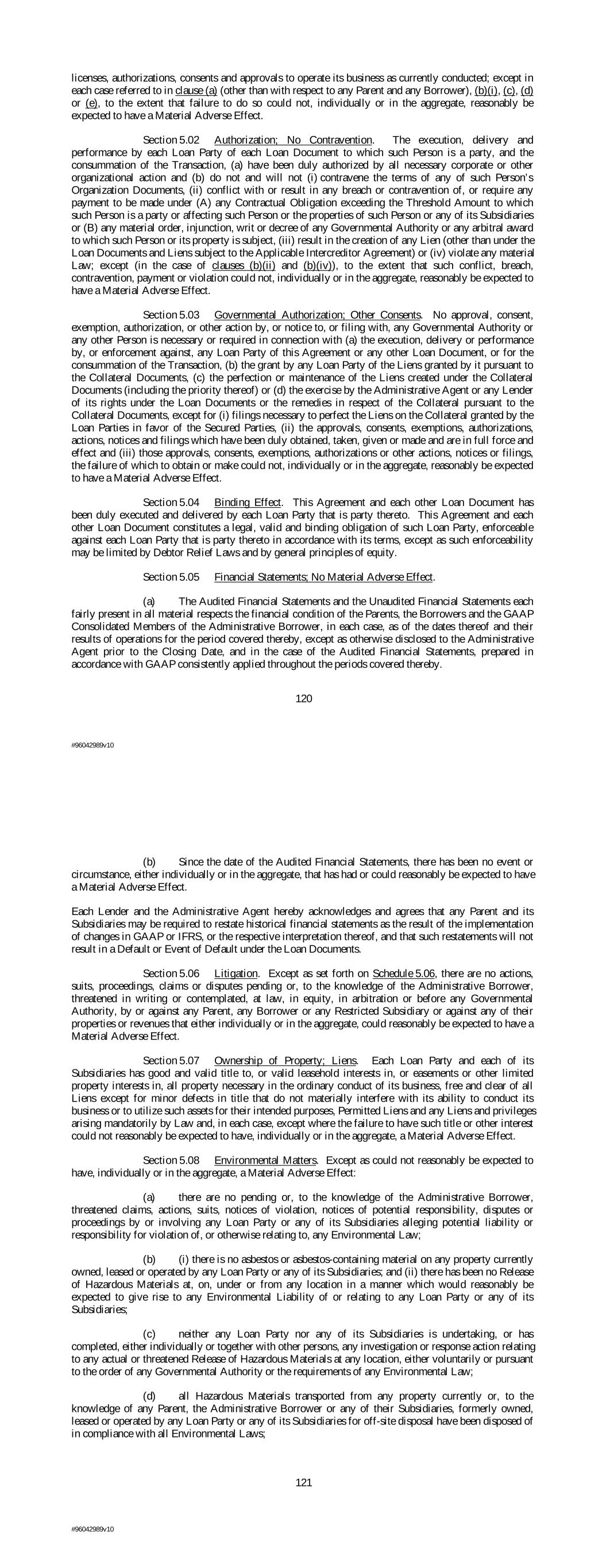 licenses, authorizations, consents and approvals to operate its business as currently conducted; except in each case referred to in clause (a) (other than with respect to any Parent and any Borrower), (b)(i), (c), (d) or (e), to the extent that failure to do so could not, individually or in the aggregate, reasonably be expected to have a Material Adverse Effect. Section 5.02 Authorization; No Contravention. The execution, delivery and performance by each Loan Party of each Loan Document to which such Person is a party, and the consummation of the Transaction, (a) have been duly authorized by all necessary corporate or other organizational action and (b) do not and will not (i) contravene the terms of any of such Person’s Organization Documents, (ii) conflict with or result in any breach or contravention of, or require any payment to be made under (A) any Contractual Obligation exceeding the Threshold Amount to which such Person is a party or affecting such Person or the properties of such Person or any of its Subsidiaries or (B) any material order, injunction, writ or decree of any Governmental Authority or any arbitral award to which such Person or its property is subject, (iii) result in the creation of any Lien (other than under the Loan Documents and Liens subject to the Applicable Intercreditor Agreement) or (iv) violate any material Law; except (in the case of clauses (b)(ii) and (b)(iv)), to the extent that such conflict, breach, contravention, payment or violation could not, individually or in the aggregate, reasonably be expected to have a Material Adverse Effect. Section 5.03 Governmental Authorization; Other Consents. No approval, consent, exemption, authorization, or other action by, or notice to, or filing with, any Governmental Authority or any other Person is necessary or required in connection with (a) the execution, delivery or performance by, or enforcement against, any Loan Party of this Agreement or any other Loan Document, or for the consummation of the Transaction, (b) the grant by any Loan Party of the Liens granted by it pursuant to the Collateral Documents, (c) the perfection or maintenance of the Liens created under the Collateral Documents (including the priority thereof) or (d) the exercise by the Administrative Agent or any Lender of its rights under the Loan Documents or the remedies in respect of the Collateral pursuant to the Collateral Documents, except for (i) filings necessary to perfect the Liens on the Collateral granted by the Loan Parties in favor of the Secured Parties, (ii) the approvals, consents, exemptions, authorizations, actions, notices and filings which have been duly obtained, taken, given or made and are in full force and effect and (iii) those approvals, consents, exemptions, authorizations or other actions, notices or filings, the failure of which to obtain or make could not, individually or in the aggregate, reasonably be expected to have a Material Adverse Effect. Section 5.04 Binding Effect. This Agreement and each other Loan Document has been duly executed and delivered by each Loan Party that is party thereto. This Agreement and each other Loan Document constitutes a legal, valid and binding obligation of such Loan Party, enforceable against each Loan Party that is party thereto in accordance with its terms, except as such enforceability may be limited by Debtor Relief Laws and by general principles of equity. Section 5.05 Financial Statements; No Material Adverse Effect. (a) The Audited Financial Statements and the Unaudited Financial Statements each fairly present in all material respects the financial condition of the Parents, the Borrowers and the GAAP Consolidated Members of the Administrative Borrower, in each case, as of the dates thereof and their results of operations for the period covered thereby, except as otherwise disclosed to the Administrative Agent prior to the Closing Date, and in the case of the Audited Financial Statements, prepared in accordance with GAAP consistently applied throughout the periods covered thereby. 120 #96042989v10 (b) Since the date of the Audited Financial Statements, there has been no event or circumstance, either individually or in the aggregate, that has had or could reasonably be expected to have a Material Adverse Effect. Each Lender and the Administrative Agent hereby acknowledges and agrees that any Parent and its Subsidiaries may be required to restate historical financial statements as the result of the implementation of changes in GAAP or IFRS, or the respective interpretation thereof, and that such restatements will not result in a Default or Event of Default under the Loan Documents. Section 5.06 Litigation. Except as set forth on Schedule 5.06, there are no actions, suits, proceedings, claims or disputes pending or, to the knowledge of the Administrative Borrower, threatened in writing or contemplated, at law, in equity, in arbitration or before any Governmental Authority, by or against any Parent, any Borrower or any Restricted Subsidiary or against any of their properties or revenues that either individually or in the aggregate, could reasonably be expected to have a Material Adverse Effect. Section 5.07 Ownership of Property; Liens. Each Loan Party and each of its Subsidiaries has good and valid title to, or valid leasehold interests in, or easements or other limited property interests in, all property necessary in the ordinary conduct of its business, free and clear of all Liens except for minor defects in title that do not materially interfere with its ability to conduct its business or to utilize such assets for their intended purposes, Permitted Liens and any Liens and privileges arising mandatorily by Law and, in each case, except where the failure to have such title or other interest could not reasonably be expected to have, individually or in the aggregate, a Material Adverse Effect. Section 5.08 Environmental Matters. Except as could not reasonably be expected to hav