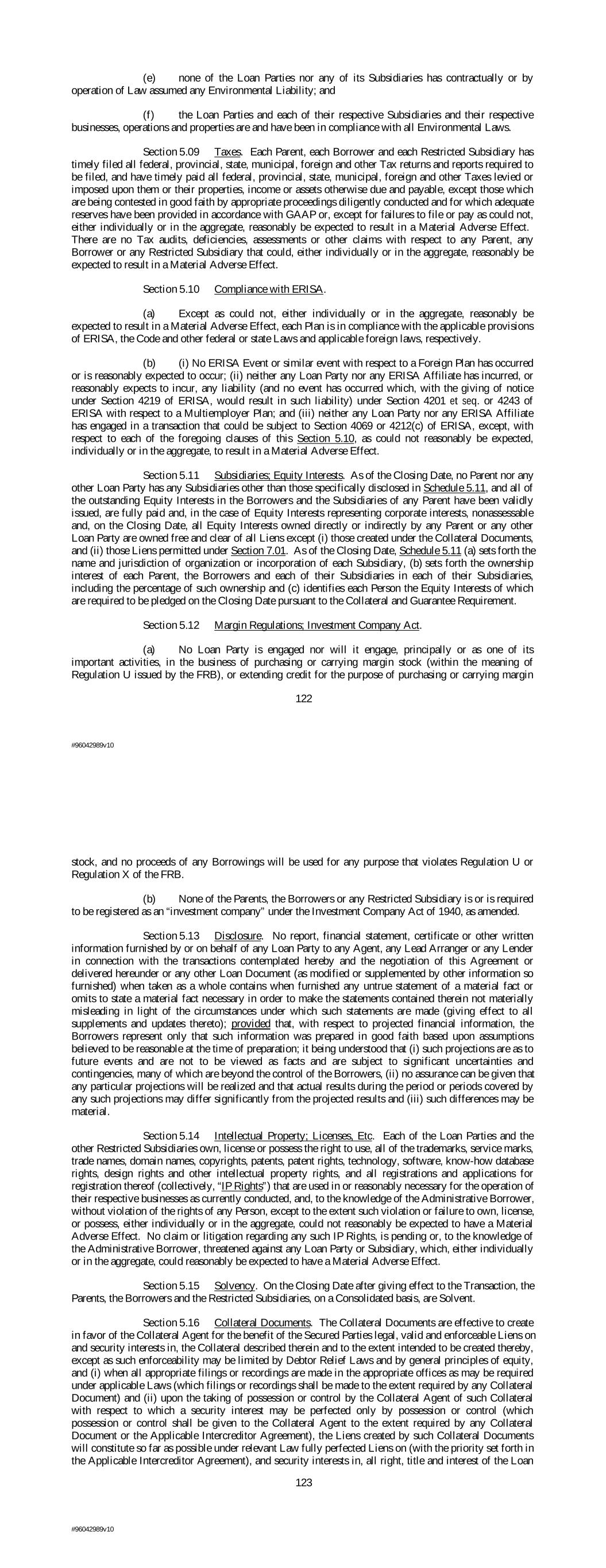 (e) none of the Loan Parties nor any of its Subsidiaries has contractually or by operation of Law assumed any Environmental Liability; and (f) the Loan Parties and each of their respective Subsidiaries and their respective businesses, operations and properties are and have been in compliance with all Environmental Laws. Section 5.09 Taxes. Each Parent, each Borrower and each Restricted Subsidiary has timely filed all federal, provincial, state, municipal, foreign and other Tax returns and reports required to be filed, and have timely paid all federal, provincial, state, municipal, foreign and other Taxes levied or imposed upon them or their properties, income or assets otherwise due and payable, except those which are being contested in good faith by appropriate proceedings diligently conducted and for which adequate reserves have been provided in accordance with GAAP or, except for failures to file or pay as could not, either individually or in the aggregate, reasonably be expected to result in a Material Adverse Effect. There are no Tax audits, deficiencies, assessments or other claims with respect to any Parent, any Borrower or any Restricted Subsidiary that could, either individually or in the aggregate, reasonably be expected to result in a Material Adverse Effect. Section 5.10 Compliance with ERISA. (a) Except as could not, either individually or in the aggregate, reasonably be expected to result in a Material Adverse Effect, each Plan is in compliance with the applicable provisions of ERISA, the Code and other federal or state Laws and applicable foreign laws, respectively. (b) (i) No ERISA Event or similar event with respect to a Foreign Plan has occurred or is reasonably expected to occur; (ii) neither any Loan Party nor any ERISA Affiliate has incurred, or reasonably expects to incur, any liability (and no event has occurred which, with the giving of notice under Section 4219 of ERISA, would result in such liability) under Section 4201 et seq. or 4243 of ERISA with respect to a Multiemployer Plan; and (iii) neither any Loan Party nor any ERISA Affiliate has engaged in a transaction that could be subject to Section 4069 or 4212(c) of ERISA, except, with respect to each of the foregoing clauses of this Section 5.10, as could not reasonably be expected, individually or in the aggregate, to result in a Material Adverse Effect. Section 5.11 Subsidiaries; Equity Interests. As of the Closing Date, no Parent nor any other Loan Party has any Subsidiaries other than those specifically disclosed in Schedule 5.11, and all of the outstanding Equity Interests in the Borrowers and the Subsidiaries of any Parent have been validly issued, are fully paid and, in the case of Equity Interests representing corporate interests, nonassessable and, on the Closing Date, all Equity Interests owned directly or indirectly by any Parent or any other Loan Party are owned free and clear of all Liens except (i) those created under the Collateral Documents, and (ii) those Liens permitted under Section 7.01. As of the Closing Date, Schedule 5.11 (a) sets forth the name and jurisdiction of organization or incorporation of each Subsidiary, (b) sets forth the ownership interest of each Parent, the Borrowers and each of their Subsidiaries in each of their Subsidiaries, including the percentage of such ownership and (c) identifies each Person the Equity Interests of which are required to be pledged on the Closing Date pursuant to the Collateral and Guarantee Requirement. Section 5.12 Margin Regulations; Investment Company Act. (a) No Loan Party is engaged nor will it engage, principally or as one of its important activities, in the business of purchasing or carrying margin stock (within the meaning of Regulation U issued by the FRB), or extending credit for the purpose of purchasing or carrying margin 122 #96042989v10 stock, and no proceeds of any Borrowings will be used for any purpose that violates Regulation U or Regulation X of the FRB. (b) None of the Parents, the Borrowers or any Restricted Subsidiary is or is required to be registered as an “investment company” under the Investment Company Act of 1940, as amended. Section 5.13 Disclosure. No report, financial statement, certificate or other written information furnished by or on behalf of any Loan Party to any Agent, any Lead Arranger or any Lender in connection with the transactions contemplated hereby and the negotiation of this Agreement or delivered hereunder or any other Loan Document (as modified or supplemented by other information so furnished) when taken as a whole contains when furnished any untrue statement of a material fact or omits to state a material fact necessary in order to make the statements contained therein not materially misleading in light of the circumstances under which such statements are made (giving effect to all supplements and updates thereto); provided that, with respect to projected financial information, the Borrowers represent only that such information was prepared in good faith based upon assumptions believed to be reasonable at the time of preparation; it being understood that (i) such projections are as to future events and are not to be viewed as facts and are subject to significant uncertainties and contingencies, many of which are beyond the control of the Borrowers, (ii) no assurance can be given that any particular projections will be realized and that actual results during the period or periods covered by any such projections may differ significantly from the projected results and (iii) such differences may be material. Section 5.14 Intellectual Property; Licenses, Etc. Each of the Loan Parties and the other Restricted Subsidiaries own, license or possess the right to use, all of the trademarks, service marks, trade names, domain names, copyrights, patents, patent rights, technology, software, know-how database rights, design rights and other intellectual property rights, and all registrations and applications 