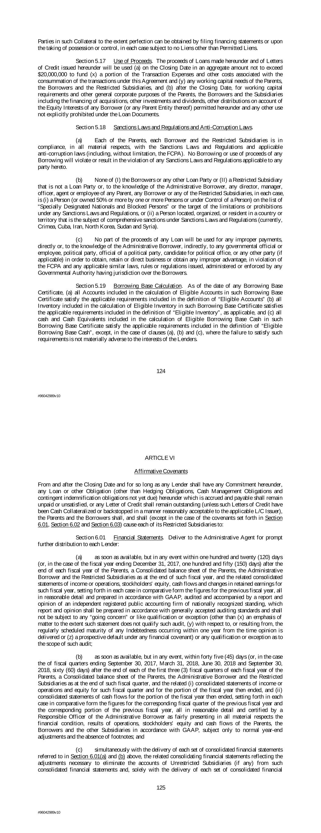 Parties in such Collateral to the extent perfection can be obtained by filing financing statements or upon the taking of possession or control, in each case subject to no Liens other than Permitted Liens. Section 5.17 Use of Proceeds. The proceeds of Loans made hereunder and of Letters of Credit issued hereunder will be used (a) on the Closing Date in an aggregate amount not to exceed $20,000,000 to fund (x) a portion of the Transaction Expenses and other costs associated with the consummation of the transactions under this Agreement and (y) any working capital needs of the Parents, the Borrowers and the Restricted Subsidiaries, and (b) after the Closing Date, for working capital requirements and other general corporate purposes of the Parents, the Borrowers and the Subsidiaries including the financing of acquisitions, other investments and dividends, other distributions on account of the Equity Interests of any Borrower (or any Parent Entity thereof) permitted hereunder and any other use not explicitly prohibited under the Loan Documents. Section 5.18 Sanctions Laws and Regulations and Anti-Corruption Laws. (a) Each of the Parents, each Borrower and the Restricted Subsidiaries is in compliance, in all material respects, with the Sanctions Laws and Regulations and applicable anti-corruption laws (including, without limitation, the FCPA). No Borrowing or use of proceeds of any Borrowing will violate or result in the violation of any Sanctions Laws and Regulations applicable to any party hereto. (b) None of (I) the Borrowers or any other Loan Party or (II) a Restricted Subsidiary that is not a Loan Party or, to the knowledge of the Administrative Borrower, any director, manager, officer, agent or employee of any Parent, any Borrower or any of the Restricted Subsidiaries, in each case, is (i) a Person (or owned 50% or more by one or more Persons or under Control of a Person) on the list of “Specially Designated Nationals and Blocked Persons” or the target of the limitations or prohibitions under any Sanctions Laws and Regulations, or (ii) a Person located, organized, or resident in a country or territory that is the subject of comprehensive sanctions under Sanctions Laws and Regulations (currently, Crimea, Cuba, Iran, North Korea, Sudan and Syria). (c) No part of the proceeds of any Loan will be used for any improper payments, directly or, to the knowledge of the Administrative Borrower, indirectly, to any governmental official or employee, political party, official of a political party, candidate for political office, or any other party (if applicable) in order to obtain, retain or direct business or obtain any improper advantage, in violation of the FCPA and any applicable similar laws, rules or regulations issued, administered or enforced by any Governmental Authority having jurisdiction over the Borrowers. Section 5.19 Borrowing Base Calculation. As of the date of any Borrowing Base Certificate, (a) all Accounts included in the calculation of Eligible Accounts in such Borrowing Base Certificate satisfy the applicable requirements included in the definition of “Eligible Accounts” (b) all Inventory included in the calculation of Eligible Inventory in such Borrowing Base Certificate satisfies the applicable requirements included in the definition of “Eligible Inventory”, as applicable, and (c) all cash and Cash Equivalents included in the calculation of Eligible Borrowing Base Cash in such Borrowing Base Certificate satisfy the applicable requirements included in the definition of “Eligible Borrowing Base Cash”, except, in the case of clauses (a), (b) and (c), where the failure to satisfy such requirements is not materially adverse to the interests of the Lenders. 124 #96042989v10 ARTICLE VI Affirmative Covenants From and after the Closing Date and for so long as any Lender shall have any Commitment hereunder, any Loan or other Obligation (other than Hedging Obligations, Cash Management Obligations and contingent indemnification obligations not yet due) hereunder which is accrued and payable shall remain unpaid or unsatisfied, or any Letter of Credit shall remain outstanding (unless such Letters of Credit have been Cash Collateralized or backstopped in a manner reasonably acceptable to the applicable L/C Issuer), the Parents and the Borrowers shall, and shall (except in the case of the covenants set forth in Section 6.01, Section 6.02 and Section 6.03) cause each of its Restricted Subsidiaries to: Section 6.01 Financial Statements. Deliver to the Administrative Agent for prompt further distribution to each Lender: (a) as soon as available, but in any event within one hundred and twenty (120) days (or, in the case of the fiscal year ending December 31, 2017, one hundred and fifty (150) days) after the end of each fiscal year of the Parents, a Consolidated balance sheet of the Parents, the Administrative Borrower and the Restricted Subsidiaries as at the end of such fiscal year, and the related consolidated statements of income or operations, stockholders’ equity, cash flows and changes in retained earnings for such fiscal year, setting forth in each case in comparative form the figures for the previous fiscal year, all in reasonable detail and prepared in accordance with GAAP, audited and accompanied by a report and opinion of an independent registered public accounting firm of nationally recognized standing, which report and opinion shall be prepared in accordance with generally accepted auditing standards and shall not be subject to any “going concern” or like qualification or exception (other than (x) an emphasis of matter to the extent such statement does not qualify such audit, (y) with respect to, or resulting from, the regularly scheduled maturity of any Indebtedness occurring within one year from the time opinion is delivered or (z) a prospective default under any financial covenant) or any qualification or exception as to the scope of such audit; (b) as soon a