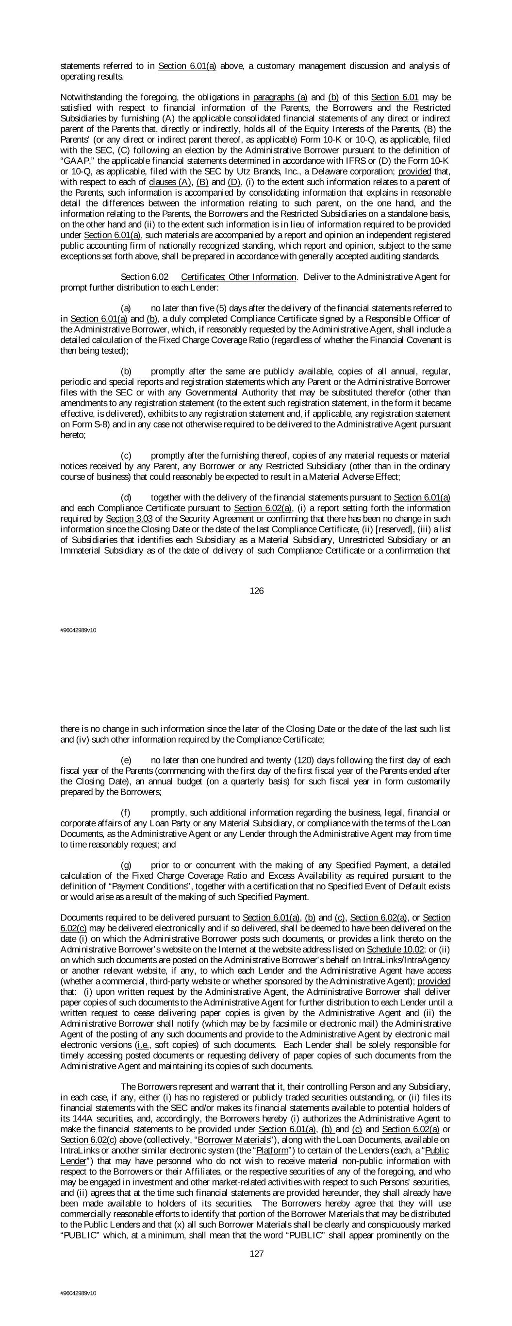 statements referred to in Section 6.01(a) above, a customary management discussion and analysis of operating results. Notwithstanding the foregoing, the obligations in paragraphs (a) and (b) of this Section 6.01 may be satisfied with respect to financial information of the Parents, the Borrowers and the Restricted Subsidiaries by furnishing (A) the applicable consolidated financial statements of any direct or indirect parent of the Parents that, directly or indirectly, holds all of the Equity Interests of the Parents, (B) the Parents’ (or any direct or indirect parent thereof, as applicable) Form 10-K or 10-Q, as applicable, filed with the SEC, (C) following an election by the Administrative Borrower pursuant to the definition of “GAAP,” the applicable financial statements determined in accordance with IFRS or (D) the Form 10-K or 10-Q, as applicable, filed with the SEC by Utz Brands, Inc., a Delaware corporation; provided that, with respect to each of clauses (A), (B) and (D), (i) to the extent such information relates to a parent of the Parents, such information is accompanied by consolidating information that explains in reasonable detail the differences between the information relating to such parent, on the one hand, and the information relating to the Parents, the Borrowers and the Restricted Subsidiaries on a standalone basis, on the other hand and (ii) to the extent such information is in lieu of information required to be provided under Section 6.01(a), such materials are accompanied by a report and opinion an independent registered public accounting firm of nationally recognized standing, which report and opinion, subject to the same exceptions set forth above, shall be prepared in accordance with generally accepted auditing standards. Section 6.02 Certificates; Other Information. Deliver to the Administrative Agent for prompt further distribution to each Lender: (a) no later than five (5) days after the delivery of the financial statements referred to in Section 6.01(a) and (b), a duly completed Compliance Certificate signed by a Responsible Officer of the Administrative Borrower, which, if reasonably requested by the Administrative Agent, shall include a detailed calculation of the Fixed Charge Coverage Ratio (regardless of whether the Financial Covenant is then being tested); (b) promptly after the same are publicly available, copies of all annual, regular, periodic and special reports and registration statements which any Parent or the Administrative Borrower files with the SEC or with any Governmental Authority that may be substituted therefor (other than amendments to any registration statement (to the extent such registration statement, in the form it became effective, is delivered), exhibits to any registration statement and, if applicable, any registration statement on Form S-8) and in any case not otherwise required to be delivered to the Administrative Agent pursuant hereto; (c) promptly after the furnishing thereof, copies of any material requests or material notices received by any Parent, any Borrower or any Restricted Subsidiary (other than in the ordinary course of business) that could reasonably be expected to result in a Material Adverse Effect; (d) together with the delivery of the financial statements pursuant to Section 6.01(a) and each Compliance Certificate pursuant to Section 6.02(a), (i) a report setting forth the information required by Section 3.03 of the Security Agreement or confirming that there has been no change in such information since the Closing Date or the date of the last Compliance Certificate, (ii) [reserved], (iii) a list of Subsidiaries that identifies each Subsidiary as a Material Subsidiary, Unrestricted Subsidiary or an Immaterial Subsidiary as of the date of delivery of such Compliance Certificate or a confirmation that 126 #96042989v10 there is no change in such information since the later of the Closing Date or the date of the last such list and (iv) such other information required by the Compliance Certificate; (e) no later than one hundred and twenty (120) days following the first day of each fiscal year of the Parents (commencing with the first day of the first fiscal year of the Parents ended after the Closing Date), an annual budget (on a quarterly basis) for such fiscal year in form customarily prepared by the Borrowers; (f) promptly, such additional information regarding the business, legal, financial or corporate affairs of any Loan Party or any Material Subsidiary, or compliance with the terms of the Loan Documents, as the Administrative Agent or any Lender through the Administrative Agent may from time to time reasonably request; and (g) prior to or concurrent with the making of any Specified Payment, a detailed calculation of the Fixed Charge Coverage Ratio and Excess Availability as required pursuant to the definition of “Payment Conditions”, together with a certification that no Specified Event of Default exists or would arise as a result of the making of such Specified Payment. Documents required to be delivered pursuant to Section 6.01(a), (b) and (c), Section 6.02(a), or Section 6.02(c) may be delivered electronically and if so delivered, shall be deemed to have been delivered on the date (i) on which the Administrative Borrower posts such documents, or provides a link thereto on the Administrative Borrower’s website on the Internet at the website address listed on Schedule 10.02; or (ii) on which such documents are posted on the Administrative Borrower’s behalf on IntraLinks/IntraAgency or another relevant website, if any, to which each Lender and the Administrative Agent have access (whether a commercial, third-party website or whether sponsored by the Administrative Agent); provided that: (i) upon written request by the Administrative Agent, the Administrative Borrower shall deliver paper copies of such documents to the Administrative Agent for further distribution to each Lender until a written re