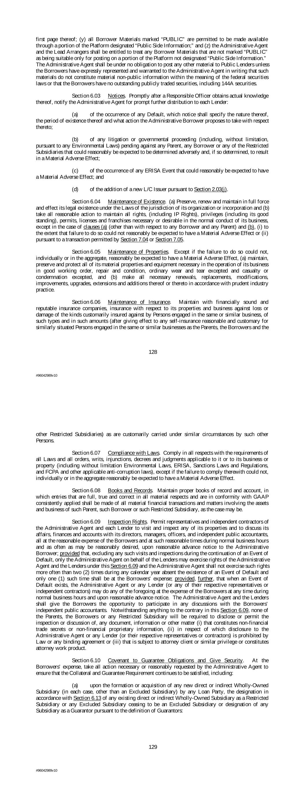 first page thereof; (y) all Borrower Materials marked “PUBLIC” are permitted to be made available through a portion of the Platform designated “Public Side Information;” and (z) the Administrative Agent and the Lead Arrangers shall be entitled to treat any Borrower Materials that are not marked “PUBLIC” as being suitable only for posting on a portion of the Platform not designated “Public Side Information.” The Administrative Agent shall be under no obligation to post any other material to Public Lenders unless the Borrowers have expressly represented and warranted to the Administrative Agent in writing that such materials do not constitute material non-public information within the meaning of the federal securities laws or that the Borrowers have no outstanding publicly traded securities, including 144A securities. Section 6.03 Notices. Promptly after a Responsible Officer obtains actual knowledge thereof, notify the Administrative Agent for prompt further distribution to each Lender: (a) of the occurrence of any Default, which notice shall specify the nature thereof, the period of existence thereof and what action the Administrative Borrower proposes to take with respect thereto; (b) of any litigation or governmental proceeding (including, without limitation, pursuant to any Environmental Laws) pending against any Parent, any Borrower or any of the Restricted Subsidiaries that could reasonably be expected to be determined adversely and, if so determined, to result in a Material Adverse Effect; (c) of the occurrence of any ERISA Event that could reasonably be expected to have a Material Adverse Effect; and (d) of the addition of a new L/C Issuer pursuant to Section 2.03(j). Section 6.04 Maintenance of Existence. (a) Preserve, renew and maintain in full force and effect its legal existence under the Laws of the jurisdiction of its organization or incorporation and (b) take all reasonable action to maintain all rights, (including IP Rights), privileges (including its good standing), permits, licenses and franchises necessary or desirable in the normal conduct of its business, except in the case of clauses (a) (other than with respect to any Borrower and any Parent) and (b), (i) to the extent that failure to do so could not reasonably be expected to have a Material Adverse Effect or (ii) pursuant to a transaction permitted by Section 7.04 or Section 7.05. Section 6.05 Maintenance of Properties. Except if the failure to do so could not, individually or in the aggregate, reasonably be expected to have a Material Adverse Effect, (a) maintain, preserve and protect all of its material properties and equipment necessary in the operation of its business in good working order, repair and condition, ordinary wear and tear excepted and casualty or condemnation excepted, and (b) make all necessary renewals, replacements, modifications, improvements, upgrades, extensions and additions thereof or thereto in accordance with prudent industry practice. Section 6.06 Maintenance of Insurance. Maintain with financially sound and reputable insurance companies, insurance with respect to its properties and business against loss or damage of the kinds customarily insured against by Persons engaged in the same or similar business, of such types and in such amounts (after giving effect to any self-insurance reasonable and customary for similarly situated Persons engaged in the same or similar businesses as the Parents, the Borrowers and the 128 #96042989v10 other Restricted Subsidiaries) as are customarily carried under similar circumstances by such other Persons. Section 6.07 Compliance with Laws. Comply in all respects with the requirements of all Laws and all orders, writs, injunctions, decrees and judgments applicable to it or to its business or property (including without limitation Environmental Laws, ERISA, Sanctions Laws and Regulations, and FCPA and other applicable anti-corruption laws), except if the failure to comply therewith could not, individually or in the aggregate reasonably be expected to have a Material Adverse Effect. Section 6.08 Books and Records. Maintain proper books of record and account, in which entries that are full, true and correct in all material respects and are in conformity with GAAP consistently applied shall be made of all material financial transactions and matters involving the assets and business of such Parent, such Borrower or such Restricted Subsidiary, as the case may be. Section 6.09 Inspection Rights. Permit representatives and independent contractors of the Administrative Agent and each Lender to visit and inspect any of its properties and to discuss its affairs, finances and accounts with its directors, managers, officers, and independent public accountants, all at the reasonable expense of the Borrowers and at such reasonable times during normal business hours and as often as may be reasonably desired, upon reasonable advance notice to the Administrative Borrower; provided that, excluding any such visits and inspections during the continuation of an Event of Default, only the Administrative Agent on behalf of the Lenders may exercise rights of the Administrative Agent and the Lenders under this Section 6.09 and the Administrative Agent shall not exercise such rights more often than two (2) times during any calendar year absent the existence of an Event of Default and only one (1) such time shall be at the Borrowers’ expense; provided, further, that when an Event of Default exists, the Administrative Agent or any Lender (or any of their respective representatives or independent contractors) may do any of the foregoing at the expense of the Borrowers at any time during normal business hours and upon reasonable advance notice. The Administrative Agent and the Lenders shall give the Borrowers the opportunity to participate in any discussions with the Borrowers’ independent public accountants. Notwithstanding anything to the contrary in this Section 6