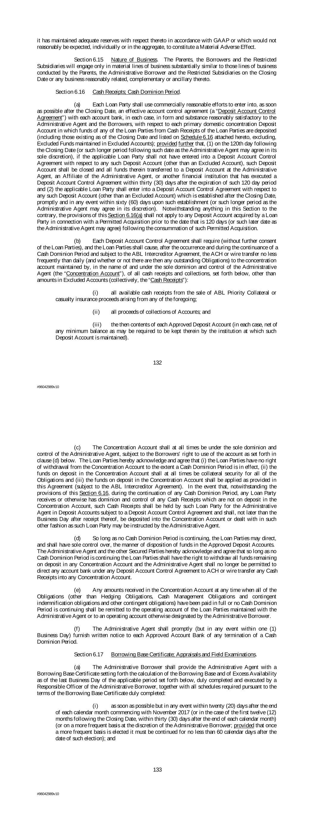 it has maintained adequate reserves with respect thereto in accordance with GAAP or which would not reasonably be expected, individually or in the aggregate, to constitute a Material Adverse Effect. Section 6.15 Nature of Business. The Parents, the Borrowers and the Restricted Subsidiaries will engage only in material lines of business substantially similar to those lines of business conducted by the Parents, the Administrative Borrower and the Restricted Subsidiaries on the Closing Date or any business reasonably related, complementary or ancillary thereto. Section 6.16 Cash Receipts; Cash Dominion Period. (a) Each Loan Party shall use commercially reasonable efforts to enter into, as soon as possible after the Closing Date, an effective account control agreement (a “Deposit Account Control Agreement”) with each account bank, in each case, in form and substance reasonably satisfactory to the Administrative Agent and the Borrowers, with respect to each primary domestic concentration Deposit Account in which funds of any of the Loan Parties from Cash Receipts of the Loan Parties are deposited (including those existing as of the Closing Date and listed on Schedule 6.16 attached hereto, excluding, Excluded Funds maintained in Excluded Accounts); provided further that, (1) on the 120th day following the Closing Date (or such longer period following such date as the Administrative Agent may agree in its sole discretion), if the applicable Loan Party shall not have entered into a Deposit Account Control Agreement with respect to any such Deposit Account (other than an Excluded Account), such Deposit Account shall be closed and all funds therein transferred to a Deposit Account at the Administrative Agent, an Affiliate of the Administrative Agent, or another financial institution that has executed a Deposit Account Control Agreement within thirty (30) days after the expiration of such 120 day period and (2) the applicable Loan Party shall enter into a Deposit Account Control Agreement with respect to any such Deposit Account (other than an Excluded Account) which is established after the Closing Date, promptly and in any event within sixty (60) days upon such establishment (or such longer period as the Administrative Agent may agree in its discretion). Notwithstanding anything in this Section to the contrary, the provisions of this Section 6.16(a) shall not apply to any Deposit Account acquired by a Loan Party in connection with a Permitted Acquisition prior to the date that is 120 days (or such later date as the Administrative Agent may agree) following the consummation of such Permitted Acquisition. (b) Each Deposit Account Control Agreement shall require (without further consent of the Loan Parties), and the Loan Parties shall cause, after the occurrence and during the continuance of a Cash Dominion Period and subject to the ABL Intercreditor Agreement, the ACH or wire transfer no less frequently than daily (and whether or not there are then any outstanding Obligations) to the concentration account maintained by, in the name of and under the sole dominion and control of the Administrative Agent (the “Concentration Account”), of all cash receipts and collections, set forth below, other than amounts in Excluded Accounts (collectively, the “Cash Receipts”): (i) all available cash receipts from the sale of ABL Priority Collateral or casualty insurance proceeds arising from any of the foregoing; (ii) all proceeds of collections of Accounts; and (iii) the then contents of each Approved Deposit Account (in each case, net of any minimum balance as may be required to be kept therein by the institution at which such Deposit Account is maintained). 132 #96042989v10 (c) The Concentration Account shall at all times be under the sole dominion and control of the Administrative Agent, subject to the Borrowers’ right to use of the account as set forth in clause (d) below. The Loan Parties hereby acknowledge and agree that (i) the Loan Parties have no right of withdrawal from the Concentration Account to the extent a Cash Dominion Period is in effect, (ii) the funds on deposit in the Concentration Account shall at all times be collateral security for all of the Obligations and (iii) the funds on deposit in the Concentration Account shall be applied as provided in this Agreement (subject to the ABL Intercreditor Agreement). In the event that, notwithstanding the provisions of this Section 6.16, during the continuation of any Cash Dominion Period, any Loan Party receives or otherwise has dominion and control of any Cash Receipts which are not on deposit in the Concentration Account, such Cash Receipts shall be held by such Loan Party for the Administrative Agent in Deposit Accounts subject to a Deposit Account Control Agreement and shall, not later than the Business Day after receipt thereof, be deposited into the Concentration Account or dealt with in such other fashion as such Loan Party may be instructed by the Administrative Agent. (d) So long as no Cash Dominion Period is continuing, the Loan Parties may direct, and shall have sole control over, the manner of disposition of funds in the Approved Deposit Accounts. The Administrative Agent and the other Secured Parties hereby acknowledge and agree that so long as no Cash Dominion Period is continuing the Loan Parties shall have the right to withdraw all funds remaining on deposit in any Concentration Account and the Administrative Agent shall no longer be permitted to direct any account bank under any Deposit Account Control Agreement to ACH or wire transfer any Cash Receipts into any Concentration Account. (e) Any amounts received in the Concentration Account at any time when all of the Obligations (other than Hedging Obligations, Cash Management Obligations and contingent indemnification obligations and other contingent obligations) have been paid in full or no Cash Dominion Period is continuing shall be remitted to the operating account of t