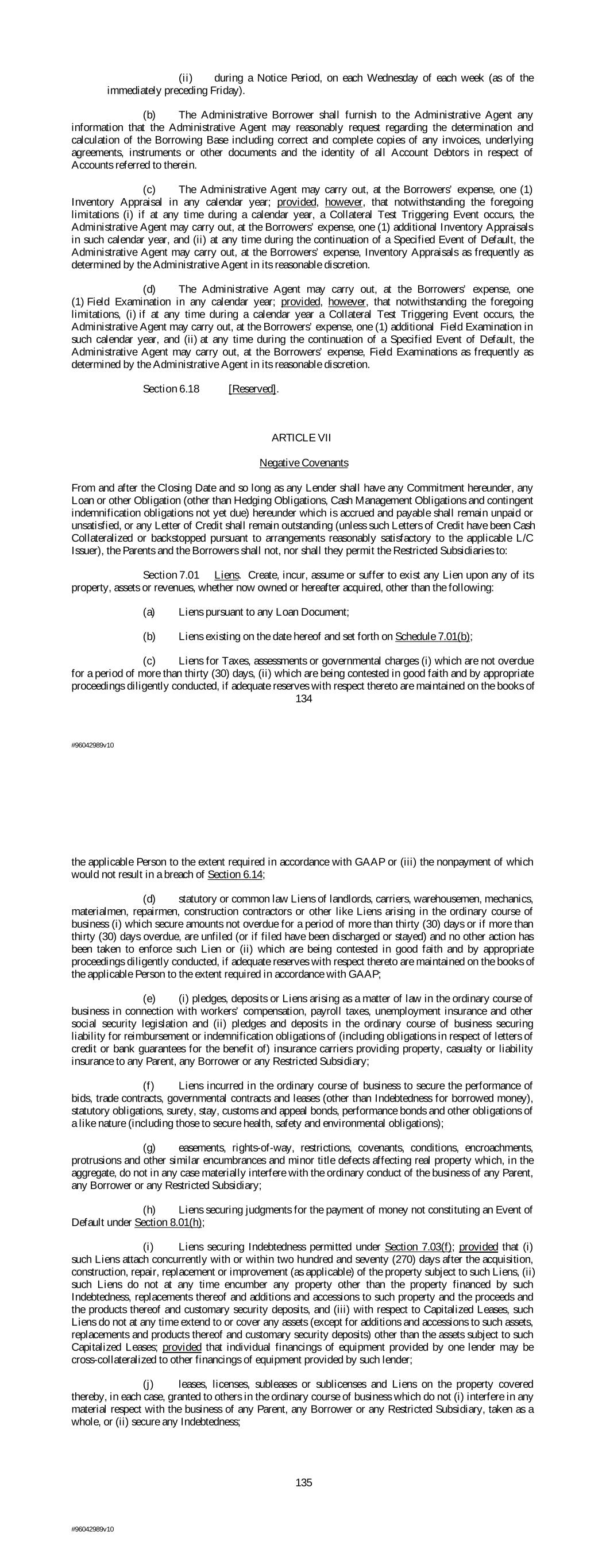 (ii) during a Notice Period, on each Wednesday of each week (as of the immediately preceding Friday). (b) The Administrative Borrower shall furnish to the Administrative Agent any information that the Administrative Agent may reasonably request regarding the determination and calculation of the Borrowing Base including correct and complete copies of any invoices, underlying agreements, instruments or other documents and the identity of all Account Debtors in respect of Accounts referred to therein. (c) The Administrative Agent may carry out, at the Borrowers’ expense, one (1) Inventory Appraisal in any calendar year; provided, however, that notwithstanding the foregoing limitations (i) if at any time during a calendar year, a Collateral Test Triggering Event occurs, the Administrative Agent may carry out, at the Borrowers’ expense, one (1) additional Inventory Appraisals in such calendar year, and (ii) at any time during the continuation of a Specified Event of Default, the Administrative Agent may carry out, at the Borrowers’ expense, Inventory Appraisals as frequently as determined by the Administrative Agent in its reasonable discretion. (d) The Administrative Agent may carry out, at the Borrowers’ expense, one (1) Field Examination in any calendar year; provided, however, that notwithstanding the foregoing limitations, (i) if at any time during a calendar year a Collateral Test Triggering Event occurs, the Administrative Agent may carry out, at the Borrowers’ expense, one (1) additional Field Examination in such calendar year, and (ii) at any time during the continuation of a Specified Event of Default, the Administrative Agent may carry out, at the Borrowers’ expense, Field Examinations as frequently as determined by the Administrative Agent in its reasonable discretion. Section 6.18 [Reserved]. ARTICLE VII Negative Covenants From and after the Closing Date and so long as any Lender shall have any Commitment hereunder, any Loan or other Obligation (other than Hedging Obligations, Cash Management Obligations and contingent indemnification obligations not yet due) hereunder which is accrued and payable shall remain unpaid or unsatisfied, or any Letter of Credit shall remain outstanding (unless such Letters of Credit have been Cash Collateralized or backstopped pursuant to arrangements reasonably satisfactory to the applicable L/C Issuer), the Parents and the Borrowers shall not, nor shall they permit the Restricted Subsidiaries to: Section 7.01 Liens. Create, incur, assume or suffer to exist any Lien upon any of its property, assets or revenues, whether now owned or hereafter acquired, other than the following: (a) Liens pursuant to any Loan Document; (b) Liens existing on the date hereof and set forth on Schedule 7.01(b); (c) Liens for Taxes, assessments or governmental charges (i) which are not overdue for a period of more than thirty (30) days, (ii) which are being contested in good faith and by appropriate proceedings diligently conducted, if adequate reserves with respect thereto are maintained on the books of 134 #96042989v10 the applicable Person to the extent required in accordance with GAAP or (iii) the nonpayment of which would not result in a breach of Section 6.14; (d) statutory or common law Liens of landlords, carriers, warehousemen, mechanics, materialmen, repairmen, construction contractors or other like Liens arising in the ordinary course of business (i) which secure amounts not overdue for a period of more than thirty (30) days or if more than thirty (30) days overdue, are unfiled (or if filed have been discharged or stayed) and no other action has been taken to enforce such Lien or (ii) which are being contested in good faith and by appropriate proceedings diligently conducted, if adequate reserves with respect thereto are maintained on the books of the applicable Person to the extent required in accordance with GAAP; (e) (i) pledges, deposits or Liens arising as a matter of law in the ordinary course of business in connection with workers’ compensation, payroll taxes, unemployment insurance and other social security legislation and (ii) pledges and deposits in the ordinary course of business securing liability for reimbursement or indemnification obligations of (including obligations in respect of letters of credit or bank guarantees for the benefit of) insurance carriers providing property, casualty or liability insurance to any Parent, any Borrower or any Restricted Subsidiary; (f) Liens incurred in the ordinary course of business to secure the performance of bids, trade contracts, governmental contracts and leases (other than Indebtedness for borrowed money), statutory obligations, surety, stay, customs and appeal bonds, performance bonds and other obligations of a like nature (including those to secure health, safety and environmental obligations); (g) easements, rights-of-way, restrictions, covenants, conditions, encroachments, protrusions and other similar encumbrances and minor title defects affecting real property which, in the aggregate, do not in any case materially interfere with the ordinary conduct of the business of any Parent, any Borrower or any Restricted Subsidiary; (h) Liens securing judgments for the payment of money not constituting an Event of Default under Section 8.01(h); (i) Liens securing Indebtedness permitted under Section 7.03(f); provided that (i) such Liens attach concurrently with or within two hundred and seventy (270) days after the acquisition, construction, repair, replacement or improvement (as applicable) of the property subject to such Liens, (ii) such Liens do not at any time encumber any property other than the property financed by such Indebtedness, replacements thereof and additions and accessions to such property and the proceeds and the products thereof and customary security deposits, and (iii) with respect to Capitalized Leases, such Liens do not at any time extend to or cover any assets (except for addi