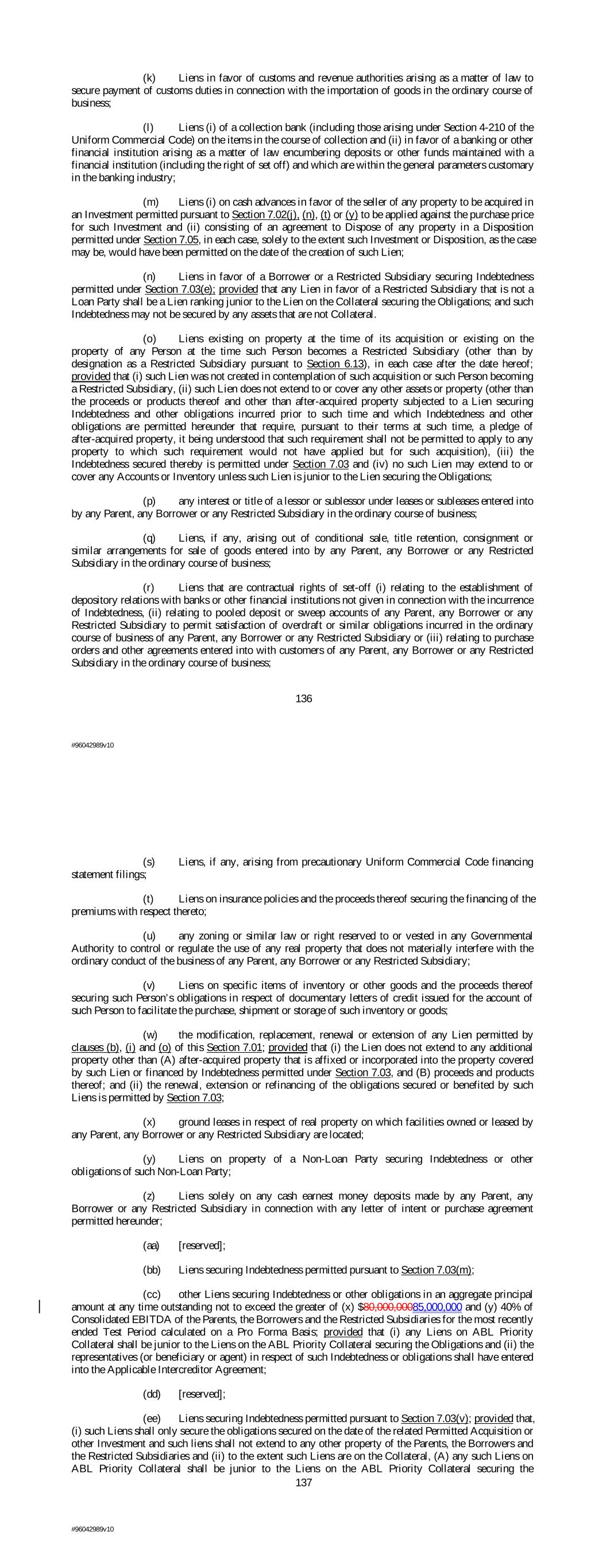 (k) Liens in favor of customs and revenue authorities arising as a matter of law to secure payment of customs duties in connection with the importation of goods in the ordinary course of business; (l) Liens (i) of a collection bank (including those arising under Section 4-210 of the Uniform Commercial Code) on the items in the course of collection and (ii) in favor of a banking or other financial institution arising as a matter of law encumbering deposits or other funds maintained with a financial institution (including the right of set off) and which are within the general parameters customary in the banking industry; (m) Liens (i) on cash advances in favor of the seller of any property to be acquired in an Investment permitted pursuant to Section 7.02(j), (n), (t) or (y) to be applied against the purchase price for such Investment and (ii) consisting of an agreement to Dispose of any property in a Disposition permitted under Section 7.05, in each case, solely to the extent such Investment or Disposition, as the case may be, would have been permitted on the date of the creation of such Lien; (n) Liens in favor of a Borrower or a Restricted Subsidiary securing Indebtedness permitted under Section 7.03(e); provided that any Lien in favor of a Restricted Subsidiary that is not a Loan Party shall be a Lien ranking junior to the Lien on the Collateral securing the Obligations; and such Indebtedness may not be secured by any assets that are not Collateral. (o) Liens existing on property at the time of its acquisition or existing on the property of any Person at the time such Person becomes a Restricted Subsidiary (other than by designation as a Restricted Subsidiary pursuant to Section 6.13), in each case after the date hereof; provided that (i) such Lien was not created in contemplation of such acquisition or such Person becoming a Restricted Subsidiary, (ii) such Lien does not extend to or cover any other assets or property (other than the proceeds or products thereof and other than after-acquired property subjected to a Lien securing Indebtedness and other obligations incurred prior to such time and which Indebtedness and other obligations are permitted hereunder that require, pursuant to their terms at such time, a pledge of after-acquired property, it being understood that such requirement shall not be permitted to apply to any property to which such requirement would not have applied but for such acquisition), (iii) the Indebtedness secured thereby is permitted under Section 7.03 and (iv) no such Lien may extend to or cover any Accounts or Inventory unless such Lien is junior to the Lien securing the Obligations; (p) any interest or title of a lessor or sublessor under leases or subleases entered into by any Parent, any Borrower or any Restricted Subsidiary in the ordinary course of business; (q) Liens, if any, arising out of conditional sale, title retention, consignment or similar arrangements for sale of goods entered into by any Parent, any Borrower or any Restricted Subsidiary in the ordinary course of business; (r) Liens that are contractual rights of set-off (i) relating to the establishment of depository relations with banks or other financial institutions not given in connection with the incurrence of Indebtedness, (ii) relating to pooled deposit or sweep accounts of any Parent, any Borrower or any Restricted Subsidiary to permit satisfaction of overdraft or similar obligations incurred in the ordinary course of business of any Parent, any Borrower or any Restricted Subsidiary or (iii) relating to purchase orders and other agreements entered into with customers of any Parent, any Borrower or any Restricted Subsidiary in the ordinary course of business; 136 #96042989v10 (s) Liens, if any, arising from precautionary Uniform Commercial Code financing statement filings; (t) Liens on insurance policies and the proceeds thereof securing the financing of the premiums with respect thereto; (u) any zoning or similar law or right reserved to or vested in any Governmental Authority to control or regulate the use of any real property that does not materially interfere with the ordinary conduct of the business of any Parent, any Borrower or any Restricted Subsidiary; (v) Liens on specific items of inventory or other goods and the proceeds thereof securing such Person’s obligations in respect of documentary letters of credit issued for the account of such Person to facilitate the purchase, shipment or storage of such inventory or goods; (w) the modification, replacement, renewal or extension of any Lien permitted by clauses (b), (i) and (o) of this Section 7.01; provided that (i) the Lien does not extend to any additional property other than (A) after-acquired property that is affixed or incorporated into the property covered by such Lien or financed by Indebtedness permitted under Section 7.03, and (B) proceeds and products thereof; and (ii) the renewal, extension or refinancing of the obligations secured or benefited by such Liens is permitted by Section 7.03; (x) ground leases in respect of real property on which facilities owned or leased by any Parent, any Borrower or any Restricted Subsidiary are located; (y) Liens on property of a Non-Loan Party securing Indebtedness or other obligations of such Non-Loan Party; (z) Liens solely on any cash earnest money deposits made by any Parent, any Borrower or any Restricted Subsidiary in connection with any letter of intent or purchase agreement permitted hereunder; (aa) [reserved]; (bb) Liens securing Indebtedness permitted pursuant to Section 7.03(m); (cc) other Liens securing Indebtedness or other obligations in an aggregate principal amount at any time outstanding not to exceed the greater of (x) $80,000,00085,000,000 and (y) 40% of Consolidated EBITDA of the Parents, the Borrowers and the Restricted Subsidiaries for the most recently ended Test Period calculated on a Pro Forma Basis; provided that (i) any Liens on ABL Priority Collateral s