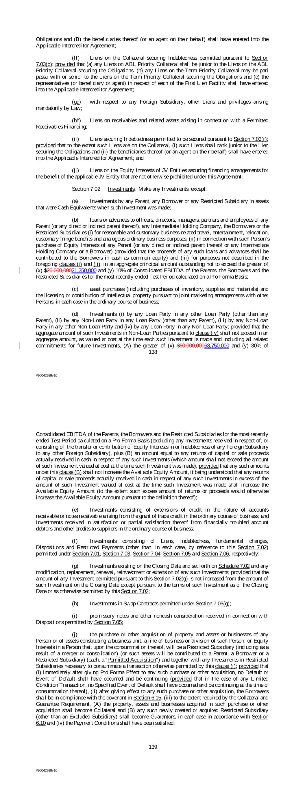 Obligations and (B) the beneficiaries thereof (or an agent on their behalf) shall have entered into the Applicable Intercreditor Agreement; (ff) Liens on the Collateral securing Indebtedness permitted pursuant to Section 7.03(b); provided that (a) any Liens on ABL Priority Collateral shall be junior to the Liens on the ABL Priority Collateral securing the Obligations, (b) any Liens on the Term Priority Collateral may be pari passu with or senior to the Liens on the Term Priority Collateral securing the Obligations and (c) the representatives (or beneficiary or agent) in respect of each of the First Lien Facility shall have entered into the Applicable Intercreditor Agreement; (gg) with respect to any Foreign Subsidiary, other Liens and privileges arising mandatorily by Law; (hh) Liens on receivables and related assets arising in connection with a Permitted Receivables Financing; (ii) Liens securing Indebtedness permitted to be secured pursuant to Section 7.03(r); provided that to the extent such Liens are on the Collateral, (i) such Liens shall rank junior to the Lien securing the Obligations and (ii) the beneficiaries thereof (or an agent on their behalf) shall have entered into the Applicable Intercreditor Agreement; and (jj) Liens on the Equity Interests of JV Entities securing financing arrangements for the benefit of the applicable JV Entity that are not otherwise prohibited under this Agreement. Section 7.02 Investments. Make any Investments, except: (a) Investments by any Parent, any Borrower or any Restricted Subsidiary in assets that were Cash Equivalents when such Investment was made; (b) loans or advances to officers, directors, managers, partners and employees of any Parent (or any direct or indirect parent thereof), any Intermediate Holding Company, the Borrowers or the Restricted Subsidiaries (i) for reasonable and customary business-related travel, entertainment, relocation, customary fringe benefits and analogous ordinary business purposes, (ii) in connection with such Person’s purchase of Equity Interests of any Parent (or any direct or indirect parent thereof or any Intermediate Holding Company or a Borrower) (provided that the proceeds of any such loans and advances shall be contributed to the Borrowers in cash as common equity) and (iii) for purposes not described in the foregoing clauses (i) and (ii), in an aggregate principal amount outstanding not to exceed the greater of (x) $20,000,00021,250,000 and (y) 10% of Consolidated EBITDA of the Parents, the Borrowers and the Restricted Subsidiaries for the most recently ended Test Period calculated on a Pro Forma Basis; (c) asset purchases (including purchases of inventory, supplies and materials) and the licensing or contribution of intellectual property pursuant to joint marketing arrangements with other Persons, in each case in the ordinary course of business; (d) Investments (i) by any Loan Party in any other Loan Party (other than any Parent), (ii) by any Non-Loan Party in any Loan Party (other than any Parent), (iii) by any Non-Loan Party in any other Non-Loan Party and (iv) by any Loan Party in any Non-Loan Party; provided that the aggregate amount of such Investments in Non-Loan Parties pursuant to clause (iv) shall not exceed in an aggregate amount, as valued at cost at the time each such Investment is made and including all related commitments for future Investments, (A) the greater of (x) $60,000,00063,750,000 and (y) 30% of 138 #96042989v10 Consolidated EBITDA of the Parents, the Borrowers and the Restricted Subsidiaries for the most recently ended Test Period calculated on a Pro Forma Basis (excluding any Investments received in respect of, or consisting of, the transfer or contribution of Equity Interests in or Indebtedness of any Foreign Subsidiary to any other Foreign Subsidiary), plus (B) an amount equal to any returns of capital or sale proceeds actually received in cash in respect of any such Investments (which amount shall not exceed the amount of such Investment valued at cost at the time such Investment was made); provided that any such amounts under this clause (B) shall not increase the Available Equity Amount, it being understood that any returns of capital or sale proceeds actually received in cash in respect of any such Investments in excess of the amount of such Investment valued at cost at the time such Investment was made shall increase the Available Equity Amount (to the extent such excess amount of returns or proceeds would otherwise increase the Available Equity Amount pursuant to the definition thereof); (e) Investments consisting of extensions of credit in the nature of accounts receivable or notes receivable arising from the grant of trade credit in the ordinary course of business, and Investments received in satisfaction or partial satisfaction thereof from financially troubled account debtors and other credits to suppliers in the ordinary course of business; (f) Investments consisting of Liens, Indebtedness, fundamental changes, Dispositions and Restricted Payments (other than, in each case, by reference to this Section 7.02) permitted under Section 7.01, Section 7.03, Section 7.04, Section 7.05 and Section 7.06, respectively; (g) Investments existing on the Closing Date and set forth on Schedule 7.02 and any modification, replacement, renewal, reinvestment or extension of any such Investments; provided that the amount of any Investment permitted pursuant to this Section 7.02(g) is not increased from the amount of such Investment on the Closing Date except pursuant to the terms of such Investment as of the Closing Date or as otherwise permitted by this Section 7.02; (h) Investments in Swap Contracts permitted under Section 7.03(g); (i) promissory notes and other noncash consideration received in connection with Dispositions permitted by Section 7.05; (j) the purchase or other acquisition of property and assets or businesses of any Person or of assets constituting a business unit, a 