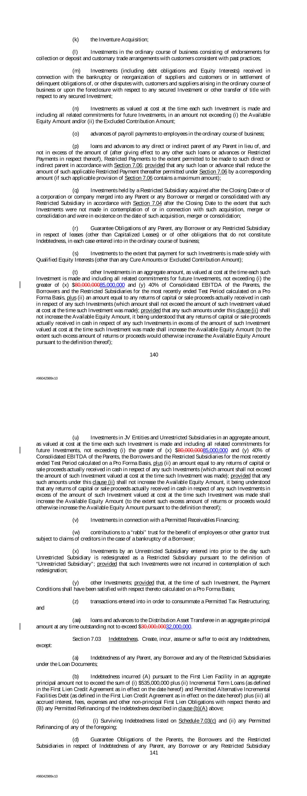 (k) the Inventure Acquisition; (l) Investments in the ordinary course of business consisting of endorsements for collection or deposit and customary trade arrangements with customers consistent with past practices; (m) Investments (including debt obligations and Equity Interests) received in connection with the bankruptcy or reorganization of suppliers and customers or in settlement of delinquent obligations of, or other disputes with, customers and suppliers arising in the ordinary course of business or upon the foreclosure with respect to any secured Investment or other transfer of title with respect to any secured Investment; (n) Investments as valued at cost at the time each such Investment is made and including all related commitments for future Investments, in an amount not exceeding (i) the Available Equity Amount and/or (ii) the Excluded Contribution Amount; (o) advances of payroll payments to employees in the ordinary course of business; (p) loans and advances to any direct or indirect parent of any Parent in lieu of, and not in excess of the amount of (after giving effect to any other such loans or advances or Restricted Payments in respect thereof), Restricted Payments to the extent permitted to be made to such direct or indirect parent in accordance with Section 7.06; provided that any such loan or advance shall reduce the amount of such applicable Restricted Payment thereafter permitted under Section 7.06 by a corresponding amount (if such applicable provision of Section 7.06 contains a maximum amount); (q) Investments held by a Restricted Subsidiary acquired after the Closing Date or of a corporation or company merged into any Parent or any Borrower or merged or consolidated with any Restricted Subsidiary in accordance with Section 7.04 after the Closing Date to the extent that such Investments were not made in contemplation of or in connection with such acquisition, merger or consolidation and were in existence on the date of such acquisition, merger or consolidation; (r) Guarantee Obligations of any Parent, any Borrower or any Restricted Subsidiary in respect of leases (other than Capitalized Leases) or of other obligations that do not constitute Indebtedness, in each case entered into in the ordinary course of business; (s) Investments to the extent that payment for such Investments is made solely with Qualified Equity Interests (other than any Cure Amounts or Excluded Contribution Amount); (t) other Investments in an aggregate amount, as valued at cost at the time each such Investment is made and including all related commitments for future Investments, not exceeding (i) the greater of (x) $80,000,00085,000,000 and (y) 40% of Consolidated EBITDA of the Parents, the Borrowers and the Restricted Subsidiaries for the most recently ended Test Period calculated on a Pro Forma Basis, plus (ii) an amount equal to any returns of capital or sale proceeds actually received in cash in respect of any such Investments (which amount shall not exceed the amount of such Investment valued at cost at the time such Investment was made); provided that any such amounts under this clause (ii) shall not increase the Available Equity Amount, it being understood that any returns of capital or sale proceeds actually received in cash in respect of any such Investments in excess of the amount of such Investment valued at cost at the time such Investment was made shall increase the Available Equity Amount (to the extent such excess amount of returns or proceeds would otherwise increase the Available Equity Amount pursuant to the definition thereof); 140 #96042989v10 (u) Investments in JV Entities and Unrestricted Subsidiaries in an aggregate amount, as valued at cost at the time each such Investment is made and including all related commitments for future Investments, not exceeding (i) the greater of (x) $80,000,00085,000,000 and (y) 40% of Consolidated EBITDA of the Parents, the Borrowers and the Restricted Subsidiaries for the most recently ended Test Period calculated on a Pro Forma Basis, plus (ii) an amount equal to any returns of capital or sale proceeds actually received in cash in respect of any such Investments (which amount shall not exceed the amount of such Investment valued at cost at the time such Investment was made); provided that any such amounts under this clause (ii) shall not increase the Available Equity Amount, it being understood that any returns of capital or sale proceeds actually received in cash in respect of any such Investments in excess of the amount of such Investment valued at cost at the time such Investment was made shall increase the Available Equity Amount (to the extent such excess amount of returns or proceeds would otherwise increase the Available Equity Amount pursuant to the definition thereof); (v) Investments in connection with a Permitted Receivables Financing; (w) contributions to a “rabbi” trust for the benefit of employees or other grantor trust subject to claims of creditors in the case of a bankruptcy of a Borrower; (x) Investments by an Unrestricted Subsidiary entered into prior to the day such Unrestricted Subsidiary is redesignated as a Restricted Subsidiary pursuant to the definition of “Unrestricted Subsidiary”; provided that such Investments were not incurred in contemplation of such redesignation; (y) other Investments; provided that, at the time of such Investment, the Payment Conditions shall have been satisfied with respect thereto calculated on a Pro Forma Basis; (z) transactions entered into in order to consummate a Permitted Tax Restructuring; and (aa) loans and advances to the Distribution Asset Transferee in an aggregate principal amount at any time outstanding not to exceed $30,000,00032,000,000. Section 7.03 Indebtedness. Create, incur, assume or suffer to exist any Indebtedness, except: (a) Indebtedness of any Parent, any Borrower and any of the Restricted Subsidiaries under the Loan Documents; (b) Indebtedness incurred (A) 