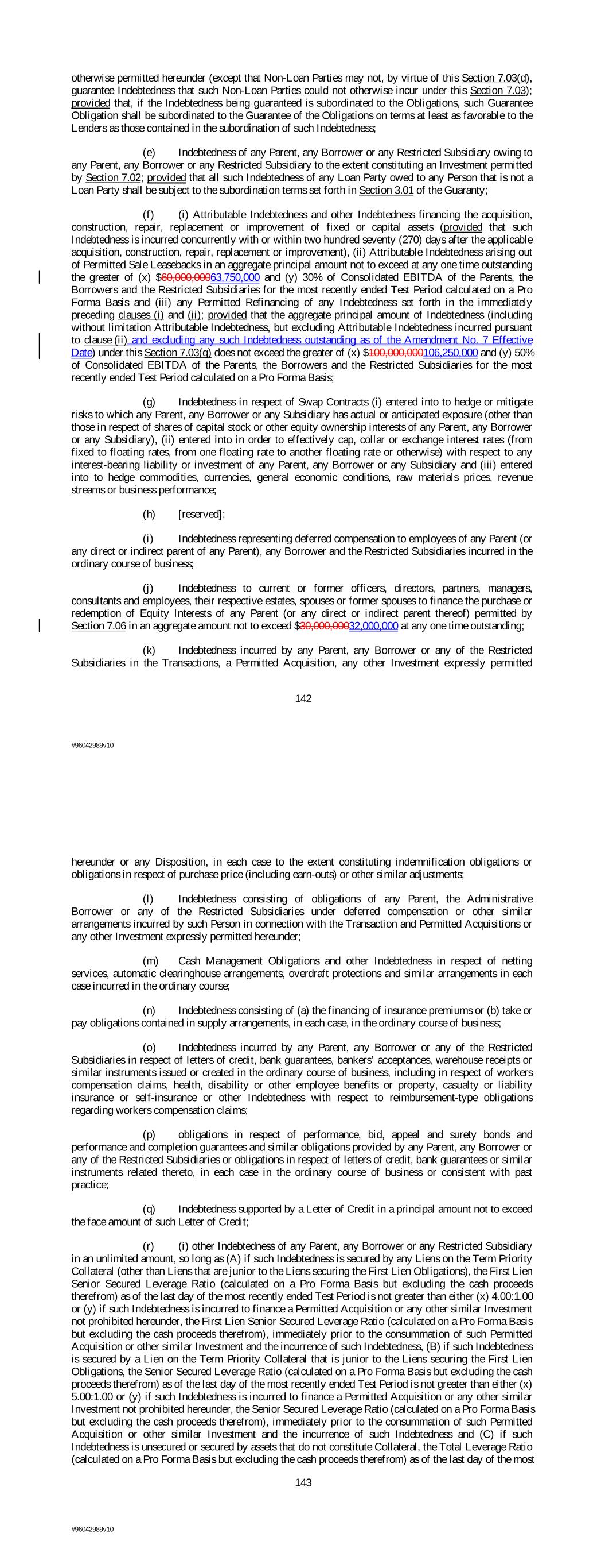otherwise permitted hereunder (except that Non-Loan Parties may not, by virtue of this Section 7.03(d), guarantee Indebtedness that such Non-Loan Parties could not otherwise incur under this Section 7.03); provided that, if the Indebtedness being guaranteed is subordinated to the Obligations, such Guarantee Obligation shall be subordinated to the Guarantee of the Obligations on terms at least as favorable to the Lenders as those contained in the subordination of such Indebtedness; (e) Indebtedness of any Parent, any Borrower or any Restricted Subsidiary owing to any Parent, any Borrower or any Restricted Subsidiary to the extent constituting an Investment permitted by Section 7.02; provided that all such Indebtedness of any Loan Party owed to any Person that is not a Loan Party shall be subject to the subordination terms set forth in Section 3.01 of the Guaranty; (f) (i) Attributable Indebtedness and other Indebtedness financing the acquisition, construction, repair, replacement or improvement of fixed or capital assets (provided that such Indebtedness is incurred concurrently with or within two hundred seventy (270) days after the applicable acquisition, construction, repair, replacement or improvement), (ii) Attributable Indebtedness arising out of Permitted Sale Leasebacks in an aggregate principal amount not to exceed at any one time outstanding the greater of (x) $60,000,00063,750,000 and (y) 30% of Consolidated EBITDA of the Parents, the Borrowers and the Restricted Subsidiaries for the most recently ended Test Period calculated on a Pro Forma Basis and (iii) any Permitted Refinancing of any Indebtedness set forth in the immediately preceding clauses (i) and (ii); provided that the aggregate principal amount of Indebtedness (including without limitation Attributable Indebtedness, but excluding Attributable Indebtedness incurred pursuant to clause (ii) and excluding any such Indebtedness outstanding as of the Amendment No. 7 Effective Date) under this Section 7.03(g) does not exceed the greater of (x) $100,000,000106,250,000 and (y) 50% of Consolidated EBITDA of the Parents, the Borrowers and the Restricted Subsidiaries for the most recently ended Test Period calculated on a Pro Forma Basis; (g) Indebtedness in respect of Swap Contracts (i) entered into to hedge or mitigate risks to which any Parent, any Borrower or any Subsidiary has actual or anticipated exposure (other than those in respect of shares of capital stock or other equity ownership interests of any Parent, any Borrower or any Subsidiary), (ii) entered into in order to effectively cap, collar or exchange interest rates (from fixed to floating rates, from one floating rate to another floating rate or otherwise) with respect to any interest-bearing liability or investment of any Parent, any Borrower or any Subsidiary and (iii) entered into to hedge commodities, currencies, general economic conditions, raw materials prices, revenue streams or business performance; (h) [reserved]; (i) Indebtedness representing deferred compensation to employees of any Parent (or any direct or indirect parent of any Parent), any Borrower and the Restricted Subsidiaries incurred in the ordinary course of business; (j) Indebtedness to current or former officers, directors, partners, managers, consultants and employees, their respective estates, spouses or former spouses to finance the purchase or redemption of Equity Interests of any Parent (or any direct or indirect parent thereof) permitted by Section 7.06 in an aggregate amount not to exceed $30,000,00032,000,000 at any one time outstanding; (k) Indebtedness incurred by any Parent, any Borrower or any of the Restricted Subsidiaries in the Transactions, a Permitted Acquisition, any other Investment expressly permitted 142 #96042989v10 hereunder or any Disposition, in each case to the extent constituting indemnification obligations or obligations in respect of purchase price (including earn-outs) or other similar adjustments; (l) Indebtedness consisting of obligations of any Parent, the Administrative Borrower or any of the Restricted Subsidiaries under deferred compensation or other similar arrangements incurred by such Person in connection with the Transaction and Permitted Acquisitions or any other Investment expressly permitted hereunder; (m) Cash Management Obligations and other Indebtedness in respect of netting services, automatic clearinghouse arrangements, overdraft protections and similar arrangements in each case incurred in the ordinary course; (n) Indebtedness consisting of (a) the financing of insurance premiums or (b) take or pay obligations contained in supply arrangements, in each case, in the ordinary course of business; (o) Indebtedness incurred by any Parent, any Borrower or any of the Restricted Subsidiaries in respect of letters of credit, bank guarantees, bankers’ acceptances, warehouse receipts or similar instruments issued or created in the ordinary course of business, including in respect of workers compensation claims, health, disability or other employee benefits or property, casualty or liability insurance or self-insurance or other Indebtedness with respect to reimbursement-type obligations regarding workers compensation claims; (p) obligations in respect of performance, bid, appeal and surety bonds and performance and completion guarantees and similar obligations provided by any Parent, any Borrower or any of the Restricted Subsidiaries or obligations in respect of letters of credit, bank guarantees or similar instruments related thereto, in each case in the ordinary course of business or consistent with past practice; (q) Indebtedness supported by a Letter of Credit in a principal amount not to exceed the face amount of such Letter of Credit; (r) (i) other Indebtedness of any Parent, any Borrower or any Restricted Subsidiary in an unlimited amount, so long as (A) if such Indebtedness is secured by any Liens on the Term Priority Collateral (other than Liens th