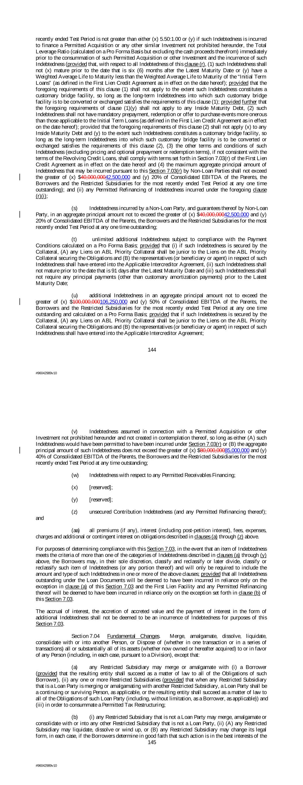 recently ended Test Period is not greater than either (x) 5.50:1.00 or (y) if such Indebtedness is incurred to finance a Permitted Acquisition or any other similar Investment not prohibited hereunder, the Total Leverage Ratio (calculated on a Pro Forma Basis but excluding the cash proceeds therefrom) immediately prior to the consummation of such Permitted Acquisition or other Investment and the incurrence of such Indebtedness (provided that, with respect to all Indebtedness of this clause (r), (1) such Indebtedness shall not (x) mature prior to the date that is six (6) months after the Latest Maturity Date or (y) have a Weighted Average Life to Maturity less than the Weighted Average Life to Maturity of the “Initial Term Loans” (as defined in the First Lien Credit Agreement as in effect on the date hereof); provided that the foregoing requirements of this clause (1) shall not apply to the extent such Indebtedness constitutes a customary bridge facility, so long as the long-term Indebtedness into which such customary bridge facility is to be converted or exchanged satisfies the requirements of this clause (1); provided further that the foregoing requirements of clause (1)(y) shall not apply to any Inside Maturity Debt, (2) such Indebtedness shall not have mandatory prepayment, redemption or offer to purchase events more onerous than those applicable to the Initial Term Loans (as defined in the First Lien Credit Agreement as in effect on the date hereof); provided that the foregoing requirements of this clause (2) shall not apply (x) to any Inside Maturity Debt and (y) to the extent such Indebtedness constitutes a customary bridge facility, so long as the long-term Indebtedness into which such customary bridge facility is to be converted or exchanged satisfies the requirements of this clause (2), (3) the other terms and conditions of such Indebtedness (excluding pricing and optional prepayment or redemption terms), if not consistent with the terms of the Revolving Credit Loans, shall comply with terms set forth in Section 7.03(r) of the First Lien Credit Agreement as in effect on the date hereof and (4) the maximum aggregate principal amount of Indebtedness that may be incurred pursuant to this Section 7.03(r) by Non-Loan Parties shall not exceed the greater of (x) $40,000,00042,500,000 and (y) 20% of Consolidated EBITDA of the Parents, the Borrowers and the Restricted Subsidiaries for the most recently ended Test Period at any one time outstanding); and (ii) any Permitted Refinancing of Indebtedness incurred under the foregoing clause (r)(i); (s) Indebtedness incurred by a Non-Loan Party, and guarantees thereof by Non-Loan Party, in an aggregate principal amount not to exceed the greater of (x) $40,000,00042,500,000 and (y) 20% of Consolidated EBITDA of the Parents, the Borrowers and the Restricted Subsidiaries for the most recently ended Test Period at any one time outstanding; (t) unlimited additional Indebtedness subject to compliance with the Payment Conditions calculated on a Pro Forma Basis; provided that (i) if such Indebtedness is secured by the Collateral, (A) any Liens on ABL Priority Collateral shall be junior to the Liens on the ABL Priority Collateral securing the Obligations and (B) the representatives (or beneficiary or agent) in respect of such Indebtedness shall have entered into the Applicable Intercreditor Agreement, (ii) such Indebtedness shall not mature prior to the date that is 91 days after the Latest Maturity Date and (iii) such Indebtedness shall not require any principal payments (other than customary amortization payments) prior to the Latest Maturity Date; (u) additional Indebtedness in an aggregate principal amount not to exceed the greater of (x) $100,000,000106,250,000 and (y) 50% of Consolidated EBITDA of the Parents, the Borrowers and the Restricted Subsidiaries for the most recently ended Test Period at any one time outstanding and calculated on a Pro Forma Basis; provided that if such Indebtedness is secured by the Collateral, (A) any Liens on ABL Priority Collateral shall be junior to the Liens on the ABL Priority Collateral securing the Obligations and (B) the representatives (or beneficiary or agent) in respect of such Indebtedness shall have entered into the Applicable Intercreditor Agreement; 144 #96042989v10 (v) Indebtedness assumed in connection with a Permitted Acquisition or other Investment not prohibited hereunder and not created in contemplation thereof, so long as either (A) such Indebtedness would have been permitted to have been incurred under Section 7.03(r) or (B) the aggregate principal amount of such Indebtedness does not exceed the greater of (x) $80,000,00085,000,000 and (y) 40% of Consolidated EBITDA of the Parents, the Borrowers and the Restricted Subsidiaries for the most recently ended Test Period at any time outstanding; (w) Indebtedness with respect to any Permitted Receivables Financing; (x) [reserved]; (y) [reserved]; (z) unsecured Contribution Indebtedness (and any Permitted Refinancing thereof); and (aa) all premiums (if any), interest (including post-petition interest), fees, expenses, charges and additional or contingent interest on obligations described in clauses (a) through (z) above. For purposes of determining compliance with this Section 7.03, in the event that an item of Indebtedness meets the criteria of more than one of the categories of Indebtedness described in clauses (a) through (y) above, the Borrowers may, in their sole discretion, classify and reclassify or later divide, classify or reclassify such item of Indebtedness (or any portion thereof) and will only be required to include the amount and type of such Indebtedness in one or more of the above clauses; provided that all Indebtedness outstanding under the Loan Documents will be deemed to have been incurred in reliance only on the exception in clause (a) of this Section 7.03 and the First Lien Facility and any Permitted Refinancing thereof will be d