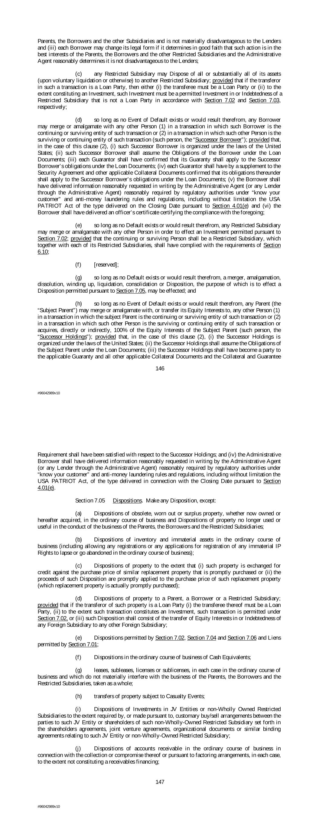 Parents, the Borrowers and the other Subsidiaries and is not materially disadvantageous to the Lenders and (iii) each Borrower may change its legal form if it determines in good faith that such action is in the best interests of the Parents, the Borrowers and the other Restricted Subsidiaries and the Administrative Agent reasonably determines it is not disadvantageous to the Lenders; (c) any Restricted Subsidiary may Dispose of all or substantially all of its assets (upon voluntary liquidation or otherwise) to another Restricted Subsidiary; provided that if the transferor in such a transaction is a Loan Party, then either (i) the transferee must be a Loan Party or (ii) to the extent constituting an Investment, such Investment must be a permitted Investment in or Indebtedness of a Restricted Subsidiary that is not a Loan Party in accordance with Section 7.02 and Section 7.03, respectively; (d) so long as no Event of Default exists or would result therefrom, any Borrower may merge or amalgamate with any other Person (1) in a transaction in which such Borrower is the continuing or surviving entity of such transaction or (2) in a transaction in which such other Person is the surviving or continuing entity of such transaction (such person, the “Successor Borrower”); provided that, in the case of this clause (2), (i) such Successor Borrower is organized under the laws of the United States; (ii) such Successor Borrower shall assume the Obligations of the Borrower under the Loan Documents; (iii) each Guarantor shall have confirmed that its Guaranty shall apply to the Successor Borrower’s obligations under the Loan Documents; (iv) each Guarantor shall have by a supplement to the Security Agreement and other applicable Collateral Documents confirmed that its obligations thereunder shall apply to the Successor Borrower’s obligations under the Loan Documents; (v) the Borrower shall have delivered information reasonably requested in writing by the Administrative Agent (or any Lender through the Administrative Agent) reasonably required by regulatory authorities under “know your customer” and anti-money laundering rules and regulations, including without limitation the USA PATRIOT Act of the type delivered on the Closing Date pursuant to Section 4.01(e) and (vi) the Borrower shall have delivered an officer’s certificate certifying the compliance with the foregoing; (e) so long as no Default exists or would result therefrom, any Restricted Subsidiary may merge or amalgamate with any other Person in order to effect an Investment permitted pursuant to Section 7.02; provided that the continuing or surviving Person shall be a Restricted Subsidiary, which together with each of its Restricted Subsidiaries, shall have complied with the requirements of Section 6.10; (f) [reserved]; (g) so long as no Default exists or would result therefrom, a merger, amalgamation, dissolution, winding up, liquidation, consolidation or Disposition, the purpose of which is to effect a Disposition permitted pursuant to Section 7.05, may be effected; and (h) so long as no Event of Default exists or would result therefrom, any Parent (the “Subject Parent”) may merge or amalgamate with, or transfer its Equity Interests to, any other Person (1) in a transaction in which the subject Parent is the continuing or surviving entity of such transaction or (2) in a transaction in which such other Person is the surviving or continuing entity of such transaction or acquires, directly or indirectly, 100% of the Equity Interests of the Subject Parent (such person, the “Successor Holdings”); provided that, in the case of this clause (2), (i) the Successor Holdings is organized under the laws of the United States; (ii) the Successor Holdings shall assume the Obligations of the Subject Parent under the Loan Documents; (iii) the Successor Holdings shall have become a party to the applicable Guaranty and all other applicable Collateral Documents and the Collateral and Guarantee 146 #96042989v10 Requirement shall have been satisfied with respect to the Successor Holdings; and (iv) the Administrative Borrower shall have delivered information reasonably requested in writing by the Administrative Agent (or any Lender through the Administrative Agent) reasonably required by regulatory authorities under “know your customer” and anti-money laundering rules and regulations, including without limitation the USA PATRIOT Act, of the type delivered in connection with the Closing Date pursuant to Section 4.01(e). Section 7.05 Dispositions. Make any Disposition, except: (a) Dispositions of obsolete, worn out or surplus property, whether now owned or hereafter acquired, in the ordinary course of business and Dispositions of property no longer used or useful in the conduct of the business of the Parents, the Borrowers and the Restricted Subsidiaries; (b) Dispositions of inventory and immaterial assets in the ordinary course of business (including allowing any registrations or any applications for registration of any immaterial IP Rights to lapse or go abandoned in the ordinary course of business); (c) Dispositions of property to the extent that (i) such property is exchanged for credit against the purchase price of similar replacement property that is promptly purchased or (ii) the proceeds of such Disposition are promptly applied to the purchase price of such replacement property (which replacement property is actually promptly purchased); (d) Dispositions of property to a Parent, a Borrower or a Restricted Subsidiary; provided that if the transferor of such property is a Loan Party (i) the transferee thereof must be a Loan Party, (ii) to the extent such transaction constitutes an Investment, such transaction is permitted under Section 7.02, or (iii) such Disposition shall consist of the transfer of Equity Interests in or Indebtedness of any Foreign Subsidiary to any other Foreign Subsidiary; (e) Dispositions permitted by Section 7.02, Sec