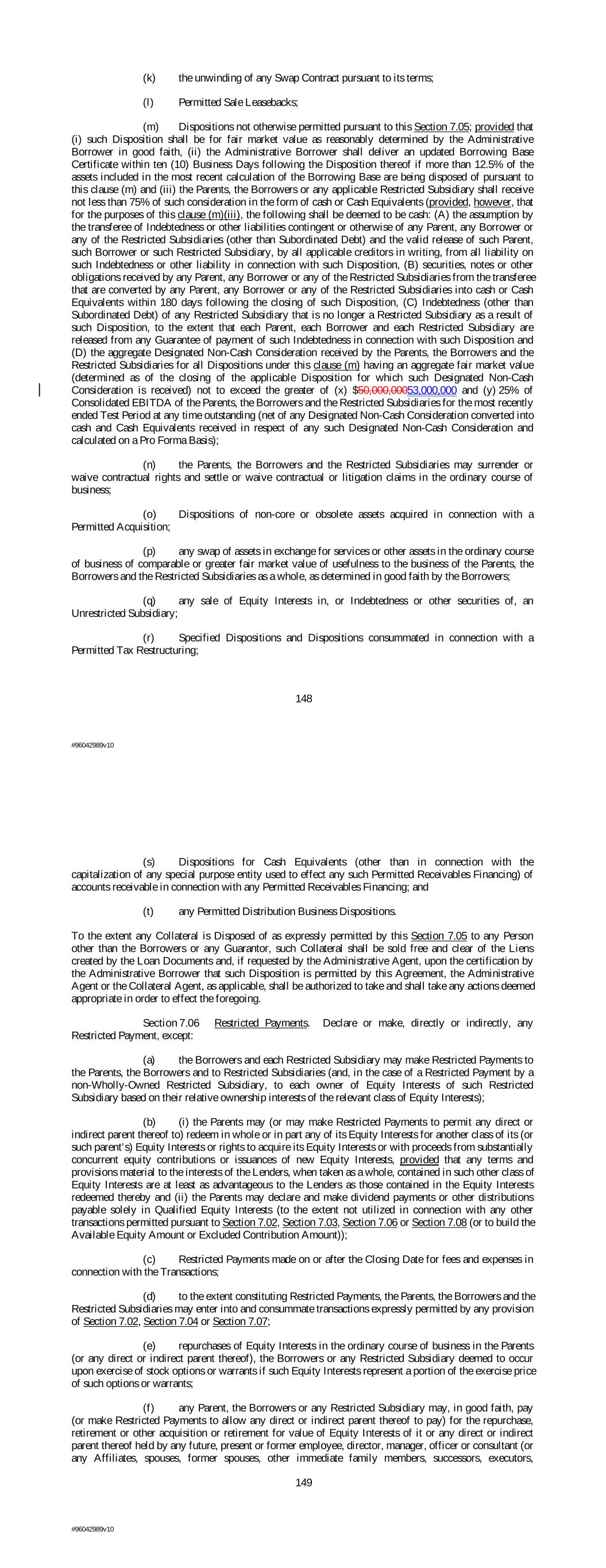 (k) the unwinding of any Swap Contract pursuant to its terms; (l) Permitted Sale Leasebacks; (m) Dispositions not otherwise permitted pursuant to this Section 7.05; provided that (i) such Disposition shall be for fair market value as reasonably determined by the Administrative Borrower in good faith, (ii) the Administrative Borrower shall deliver an updated Borrowing Base Certificate within ten (10) Business Days following the Disposition thereof if more than 12.5% of the assets included in the most recent calculation of the Borrowing Base are being disposed of pursuant to this clause (m) and (iii) the Parents, the Borrowers or any applicable Restricted Subsidiary shall receive not less than 75% of such consideration in the form of cash or Cash Equivalents (provided, however, that for the purposes of this clause (m)(iii), the following shall be deemed to be cash: (A) the assumption by the transferee of Indebtedness or other liabilities contingent or otherwise of any Parent, any Borrower or any of the Restricted Subsidiaries (other than Subordinated Debt) and the valid release of such Parent, such Borrower or such Restricted Subsidiary, by all applicable creditors in writing, from all liability on such Indebtedness or other liability in connection with such Disposition, (B) securities, notes or other obligations received by any Parent, any Borrower or any of the Restricted Subsidiaries from the transferee that are converted by any Parent, any Borrower or any of the Restricted Subsidiaries into cash or Cash Equivalents within 180 days following the closing of such Disposition, (C) Indebtedness (other than Subordinated Debt) of any Restricted Subsidiary that is no longer a Restricted Subsidiary as a result of such Disposition, to the extent that each Parent, each Borrower and each Restricted Subsidiary are released from any Guarantee of payment of such Indebtedness in connection with such Disposition and (D) the aggregate Designated Non-Cash Consideration received by the Parents, the Borrowers and the Restricted Subsidiaries for all Dispositions under this clause (m) having an aggregate fair market value (determined as of the closing of the applicable Disposition for which such Designated Non-Cash Consideration is received) not to exceed the greater of (x) $50,000,00053,000,000 and (y) 25% of Consolidated EBITDA of the Parents, the Borrowers and the Restricted Subsidiaries for the most recently ended Test Period at any time outstanding (net of any Designated Non-Cash Consideration converted into cash and Cash Equivalents received in respect of any such Designated Non-Cash Consideration and calculated on a Pro Forma Basis); (n) the Parents, the Borrowers and the Restricted Subsidiaries may surrender or waive contractual rights and settle or waive contractual or litigation claims in the ordinary course of business; (o) Dispositions of non-core or obsolete assets acquired in connection with a Permitted Acquisition; (p) any swap of assets in exchange for services or other assets in the ordinary course of business of comparable or greater fair market value of usefulness to the business of the Parents, the Borrowers and the Restricted Subsidiaries as a whole, as determined in good faith by the Borrowers; (q) any sale of Equity Interests in, or Indebtedness or other securities of, an Unrestricted Subsidiary; (r) Specified Dispositions and Dispositions consummated in connection with a Permitted Tax Restructuring; 148 #96042989v10 (s) Dispositions for Cash Equivalents (other than in connection with the capitalization of any special purpose entity used to effect any such Permitted Receivables Financing) of accounts receivable in connection with any Permitted Receivables Financing; and (t) any Permitted Distribution Business Dispositions. To the extent any Collateral is Disposed of as expressly permitted by this Section 7.05 to any Person other than the Borrowers or any Guarantor, such Collateral shall be sold free and clear of the Liens created by the Loan Documents and, if requested by the Administrative Agent, upon the certification by the Administrative Borrower that such Disposition is permitted by this Agreement, the Administrative Agent or the Collateral Agent, as applicable, shall be authorized to take and shall take any actions deemed appropriate in order to effect the foregoing. Section 7.06 Restricted Payments. Declare or make, directly or indirectly, any Restricted Payment, except: (a) the Borrowers and each Restricted Subsidiary may make Restricted Payments to the Parents, the Borrowers and to Restricted Subsidiaries (and, in the case of a Restricted Payment by a non-Wholly-Owned Restricted Subsidiary, to each owner of Equity Interests of such Restricted Subsidiary based on their relative ownership interests of the relevant class of Equity Interests); (b) (i) the Parents may (or may make Restricted Payments to permit any direct or indirect parent thereof to) redeem in whole or in part any of its Equity Interests for another class of its (or such parent’s) Equity Interests or rights to acquire its Equity Interests or with proceeds from substantially concurrent equity contributions or issuances of new Equity Interests, provided that any terms and provisions material to the interests of the Lenders, when taken as a whole, contained in such other class of Equity Interests are at least as advantageous to the Lenders as those contained in the Equity Interests redeemed thereby and (ii) the Parents may declare and make dividend payments or other distributions payable solely in Qualified Equity Interests (to the extent not utilized in connection with any other transactions permitted pursuant to Section 7.02, Section 7.03, Section 7.06 or Section 7.08 (or to build the Available Equity Amount or Excluded Contribution Amount)); (c) Restricted Payments made on or after the Closing Date for fees and expenses in connection with the Transactions; (d) to the extent constituting Restricted Payments, the 