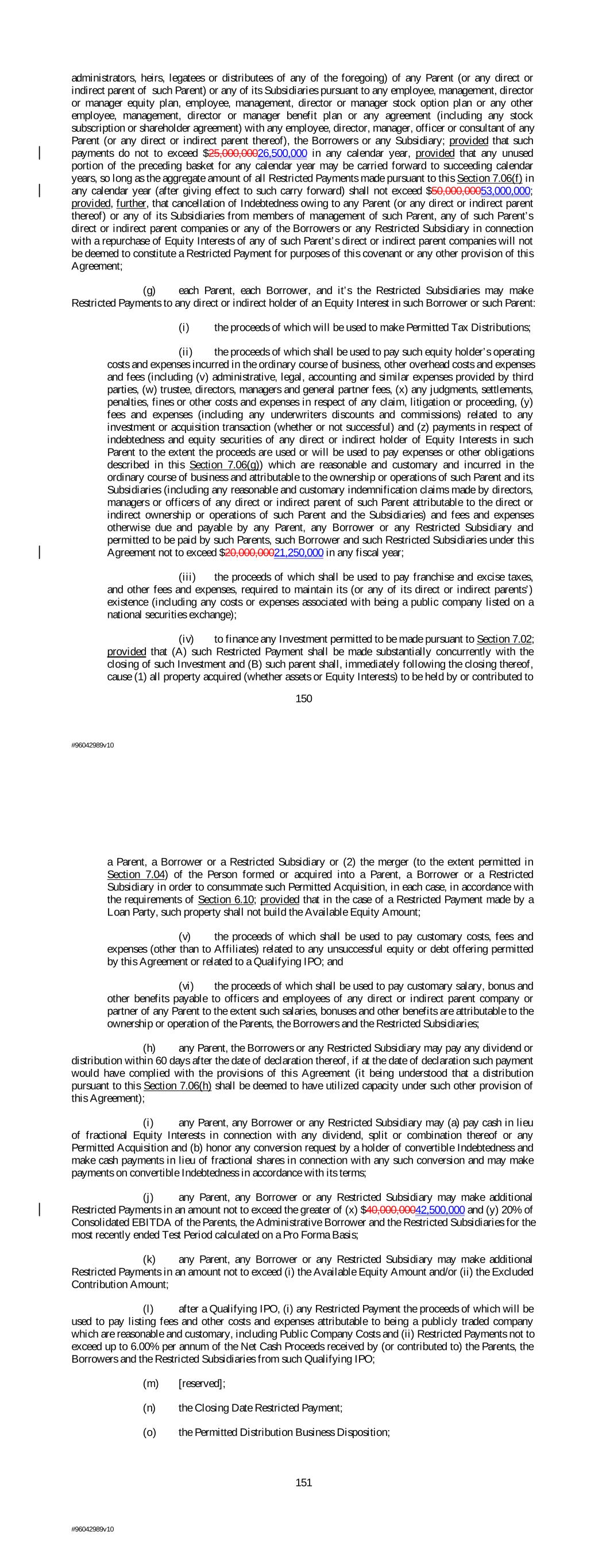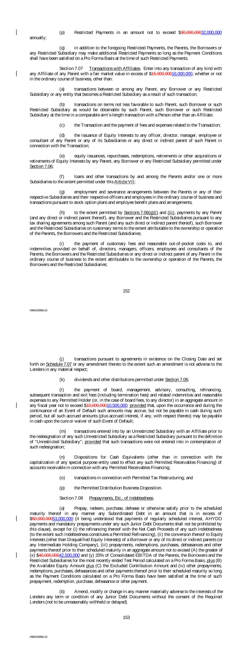 (p) Restricted Payments in an amount not to exceed $30,000,00032,000,000 annually; (q) in addition to the foregoing Restricted Payments, the Parents, the Borrowers or any Restricted Subsidiary may make additional Restricted Payments so long as the Payment Conditions shall have been satisfied on a Pro Forma Basis at the time of such Restricted Payments. Section 7.07 Transactions with Affiliates. Enter into any transaction of any kind with any Affiliate of any Parent with a fair market value in excess of $15,000,00016,000,000, whether or not in the ordinary course of business, other than: (a) transactions between or among any Parent, any Borrower or any Restricted Subsidiary or any entity that becomes a Restricted Subsidiary as a result of such transaction; (b) transactions on terms not less favorable to such Parent, such Borrower or such Restricted Subsidiary as would be obtainable by such Parent, such Borrower or such Restricted Subsidiary at the time in a comparable arm’s-length transaction with a Person other than an Affiliate; (c) the Transaction and the payment of fees and expenses related to the Transaction; (d) the issuance of Equity Interests to any officer, director, manager, employee or consultant of any Parent or any of its Subsidiaries or any direct or indirect parent of such Parent in connection with the Transaction; (e) equity issuances, repurchases, redemptions, retirements or other acquisitions or retirements of Equity Interests by any Parent, any Borrower or any Restricted Subsidiary permitted under Section 7.06; (f) loans and other transactions by and among the Parents and/or one or more Subsidiaries to the extent permitted under this Article VII; (g) employment and severance arrangements between the Parents or any of their respective Subsidiaries and their respective officers and employees in the ordinary course of business and transactions pursuant to stock option plans and employee benefit plans and arrangements; (h) to the extent permitted by Sections 7.06(g)(i) and (iii), payments by any Parent (and any direct or indirect parent thereof), any Borrower and the Restricted Subsidiaries pursuant to any tax sharing agreements among such Parent (and any such direct or indirect parent thereof), such Borrower and the Restricted Subsidiaries on customary terms to the extent attributable to the ownership or operation of the Parents, the Borrowers and the Restricted Subsidiaries; (i) the payment of customary fees and reasonable out-of-pocket costs to, and indemnities provided on behalf of, directors, managers, officers, employees and consultants of the Parents, the Borrowers and the Restricted Subsidiaries or any direct or indirect parent of any Parent in the ordinary course of business to the extent attributable to the ownership or operation of the Parents, the Borrowers and the Restricted Subsidiaries; 152 #96042989v10 (j) transactions pursuant to agreements in existence on the Closing Date and set forth on Schedule 7.07 or any amendment thereto to the extent such an amendment is not adverse to the Lenders in any material respect; (k) dividends and other distributions permitted under Section 7.06; (l) the payment of board, management, advisory, consulting, refinancing, subsequent transaction and exit fees (including termination fees) and related indemnities and reasonable expenses to any Permitted Holder (or, in the case of board fees, to any director) in an aggregate amount in any fiscal year not to exceed $10,000,00010,500,000; provided that, upon the occurrence and during the continuance of an Event of Default such amounts may accrue, but not be payable in cash during such period, but all such accrued amounts (plus accrued interest, if any, with respect thereto) may be payable in cash upon the cure or waiver of such Event of Default; (m) transactions entered into by an Unrestricted Subsidiary with an Affiliate prior to the redesignation of any such Unrestricted Subsidiary as a Restricted Subsidiary pursuant to the definition of “Unrestricted Subsidiary”; provided that such transactions were not entered into in contemplation of such redesignation; (n) Dispositions for Cash Equivalents (other than in connection with the capitalization of any special purpose entity used to effect any such Permitted Receivables Financing) of accounts receivable in connection with any Permitted Receivables Financing; (o) transactions in connection with Permitted Tax Restructuring; and (p) the Permitted Distribution Business Disposition. Section 7.08 Prepayments, Etc., of Indebtedness. (a) Prepay, redeem, purchase, defease or otherwise satisfy prior to the scheduled maturity thereof in any manner any Subordinated Debt in an amount that is in excess of $50,000,00053,000,000 (it being understood that payments of regularly scheduled interest, AHYDO payments and mandatory prepayments under any such Junior Debt Documents shall not be prohibited by this clause), except for (i) the refinancing thereof with the Net Cash Proceeds of any such Indebtedness (to the extent such Indebtedness constitutes a Permitted Refinancing), (ii) the conversion thereof to Equity Interests (other than Disqualified Equity Interests) of a Borrower or any of its direct or indirect parents (or any Intermediate Holding Company), (iii) prepayments, redemptions, purchases, defeasances and other payments thereof prior to their scheduled maturity in an aggregate amount not to exceed (A) the greater of (x) $40,000,00042,500,000 and (y) 20% of Consolidated EBITDA of the Parents, the Borrowers and the Restricted Subsidiaries for the most recently ended Test Period calculated on a Pro Forma Basis, plus (B) the Available Equity Amount plus (C) the Excluded Contribution Amount and (iv) other prepayments, redemptions, purchases, defeasances and other payments thereof prior to their scheduled maturity so long as the Payment Conditions calculated on a Pro Forma Basis have been satisfied at the time of such prepayment, redemption, pur