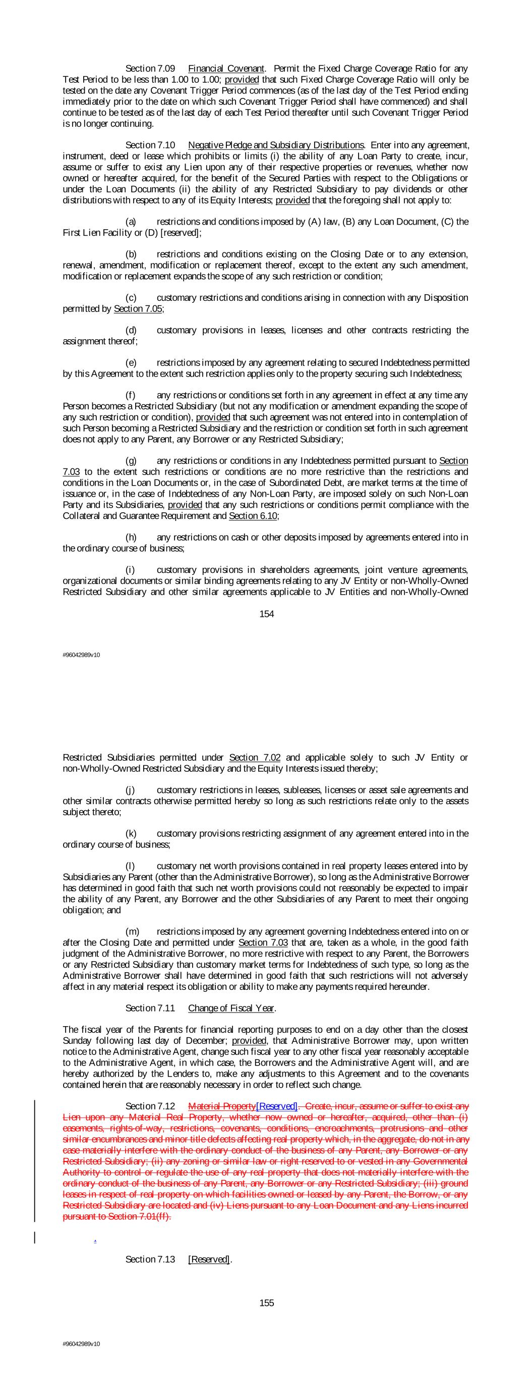 Section 7.09 Financial Covenant. Permit the Fixed Charge Coverage Ratio for any Test Period to be less than 1.00 to 1.00; provided that such Fixed Charge Coverage Ratio will only be tested on the date any Covenant Trigger Period commences (as of the last day of the Test Period ending immediately prior to the date on which such Covenant Trigger Period shall have commenced) and shall continue to be tested as of the last day of each Test Period thereafter until such Covenant Trigger Period is no longer continuing. Section 7.10 Negative Pledge and Subsidiary Distributions. Enter into any agreement, instrument, deed or lease which prohibits or limits (i) the ability of any Loan Party to create, incur, assume or suffer to exist any Lien upon any of their respective properties or revenues, whether now owned or hereafter acquired, for the benefit of the Secured Parties with respect to the Obligations or under the Loan Documents (ii) the ability of any Restricted Subsidiary to pay dividends or other distributions with respect to any of its Equity Interests; provided that the foregoing shall not apply to: (a) restrictions and conditions imposed by (A) law, (B) any Loan Document, (C) the First Lien Facility or (D) [reserved]; (b) restrictions and conditions existing on the Closing Date or to any extension, renewal, amendment, modification or replacement thereof, except to the extent any such amendment, modification or replacement expands the scope of any such restriction or condition; (c) customary restrictions and conditions arising in connection with any Disposition permitted by Section 7.05; (d) customary provisions in leases, licenses and other contracts restricting the assignment thereof; (e) restrictions imposed by any agreement relating to secured Indebtedness permitted by this Agreement to the extent such restriction applies only to the property securing such Indebtedness; (f) any restrictions or conditions set forth in any agreement in effect at any time any Person becomes a Restricted Subsidiary (but not any modification or amendment expanding the scope of any such restriction or condition), provided that such agreement was not entered into in contemplation of such Person becoming a Restricted Subsidiary and the restriction or condition set forth in such agreement does not apply to any Parent, any Borrower or any Restricted Subsidiary; (g) any restrictions or conditions in any Indebtedness permitted pursuant to Section 7.03 to the extent such restrictions or conditions are no more restrictive than the restrictions and conditions in the Loan Documents or, in the case of Subordinated Debt, are market terms at the time of issuance or, in the case of Indebtedness of any Non-Loan Party, are imposed solely on such Non-Loan Party and its Subsidiaries, provided that any such restrictions or conditions permit compliance with the Collateral and Guarantee Requirement and Section 6.10; (h) any restrictions on cash or other deposits imposed by agreements entered into in the ordinary course of business; (i) customary provisions in shareholders agreements, joint venture agreements, organizational documents or similar binding agreements relating to any JV Entity or non-Wholly-Owned Restricted Subsidiary and other similar agreements applicable to JV Entities and non-Wholly-Owned 154 #96042989v10 Restricted Subsidiaries permitted under Section 7.02 and applicable solely to such JV Entity or non-Wholly-Owned Restricted Subsidiary and the Equity Interests issued thereby; (j) customary restrictions in leases, subleases, licenses or asset sale agreements and other similar contracts otherwise permitted hereby so long as such restrictions relate only to the assets subject thereto; (k) customary provisions restricting assignment of any agreement entered into in the ordinary course of business; (l) customary net worth provisions contained in real property leases entered into by Subsidiaries any Parent (other than the Administrative Borrower), so long as the Administrative Borrower has determined in good faith that such net worth provisions could not reasonably be expected to impair the ability of any Parent, any Borrower and the other Subsidiaries of any Parent to meet their ongoing obligation; and (m) restrictions imposed by any agreement governing Indebtedness entered into on or after the Closing Date and permitted under Section 7.03 that are, taken as a whole, in the good faith judgment of the Administrative Borrower, no more restrictive with respect to any Parent, the Borrowers or any Restricted Subsidiary than customary market terms for Indebtedness of such type, so long as the Administrative Borrower shall have determined in good faith that such restrictions will not adversely affect in any material respect its obligation or ability to make any payments required hereunder. Section 7.11 Change of Fiscal Year. The fiscal year of the Parents for financial reporting purposes to end on a day other than the closest Sunday following last day of December; provided, that Administrative Borrower may, upon written notice to the Administrative Agent, change such fiscal year to any other fiscal year reasonably acceptable to the Administrative Agent, in which case, the Borrowers and the Administrative Agent will, and are hereby authorized by the Lenders to, make any adjustments to this Agreement and to the covenants contained herein that are reasonably necessary in order to reflect such change. Section 7.12 Material Property[Reserved]. Create, incur, assume or suffer to exist any Lien upon any Material Real Property, whether now owned or hereafter, acquired, other than (i) easements, rights-of-way, restrictions, covenants, conditions, encroachments, protrusions and other similar encumbrances and minor title defects affecting real property which, in the aggregate, do not in any case materially interfere with the ordinary conduct of the business of any Parent, any Borrower or any Restricted Subsidiary; (ii) any zoning or si
