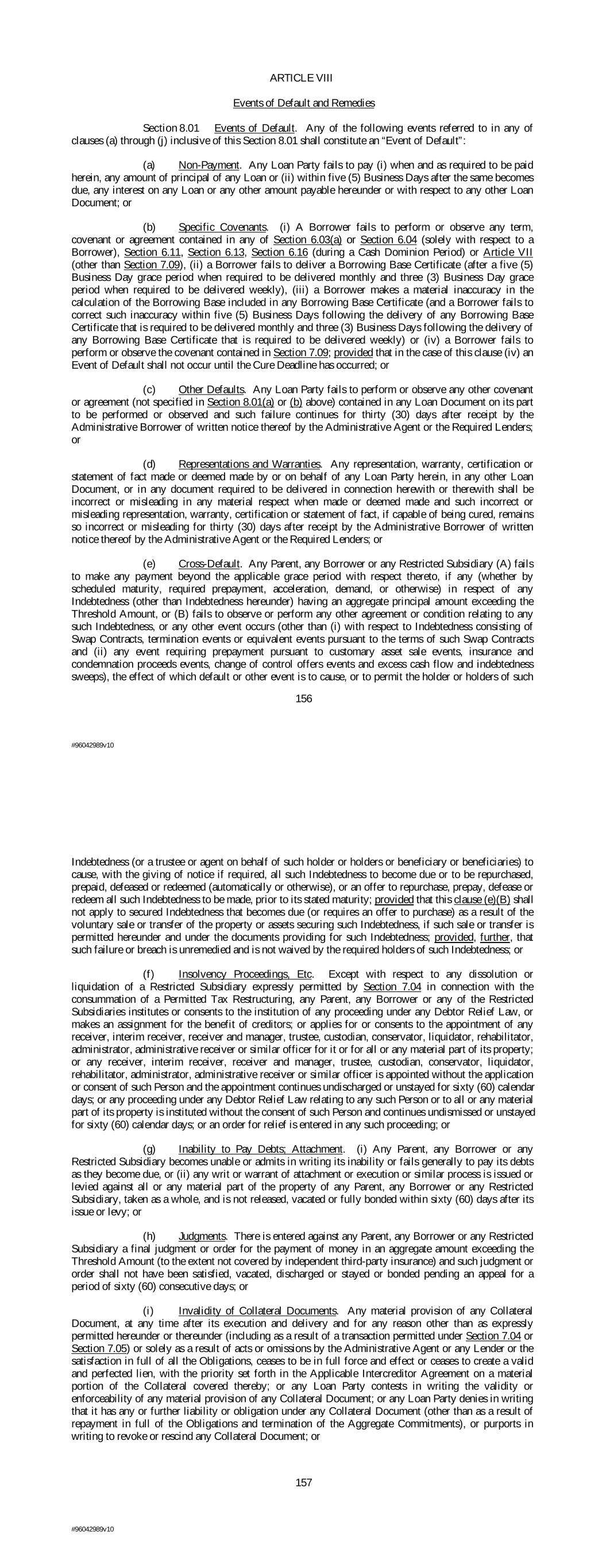 ARTICLE VIII Events of Default and Remedies Section 8.01 Events of Default. Any of the following events referred to in any of clauses (a) through (j) inclusive of this Section 8.01 shall constitute an “Event of Default”: (a) Non-Payment. Any Loan Party fails to pay (i) when and as required to be paid herein, any amount of principal of any Loan or (ii) within five (5) Business Days after the same becomes due, any interest on any Loan or any other amount payable hereunder or with respect to any other Loan Document; or (b) Specific Covenants. (i) A Borrower fails to perform or observe any term, covenant or agreement contained in any of Section 6.03(a) or Section 6.04 (solely with respect to a Borrower), Section 6.11, Section 6.13, Section 6.16 (during a Cash Dominion Period) or Article VII (other than Section 7.09), (ii) a Borrower fails to deliver a Borrowing Base Certificate (after a five (5) Business Day grace period when required to be delivered monthly and three (3) Business Day grace period when required to be delivered weekly), (iii) a Borrower makes a material inaccuracy in the calculation of the Borrowing Base included in any Borrowing Base Certificate (and a Borrower fails to correct such inaccuracy within five (5) Business Days following the delivery of any Borrowing Base Certificate that is required to be delivered monthly and three (3) Business Days following the delivery of any Borrowing Base Certificate that is required to be delivered weekly) or (iv) a Borrower fails to perform or observe the covenant contained in Section 7.09; provided that in the case of this clause (iv) an Event of Default shall not occur until the Cure Deadline has occurred; or (c) Other Defaults. Any Loan Party fails to perform or observe any other covenant or agreement (not specified in Section 8.01(a) or (b) above) contained in any Loan Document on its part to be performed or observed and such failure continues for thirty (30) days after receipt by the Administrative Borrower of written notice thereof by the Administrative Agent or the Required Lenders; or (d) Representations and Warranties. Any representation, warranty, certification or statement of fact made or deemed made by or on behalf of any Loan Party herein, in any other Loan Document, or in any document required to be delivered in connection herewith or therewith shall be incorrect or misleading in any material respect when made or deemed made and such incorrect or misleading representation, warranty, certification or statement of fact, if capable of being cured, remains so incorrect or misleading for thirty (30) days after receipt by the Administrative Borrower of written notice thereof by the Administrative Agent or the Required Lenders; or (e) Cross-Default. Any Parent, any Borrower or any Restricted Subsidiary (A) fails to make any payment beyond the applicable grace period with respect thereto, if any (whether by scheduled maturity, required prepayment, acceleration, demand, or otherwise) in respect of any Indebtedness (other than Indebtedness hereunder) having an aggregate principal amount exceeding the Threshold Amount, or (B) fails to observe or perform any other agreement or condition relating to any such Indebtedness, or any other event occurs (other than (i) with respect to Indebtedness consisting of Swap Contracts, termination events or equivalent events pursuant to the terms of such Swap Contracts and (ii) any event requiring prepayment pursuant to customary asset sale events, insurance and condemnation proceeds events, change of control offers events and excess cash flow and indebtedness sweeps), the effect of which default or other event is to cause, or to permit the holder or holders of such 156 #96042989v10 Indebtedness (or a trustee or agent on behalf of such holder or holders or beneficiary or beneficiaries) to cause, with the giving of notice if required, all such Indebtedness to become due or to be repurchased, prepaid, defeased or redeemed (automatically or otherwise), or an offer to repurchase, prepay, defease or redeem all such Indebtedness to be made, prior to its stated maturity; provided that this clause (e)(B) shall not apply to secured Indebtedness that becomes due (or requires an offer to purchase) as a result of the voluntary sale or transfer of the property or assets securing such Indebtedness, if such sale or transfer is permitted hereunder and under the documents providing for such Indebtedness; provided, further, that such failure or breach is unremedied and is not waived by the required holders of such Indebtedness; or (f) Insolvency Proceedings, Etc. Except with respect to any dissolution or liquidation of a Restricted Subsidiary expressly permitted by Section 7.04 in connection with the consummation of a Permitted Tax Restructuring, any Parent, any Borrower or any of the Restricted Subsidiaries institutes or consents to the institution of any proceeding under any Debtor Relief Law, or makes an assignment for the benefit of creditors; or applies for or consents to the appointment of any receiver, interim receiver, receiver and manager, trustee, custodian, conservator, liquidator, rehabilitator, administrator, administrative receiver or similar officer for it or for all or any material part of its property; or any receiver, interim receiver, receiver and manager, trustee, custodian, conservator, liquidator, rehabilitator, administrator, administrative receiver or similar officer is appointed without the application or consent of such Person and the appointment continues undischarged or unstayed for sixty (60) calendar days; or any proceeding under any Debtor Relief Law relating to any such Person or to all or any material part of its property is instituted without the consent of such Person and continues undismissed or unstayed for sixty (60) calendar days; or an order for relief is entered in any such proceeding; or (g) Inability to Pay Debts; Attachment. (i) Any Parent, any Borrower or any Restricted 