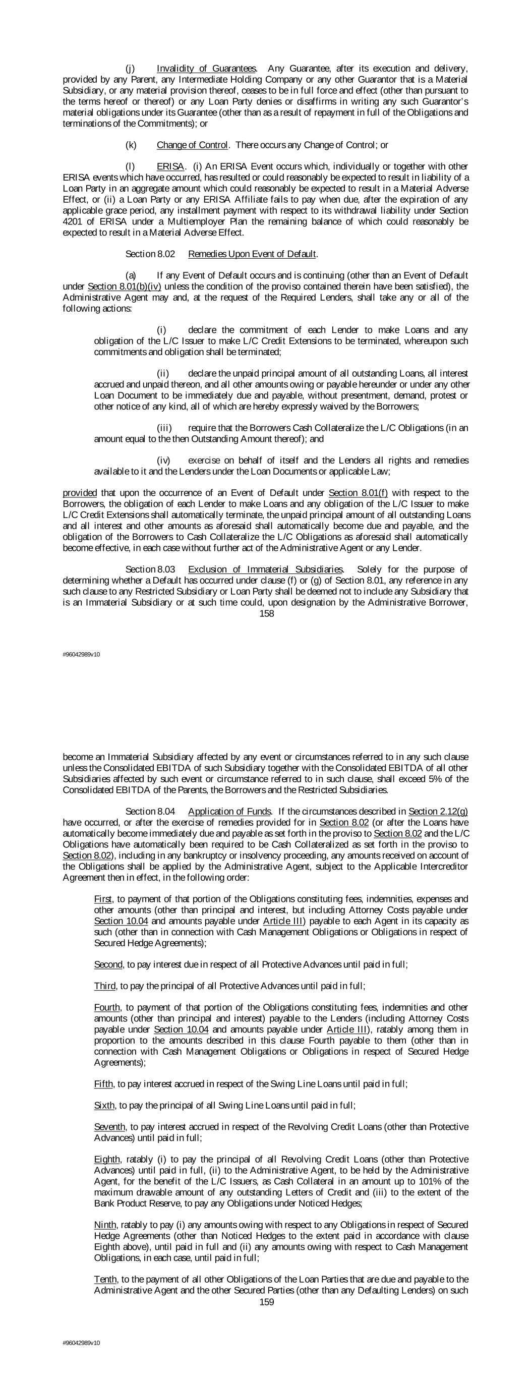 (j) Invalidity of Guarantees. Any Guarantee, after its execution and delivery, provided by any Parent, any Intermediate Holding Company or any other Guarantor that is a Material Subsidiary, or any material provision thereof, ceases to be in full force and effect (other than pursuant to the terms hereof or thereof) or any Loan Party denies or disaffirms in writing any such Guarantor’s material obligations under its Guarantee (other than as a result of repayment in full of the Obligations and terminations of the Commitments); or (k) Change of Control. There occurs any Change of Control; or (l) ERISA. (i) An ERISA Event occurs which, individually or together with other ERISA events which have occurred, has resulted or could reasonably be expected to result in liability of a Loan Party in an aggregate amount which could reasonably be expected to result in a Material Adverse Effect, or (ii) a Loan Party or any ERISA Affiliate fails to pay when due, after the expiration of any applicable grace period, any installment payment with respect to its withdrawal liability under Section 4201 of ERISA under a Multiemployer Plan the remaining balance of which could reasonably be expected to result in a Material Adverse Effect. Section 8.02 Remedies Upon Event of Default. (a) If any Event of Default occurs and is continuing (other than an Event of Default under Section 8.01(b)(iv) unless the condition of the proviso contained therein have been satisfied), the Administrative Agent may and, at the request of the Required Lenders, shall take any or all of the following actions: (i) declare the commitment of each Lender to make Loans and any obligation of the L/C Issuer to make L/C Credit Extensions to be terminated, whereupon such commitments and obligation shall be terminated; (ii) declare the unpaid principal amount of all outstanding Loans, all interest accrued and unpaid thereon, and all other amounts owing or payable hereunder or under any other Loan Document to be immediately due and payable, without presentment, demand, protest or other notice of any kind, all of which are hereby expressly waived by the Borrowers; (iii) require that the Borrowers Cash Collateralize the L/C Obligations (in an amount equal to the then Outstanding Amount thereof); and (iv) exercise on behalf of itself and the Lenders all rights and remedies available to it and the Lenders under the Loan Documents or applicable Law; provided that upon the occurrence of an Event of Default under Section 8.01(f) with respect to the Borrowers, the obligation of each Lender to make Loans and any obligation of the L/C Issuer to make L/C Credit Extensions shall automatically terminate, the unpaid principal amount of all outstanding Loans and all interest and other amounts as aforesaid shall automatically become due and payable, and the obligation of the Borrowers to Cash Collateralize the L/C Obligations as aforesaid shall automatically become effective, in each case without further act of the Administrative Agent or any Lender. Section 8.03 Exclusion of Immaterial Subsidiaries. Solely for the purpose of determining whether a Default has occurred under clause (f) or (g) of Section 8.01, any reference in any such clause to any Restricted Subsidiary or Loan Party shall be deemed not to include any Subsidiary that is an Immaterial Subsidiary or at such time could, upon designation by the Administrative Borrower, 158 #96042989v10 become an Immaterial Subsidiary affected by any event or circumstances referred to in any such clause unless the Consolidated EBITDA of such Subsidiary together with the Consolidated EBITDA of all other Subsidiaries affected by such event or circumstance referred to in such clause, shall exceed 5% of the Consolidated EBITDA of the Parents, the Borrowers and the Restricted Subsidiaries. Section 8.04 Application of Funds. If the circumstances described in Section 2.12(g) have occurred, or after the exercise of remedies provided for in Section 8.02 (or after the Loans have automatically become immediately due and payable as set forth in the proviso to Section 8.02 and the L/C Obligations have automatically been required to be Cash Collateralized as set forth in the proviso to Section 8.02), including in any bankruptcy or insolvency proceeding, any amounts received on account of the Obligations shall be applied by the Administrative Agent, subject to the Applicable Intercreditor Agreement then in effect, in the following order: First, to payment of that portion of the Obligations constituting fees, indemnities, expenses and other amounts (other than principal and interest, but including Attorney Costs payable under Section 10.04 and amounts payable under Article III) payable to each Agent in its capacity as such (other than in connection with Cash Management Obligations or Obligations in respect of Secured Hedge Agreements); Second, to pay interest due in respect of all Protective Advances until paid in full; Third, to pay the principal of all Protective Advances until paid in full; Fourth, to payment of that portion of the Obligations constituting fees, indemnities and other amounts (other than principal and interest) payable to the Lenders (including Attorney Costs payable under Section 10.04 and amounts payable under Article III), ratably among them in proportion to the amounts described in this clause Fourth payable to them (other than in connection with Cash Management Obligations or Obligations in respect of Secured Hedge Agreements); Fifth, to pay interest accrued in respect of the Swing Line Loans until paid in full; Sixth, to pay the principal of all Swing Line Loans until paid in full; Seventh, to pay interest accrued in respect of the Revolving Credit Loans (other than Protective Advances) until paid in full; Eighth, ratably (i) to pay the principal of all Revolving Credit Loans (other than Protective Advances) until paid in full, (ii) to the Administrative Agent, to be held by the Administrative Agent, for the b