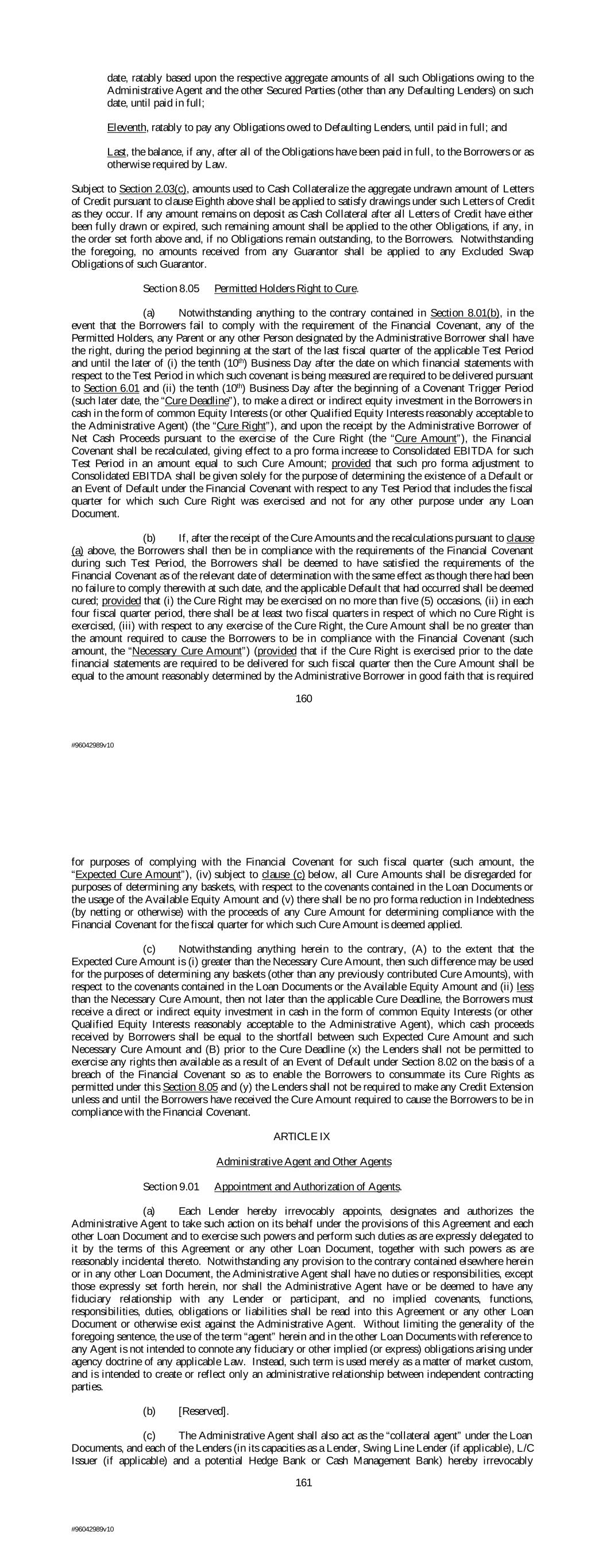 date, ratably based upon the respective aggregate amounts of all such Obligations owing to the Administrative Agent and the other Secured Parties (other than any Defaulting Lenders) on such date, until paid in full; Eleventh, ratably to pay any Obligations owed to Defaulting Lenders, until paid in full; and Last, the balance, if any, after all of the Obligations have been paid in full, to the Borrowers or as otherwise required by Law. Subject to Section 2.03(c), amounts used to Cash Collateralize the aggregate undrawn amount of Letters of Credit pursuant to clause Eighth above shall be applied to satisfy drawings under such Letters of Credit as they occur. If any amount remains on deposit as Cash Collateral after all Letters of Credit have either been fully drawn or expired, such remaining amount shall be applied to the other Obligations, if any, in the order set forth above and, if no Obligations remain outstanding, to the Borrowers. Notwithstanding the foregoing, no amounts received from any Guarantor shall be applied to any Excluded Swap Obligations of such Guarantor. Section 8.05 Permitted Holders Right to Cure. (a) Notwithstanding anything to the contrary contained in Section 8.01(b), in the event that the Borrowers fail to comply with the requirement of the Financial Covenant, any of the Permitted Holders, any Parent or any other Person designated by the Administrative Borrower shall have the right, during the period beginning at the start of the last fiscal quarter of the applicable Test Period and until the later of (i) the tenth (10th) Business Day after the date on which financial statements with respect to the Test Period in which such covenant is being measured are required to be delivered pursuant to Section 6.01 and (ii) the tenth (10th) Business Day after the beginning of a Covenant Trigger Period (such later date, the “Cure Deadline”), to make a direct or indirect equity investment in the Borrowers in cash in the form of common Equity Interests (or other Qualified Equity Interests reasonably acceptable to the Administrative Agent) (the “Cure Right”), and upon the receipt by the Administrative Borrower of Net Cash Proceeds pursuant to the exercise of the Cure Right (the “Cure Amount”), the Financial Covenant shall be recalculated, giving effect to a pro forma increase to Consolidated EBITDA for such Test Period in an amount equal to such Cure Amount; provided that such pro forma adjustment to Consolidated EBITDA shall be given solely for the purpose of determining the existence of a Default or an Event of Default under the Financial Covenant with respect to any Test Period that includes the fiscal quarter for which such Cure Right was exercised and not for any other purpose under any Loan Document. (b) If, after the receipt of the Cure Amounts and the recalculations pursuant to clause (a) above, the Borrowers shall then be in compliance with the requirements of the Financial Covenant during such Test Period, the Borrowers shall be deemed to have satisfied the requirements of the Financial Covenant as of the relevant date of determination with the same effect as though there had been no failure to comply therewith at such date, and the applicable Default that had occurred shall be deemed cured; provided that (i) the Cure Right may be exercised on no more than five (5) occasions, (ii) in each four fiscal quarter period, there shall be at least two fiscal quarters in respect of which no Cure Right is exercised, (iii) with respect to any exercise of the Cure Right, the Cure Amount shall be no greater than the amount required to cause the Borrowers to be in compliance with the Financial Covenant (such amount, the “Necessary Cure Amount”) (provided that if the Cure Right is exercised prior to the date financial statements are required to be delivered for such fiscal quarter then the Cure Amount shall be equal to the amount reasonably determined by the Administrative Borrower in good faith that is required 160 #96042989v10 for purposes of complying with the Financial Covenant for such fiscal quarter (such amount, the “Expected Cure Amount”), (iv) subject to clause (c) below, all Cure Amounts shall be disregarded for purposes of determining any baskets, with respect to the covenants contained in the Loan Documents or the usage of the Available Equity Amount and (v) there shall be no pro forma reduction in Indebtedness (by netting or otherwise) with the proceeds of any Cure Amount for determining compliance with the Financial Covenant for the fiscal quarter for which such Cure Amount is deemed applied. (c) Notwithstanding anything herein to the contrary, (A) to the extent that the Expected Cure Amount is (i) greater than the Necessary Cure Amount, then such difference may be used for the purposes of determining any baskets (other than any previously contributed Cure Amounts), with respect to the covenants contained in the Loan Documents or the Available Equity Amount and (ii) less than the Necessary Cure Amount, then not later than the applicable Cure Deadline, the Borrowers must receive a direct or indirect equity investment in cash in the form of common Equity Interests (or other Qualified Equity Interests reasonably acceptable to the Administrative Agent), which cash proceeds received by Borrowers shall be equal to the shortfall between such Expected Cure Amount and such Necessary Cure Amount and (B) prior to the Cure Deadline (x) the Lenders shall not be permitted to exercise any rights then available as a result of an Event of Default under Section 8.02 on the basis of a breach of the Financial Covenant so as to enable the Borrowers to consummate its Cure Rights as permitted under this Section 8.05 and (y) the Lenders shall not be required to make any Credit Extension unless and until the Borrowers have received the Cure Amount required to cause the Borrowers to be in compliance with the Financial Covenant. ARTICLE IX Administrative Agent and Other Agents S