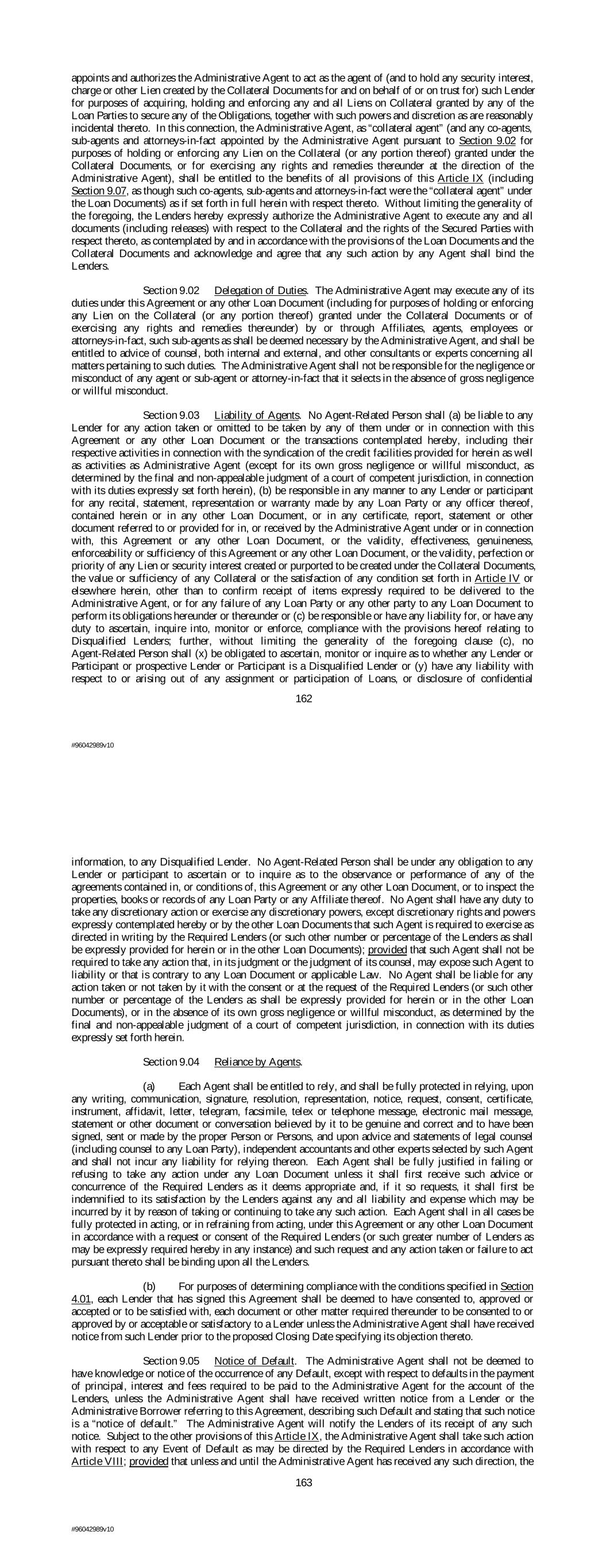 appoints and authorizes the Administrative Agent to act as the agent of (and to hold any security interest, charge or other Lien created by the Collateral Documents for and on behalf of or on trust for) such Lender for purposes of acquiring, holding and enforcing any and all Liens on Collateral granted by any of the Loan Parties to secure any of the Obligations, together with such powers and discretion as are reasonably incidental thereto. In this connection, the Administrative Agent, as “collateral agent” (and any co-agents, sub-agents and attorneys-in-fact appointed by the Administrative Agent pursuant to Section 9.02 for purposes of holding or enforcing any Lien on the Collateral (or any portion thereof) granted under the Collateral Documents, or for exercising any rights and remedies thereunder at the direction of the Administrative Agent), shall be entitled to the benefits of all provisions of this Article IX (including Section 9.07, as though such co-agents, sub-agents and attorneys-in-fact were the “collateral agent” under the Loan Documents) as if set forth in full herein with respect thereto. Without limiting the generality of the foregoing, the Lenders hereby expressly authorize the Administrative Agent to execute any and all documents (including releases) with respect to the Collateral and the rights of the Secured Parties with respect thereto, as contemplated by and in accordance with the provisions of the Loan Documents and the Collateral Documents and acknowledge and agree that any such action by any Agent shall bind the Lenders. Section 9.02 Delegation of Duties. The Administrative Agent may execute any of its duties under this Agreement or any other Loan Document (including for purposes of holding or enforcing any Lien on the Collateral (or any portion thereof) granted under the Collateral Documents or of exercising any rights and remedies thereunder) by or through Affiliates, agents, employees or attorneys-in-fact, such sub-agents as shall be deemed necessary by the Administrative Agent, and shall be entitled to advice of counsel, both internal and external, and other consultants or experts concerning all matters pertaining to such duties. The Administrative Agent shall not be responsible for the negligence or misconduct of any agent or sub-agent or attorney-in-fact that it selects in the absence of gross negligence or willful misconduct. Section 9.03 Liability of Agents. No Agent-Related Person shall (a) be liable to any Lender for any action taken or omitted to be taken by any of them under or in connection with this Agreement or any other Loan Document or the transactions contemplated hereby, including their respective activities in connection with the syndication of the credit facilities provided for herein as well as activities as Administrative Agent (except for its own gross negligence or willful misconduct, as determined by the final and non-appealable judgment of a court of competent jurisdiction, in connection with its duties expressly set forth herein), (b) be responsible in any manner to any Lender or participant for any recital, statement, representation or warranty made by any Loan Party or any officer thereof, contained herein or in any other Loan Document, or in any certificate, report, statement or other document referred to or provided for in, or received by the Administrative Agent under or in connection with, this Agreement or any other Loan Document, or the validity, effectiveness, genuineness, enforceability or sufficiency of this Agreement or any other Loan Document, or the validity, perfection or priority of any Lien or security interest created or purported to be created under the Collateral Documents, the value or sufficiency of any Collateral or the satisfaction of any condition set forth in Article IV or elsewhere herein, other than to confirm receipt of items expressly required to be delivered to the Administrative Agent, or for any failure of any Loan Party or any other party to any Loan Document to perform its obligations hereunder or thereunder or (c) be responsible or have any liability for, or have any duty to ascertain, inquire into, monitor or enforce, compliance with the provisions hereof relating to Disqualified Lenders; further, without limiting the generality of the foregoing clause (c), no Agent-Related Person shall (x) be obligated to ascertain, monitor or inquire as to whether any Lender or Participant or prospective Lender or Participant is a Disqualified Lender or (y) have any liability with respect to or arising out of any assignment or participation of Loans, or disclosure of confidential 162 #96042989v10 information, to any Disqualified Lender. No Agent-Related Person shall be under any obligation to any Lender or participant to ascertain or to inquire as to the observance or performance of any of the agreements contained in, or conditions of, this Agreement or any other Loan Document, or to inspect the properties, books or records of any Loan Party or any Affiliate thereof. No Agent shall have any duty to take any discretionary action or exercise any discretionary powers, except discretionary rights and powers expressly contemplated hereby or by the other Loan Documents that such Agent is required to exercise as directed in writing by the Required Lenders (or such other number or percentage of the Lenders as shall be expressly provided for herein or in the other Loan Documents); provided that such Agent shall not be required to take any action that, in its judgment or the judgment of its counsel, may expose such Agent to liability or that is contrary to any Loan Document or applicable Law. No Agent shall be liable for any action taken or not taken by it with the consent or at the request of the Required Lenders (or such other number or percentage of the Lenders as shall be expressly provided for herein or in the other Loan Documents), or in the absence of its own gross negligence or willful misconduct, as determine