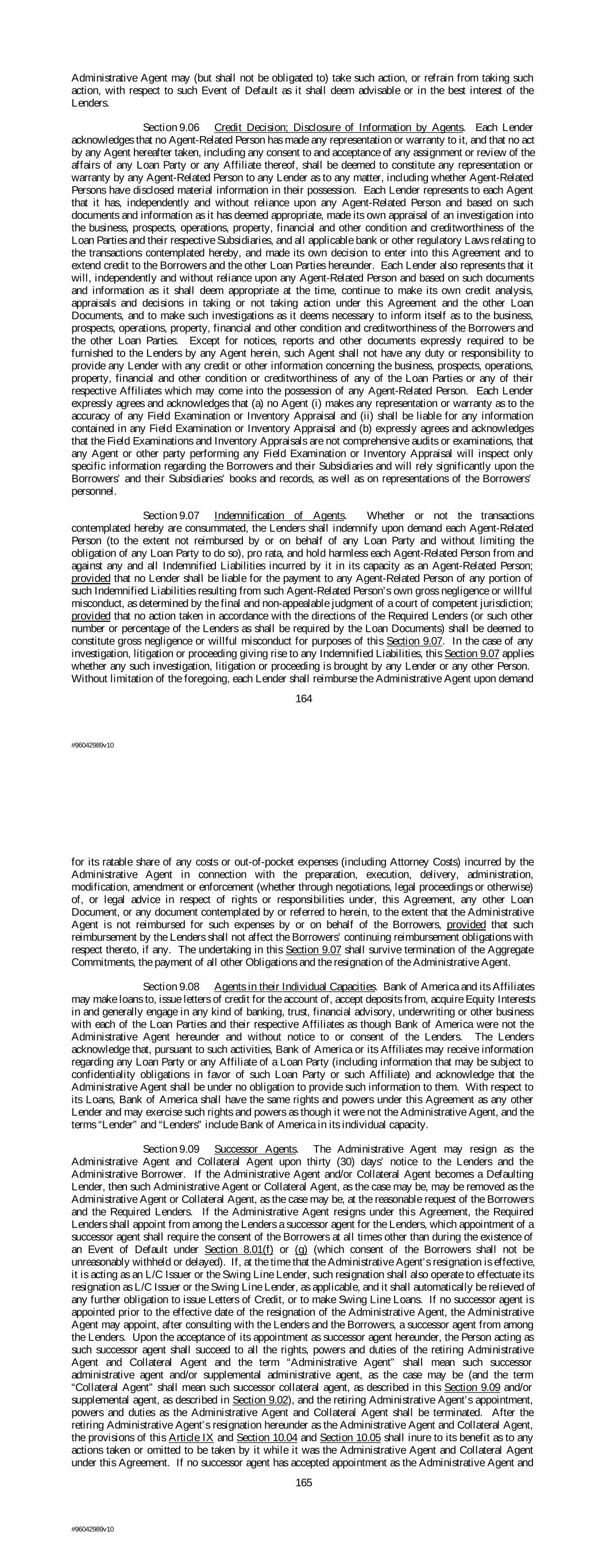 Administrative Agent may (but shall not be obligated to) take such action, or refrain from taking such action, with respect to such Event of Default as it shall deem advisable or in the best interest of the Lenders. Section 9.06 Credit Decision; Disclosure of Information by Agents. Each Lender acknowledges that no Agent-Related Person has made any representation or warranty to it, and that no act by any Agent hereafter taken, including any consent to and acceptance of any assignment or review of the affairs of any Loan Party or any Affiliate thereof, shall be deemed to constitute any representation or warranty by any Agent-Related Person to any Lender as to any matter, including whether Agent-Related Persons have disclosed material information in their possession. Each Lender represents to each Agent that it has, independently and without reliance upon any Agent-Related Person and based on such documents and information as it has deemed appropriate, made its own appraisal of an investigation into the business, prospects, operations, property, financial and other condition and creditworthiness of the Loan Parties and their respective Subsidiaries, and all applicable bank or other regulatory Laws relating to the transactions contemplated hereby, and made its own decision to enter into this Agreement and to extend credit to the Borrowers and the other Loan Parties hereunder. Each Lender also represents that it will, independently and without reliance upon any Agent-Related Person and based on such documents and information as it shall deem appropriate at the time, continue to make its own credit analysis, appraisals and decisions in taking or not taking action under this Agreement and the other Loan Documents, and to make such investigations as it deems necessary to inform itself as to the business, prospects, operations, property, financial and other condition and creditworthiness of the Borrowers and the other Loan Parties. Except for notices, reports and other documents expressly required to be furnished to the Lenders by any Agent herein, such Agent shall not have any duty or responsibility to provide any Lender with any credit or other information concerning the business, prospects, operations, property, financial and other condition or creditworthiness of any of the Loan Parties or any of their respective Affiliates which may come into the possession of any Agent-Related Person. Each Lender expressly agrees and acknowledges that (a) no Agent (i) makes any representation or warranty as to the accuracy of any Field Examination or Inventory Appraisal and (ii) shall be liable for any information contained in any Field Examination or Inventory Appraisal and (b) expressly agrees and acknowledges that the Field Examinations and Inventory Appraisals are not comprehensive audits or examinations, that any Agent or other party performing any Field Examination or Inventory Appraisal will inspect only specific information regarding the Borrowers and their Subsidiaries and will rely significantly upon the Borrowers’ and their Subsidiaries’ books and records, as well as on representations of the Borrowers’ personnel. Section 9.07 Indemnification of Agents. Whether or not the transactions contemplated hereby are consummated, the Lenders shall indemnify upon demand each Agent-Related Person (to the extent not reimbursed by or on behalf of any Loan Party and without limiting the obligation of any Loan Party to do so), pro rata, and hold harmless each Agent-Related Person from and against any and all Indemnified Liabilities incurred by it in its capacity as an Agent-Related Person; provided that no Lender shall be liable for the payment to any Agent-Related Person of any portion of such Indemnified Liabilities resulting from such Agent-Related Person’s own gross negligence or willful misconduct, as determined by the final and non-appealable judgment of a court of competent jurisdiction; provided that no action taken in accordance with the directions of the Required Lenders (or such other number or percentage of the Lenders as shall be required by the Loan Documents) shall be deemed to constitute gross negligence or willful misconduct for purposes of this Section 9.07. In the case of any investigation, litigation or proceeding giving rise to any Indemnified Liabilities, this Section 9.07 applies whether any such investigation, litigation or proceeding is brought by any Lender or any other Person. Without limitation of the foregoing, each Lender shall reimburse the Administrative Agent upon demand 164 #96042989v10 for its ratable share of any costs or out-of-pocket expenses (including Attorney Costs) incurred by the Administrative Agent in connection with the preparation, execution, delivery, administration, modification, amendment or enforcement (whether through negotiations, legal proceedings or otherwise) of, or legal advice in respect of rights or responsibilities under, this Agreement, any other Loan Document, or any document contemplated by or referred to herein, to the extent that the Administrative Agent is not reimbursed for such expenses by or on behalf of the Borrowers, provided that such reimbursement by the Lenders shall not affect the Borrowers’ continuing reimbursement obligations with respect thereto, if any. The undertaking in this Section 9.07 shall survive termination of the Aggregate Commitments, the payment of all other Obligations and the resignation of the Administrative Agent. Section 9.08 Agents in their Individual Capacities. Bank of America and its Affiliates may make loans to, issue letters of credit for the account of, accept deposits from, acquire Equity Interests in and generally engage in any kind of banking, trust, financial advisory, underwriting or other business with each of the Loan Parties and their respective Affiliates as though Bank of America were not the Administrative Agent hereunder and without notice to or consent of the Lenders. The Lenders acknowle