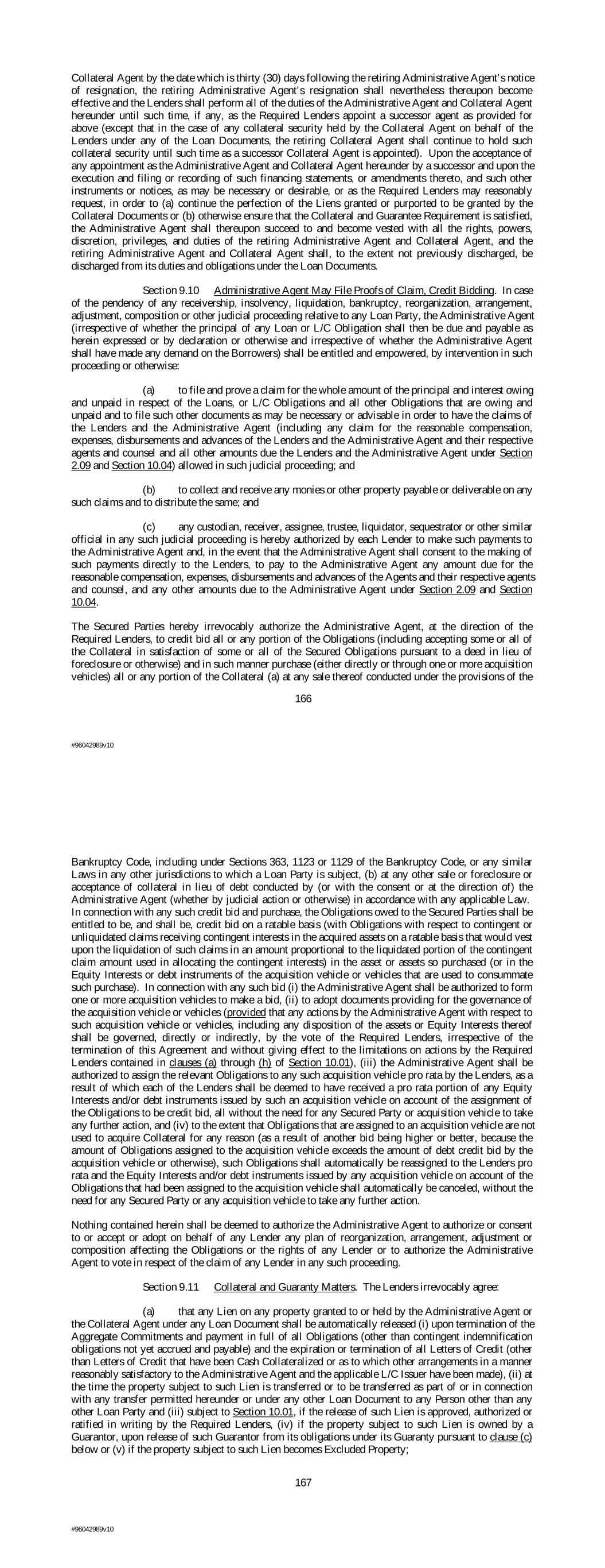 Collateral Agent by the date which is thirty (30) days following the retiring Administrative Agent’s notice of resignation, the retiring Administrative Agent’s resignation shall nevertheless thereupon become effective and the Lenders shall perform all of the duties of the Administrative Agent and Collateral Agent hereunder until such time, if any, as the Required Lenders appoint a successor agent as provided for above (except that in the case of any collateral security held by the Collateral Agent on behalf of the Lenders under any of the Loan Documents, the retiring Collateral Agent shall continue to hold such collateral security until such time as a successor Collateral Agent is appointed). Upon the acceptance of any appointment as the Administrative Agent and Collateral Agent hereunder by a successor and upon the execution and filing or recording of such financing statements, or amendments thereto, and such other instruments or notices, as may be necessary or desirable, or as the Required Lenders may reasonably request, in order to (a) continue the perfection of the Liens granted or purported to be granted by the Collateral Documents or (b) otherwise ensure that the Collateral and Guarantee Requirement is satisfied, the Administrative Agent shall thereupon succeed to and become vested with all the rights, powers, discretion, privileges, and duties of the retiring Administrative Agent and Collateral Agent, and the retiring Administrative Agent and Collateral Agent shall, to the extent not previously discharged, be discharged from its duties and obligations under the Loan Documents. Section 9.10 Administrative Agent May File Proofs of Claim, Credit Bidding. In case of the pendency of any receivership, insolvency, liquidation, bankruptcy, reorganization, arrangement, adjustment, composition or other judicial proceeding relative to any Loan Party, the Administrative Agent (irrespective of whether the principal of any Loan or L/C Obligation shall then be due and payable as herein expressed or by declaration or otherwise and irrespective of whether the Administrative Agent shall have made any demand on the Borrowers) shall be entitled and empowered, by intervention in such proceeding or otherwise: (a) to file and prove a claim for the whole amount of the principal and interest owing and unpaid in respect of the Loans, or L/C Obligations and all other Obligations that are owing and unpaid and to file such other documents as may be necessary or advisable in order to have the claims of the Lenders and the Administrative Agent (including any claim for the reasonable compensation, expenses, disbursements and advances of the Lenders and the Administrative Agent and their respective agents and counsel and all other amounts due the Lenders and the Administrative Agent under Section 2.09 and Section 10.04) allowed in such judicial proceeding; and (b) to collect and receive any monies or other property payable or deliverable on any such claims and to distribute the same; and (c) any custodian, receiver, assignee, trustee, liquidator, sequestrator or other similar official in any such judicial proceeding is hereby authorized by each Lender to make such payments to the Administrative Agent and, in the event that the Administrative Agent shall consent to the making of such payments directly to the Lenders, to pay to the Administrative Agent any amount due for the reasonable compensation, expenses, disbursements and advances of the Agents and their respective agents and counsel, and any other amounts due to the Administrative Agent under Section 2.09 and Section 10.04. The Secured Parties hereby irrevocably authorize the Administrative Agent, at the direction of the Required Lenders, to credit bid all or any portion of the Obligations (including accepting some or all of the Collateral in satisfaction of some or all of the Secured Obligations pursuant to a deed in lieu of foreclosure or otherwise) and in such manner purchase (either directly or through one or more acquisition vehicles) all or any portion of the Collateral (a) at any sale thereof conducted under the provisions of the 166 #96042989v10 Bankruptcy Code, including under Sections 363, 1123 or 1129 of the Bankruptcy Code, or any similar Laws in any other jurisdictions to which a Loan Party is subject, (b) at any other sale or foreclosure or acceptance of collateral in lieu of debt conducted by (or with the consent or at the direction of) the Administrative Agent (whether by judicial action or otherwise) in accordance with any applicable Law. In connection with any such credit bid and purchase, the Obligations owed to the Secured Parties shall be entitled to be, and shall be, credit bid on a ratable basis (with Obligations with respect to contingent or unliquidated claims receiving contingent interests in the acquired assets on a ratable basis that would vest upon the liquidation of such claims in an amount proportional to the liquidated portion of the contingent claim amount used in allocating the contingent interests) in the asset or assets so purchased (or in the Equity Interests or debt instruments of the acquisition vehicle or vehicles that are used to consummate such purchase). In connection with any such bid (i) the Administrative Agent shall be authorized to form one or more acquisition vehicles to make a bid, (ii) to adopt documents providing for the governance of the acquisition vehicle or vehicles (provided that any actions by the Administrative Agent with respect to such acquisition vehicle or vehicles, including any disposition of the assets or Equity Interests thereof shall be governed, directly or indirectly, by the vote of the Required Lenders, irrespective of the termination of this Agreement and without giving effect to the limitations on actions by the Required Lenders contained in clauses (a) through (h) of Section 10.01), (iii) the Administrative Agent shall be authorized to assign the relevant Obligations to any such acq