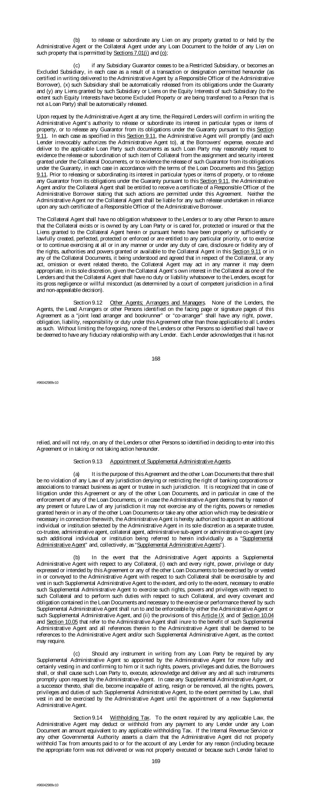 (b) to release or subordinate any Lien on any property granted to or held by the Administrative Agent or the Collateral Agent under any Loan Document to the holder of any Lien on such property that is permitted by Sections 7.01(i) and (o); (c) if any Subsidiary Guarantor ceases to be a Restricted Subsidiary, or becomes an Excluded Subsidiary, in each case as a result of a transaction or designation permitted hereunder (as certified in writing delivered to the Administrative Agent by a Responsible Officer of the Administrative Borrower), (x) such Subsidiary shall be automatically released from its obligations under the Guaranty and (y) any Liens granted by such Subsidiary or Liens on the Equity Interests of such Subsidiary (to the extent such Equity Interests have become Excluded Property or are being transferred to a Person that is not a Loan Party) shall be automatically released. Upon request by the Administrative Agent at any time, the Required Lenders will confirm in writing the Administrative Agent’s authority to release or subordinate its interest in particular types or items of property, or to release any Guarantor from its obligations under the Guaranty pursuant to this Section 9.11. In each case as specified in this Section 9.11, the Administrative Agent will promptly (and each Lender irrevocably authorizes the Administrative Agent to), at the Borrowers’ expense, execute and deliver to the applicable Loan Party such documents as such Loan Party may reasonably request to evidence the release or subordination of such item of Collateral from the assignment and security interest granted under the Collateral Documents, or to evidence the release of such Guarantor from its obligations under the Guaranty, in each case in accordance with the terms of the Loan Documents and this Section 9.11. Prior to releasing or subordinating its interest in particular types or items of property, or to release any Guarantor from its obligations under the Guaranty pursuant to this Section 9.11, the Administrative Agent and/or the Collateral Agent shall be entitled to receive a certificate of a Responsible Officer of the Administrative Borrower stating that such actions are permitted under this Agreement. Neither the Administrative Agent nor the Collateral Agent shall be liable for any such release undertaken in reliance upon any such certificate of a Responsible Officer of the Administrative Borrower. The Collateral Agent shall have no obligation whatsoever to the Lenders or to any other Person to assure that the Collateral exists or is owned by any Loan Party or is cared for, protected or insured or that the Liens granted to the Collateral Agent herein or pursuant hereto have been properly or sufficiently or lawfully created, perfected, protected or enforced or are entitled to any particular priority, or to exercise or to continue exercising at all or in any manner or under any duty of care, disclosure or fidelity any of the rights, authorities and powers granted or available to the Collateral Agent in this Section 9.11 or in any of the Collateral Documents, it being understood and agreed that in respect of the Collateral, or any act, omission or event related thereto, the Collateral Agent may act in any manner it may deem appropriate, in its sole discretion, given the Collateral Agent’s own interest in the Collateral as one of the Lenders and that the Collateral Agent shall have no duty or liability whatsoever to the Lenders, except for its gross negligence or willful misconduct (as determined by a court of competent jurisdiction in a final and non-appealable decision). Section 9.12 Other Agents; Arrangers and Managers. None of the Lenders, the Agents, the Lead Arrangers or other Persons identified on the facing page or signature pages of this Agreement as a “joint lead arranger and bookrunner” or “co-arranger” shall have any right, power, obligation, liability, responsibility or duty under this Agreement other than those applicable to all Lenders as such. Without limiting the foregoing, none of the Lenders or other Persons so identified shall have or be deemed to have any fiduciary relationship with any Lender. Each Lender acknowledges that it has not 168 #96042989v10 relied, and will not rely, on any of the Lenders or other Persons so identified in deciding to enter into this Agreement or in taking or not taking action hereunder. Section 9.13 Appointment of Supplemental Administrative Agents. (a) It is the purpose of this Agreement and the other Loan Documents that there shall be no violation of any Law of any jurisdiction denying or restricting the right of banking corporations or associations to transact business as agent or trustee in such jurisdiction. It is recognized that in case of litigation under this Agreement or any of the other Loan Documents, and in particular in case of the enforcement of any of the Loan Documents, or in case the Administrative Agent deems that by reason of any present or future Law of any jurisdiction it may not exercise any of the rights, powers or remedies granted herein or in any of the other Loan Documents or take any other action which may be desirable or necessary in connection therewith, the Administrative Agent is hereby authorized to appoint an additional individual or institution selected by the Administrative Agent in its sole discretion as a separate trustee, co-trustee, administrative agent, collateral agent, administrative sub-agent or administrative co-agent (any such additional individual or institution being referred to herein individually as a “Supplemental Administrative Agent” and, collectively, as “Supplemental Administrative Agents”). (b) In the event that the Administrative Agent appoints a Supplemental Administrative Agent with respect to any Collateral, (i) each and every right, power, privilege or duty expressed or intended by this Agreement or any of the other Loan Documents to be exercised by or vested in or conveyed t