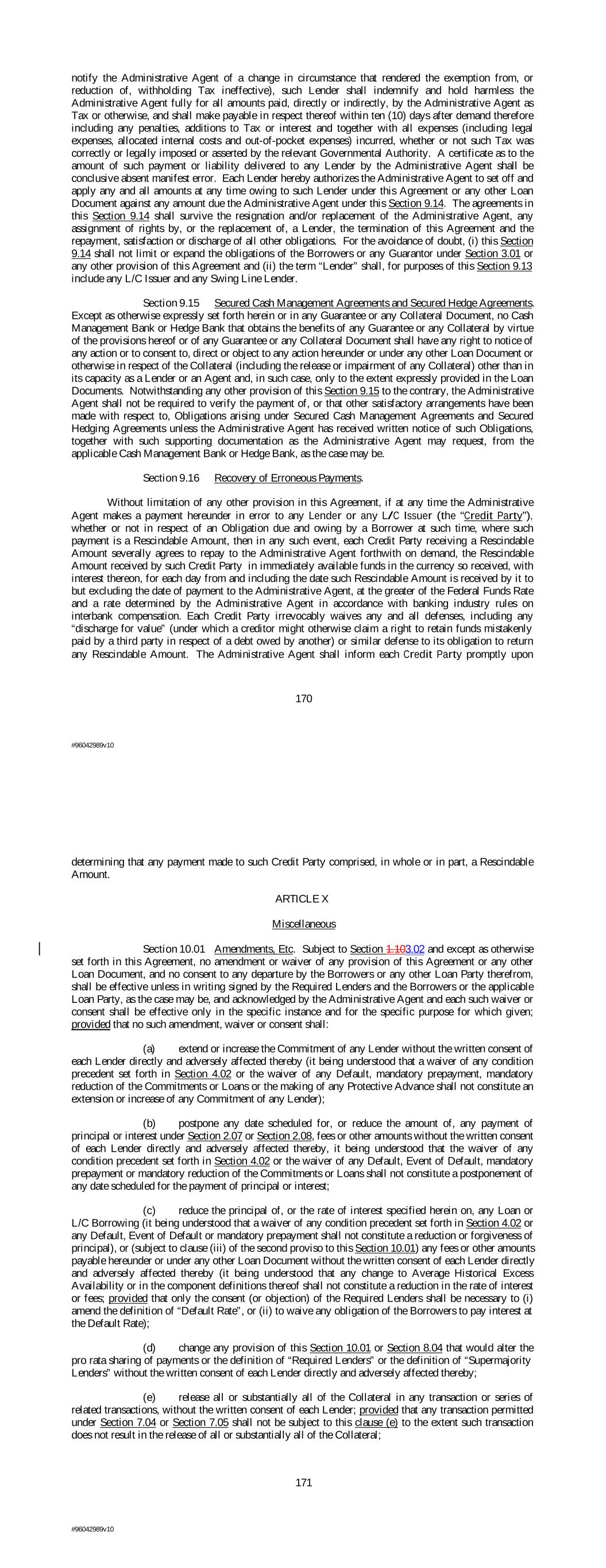 notify the Administrative Agent of a change in circumstance that rendered the exemption from, or reduction of, withholding Tax ineffective), such Lender shall indemnify and hold harmless the Administrative Agent fully for all amounts paid, directly or indirectly, by the Administrative Agent as Tax or otherwise, and shall make payable in respect thereof within ten (10) days after demand therefore including any penalties, additions to Tax or interest and together with all expenses (including legal expenses, allocated internal costs and out-of-pocket expenses) incurred, whether or not such Tax was correctly or legally imposed or asserted by the relevant Governmental Authority. A certificate as to the amount of such payment or liability delivered to any Lender by the Administrative Agent shall be conclusive absent manifest error. Each Lender hereby authorizes the Administrative Agent to set off and apply any and all amounts at any time owing to such Lender under this Agreement or any other Loan Document against any amount due the Administrative Agent under this Section 9.14. The agreements in this Section 9.14 shall survive the resignation and/or replacement of the Administrative Agent, any assignment of rights by, or the replacement of, a Lender, the termination of this Agreement and the repayment, satisfaction or discharge of all other obligations. For the avoidance of doubt, (i) this Section 9.14 shall not limit or expand the obligations of the Borrowers or any Guarantor under Section 3.01 or any other provision of this Agreement and (ii) the term “Lender” shall, for purposes of this Section 9.13 include any L/C Issuer and any Swing Line Lender. Section 9.15 Secured Cash Management Agreements and Secured Hedge Agreements. Except as otherwise expressly set forth herein or in any Guarantee or any Collateral Document, no Cash Management Bank or Hedge Bank that obtains the benefits of any Guarantee or any Collateral by virtue of the provisions hereof or of any Guarantee or any Collateral Document shall have any right to notice of any action or to consent to, direct or object to any action hereunder or under any other Loan Document or otherwise in respect of the Collateral (including the release or impairment of any Collateral) other than in its capacity as a Lender or an Agent and, in such case, only to the extent expressly provided in the Loan Documents. Notwithstanding any other provision of this Section 9.15 to the contrary, the Administrative Agent shall not be required to verify the payment of, or that other satisfactory arrangements have been made with respect to, Obligations arising under Secured Cash Management Agreements and Secured Hedging Agreements unless the Administrative Agent has received written notice of such Obligations, together with such supporting documentation as the Administrative Agent may request, from the applicable Cash Management Bank or Hedge Bank, as the case may be. Section 9.16 Recovery of Erroneous Payments. Without limitation of any other provision in this Agreement, if at any time the Administrative Agent makes a payment hereunder in error to any Lender or any L/C Issuer (the “Credit Party”), whether or not in respect of an Obligation due and owing by a Borrower at such time, where such payment is a Rescindable Amount, then in any such event, each Credit Party receiving a Rescindable Amount severally agrees to repay to the Administrative Agent forthwith on demand, the Rescindable Amount received by such Credit Party in immediately available funds in the currency so received, with interest thereon, for each day from and including the date such Rescindable Amount is received by it to but excluding the date of payment to the Administrative Agent, at the greater of the Federal Funds Rate and a rate determined by the Administrative Agent in accordance with banking industry rules on interbank compensation. Each Credit Party irrevocably waives any and all defenses, including any “discharge for value” (under which a creditor might otherwise claim a right to retain funds mistakenly paid by a third party in respect of a debt owed by another) or similar defense to its obligation to return any Rescindable Amount. The Administrative Agent shall inform each Credit Party promptly upon 170 #96042989v10 determining that any payment made to such Credit Party comprised, in whole or in part, a Rescindable Amount. ARTICLE X Miscellaneous Section 10.01 Amendments, Etc. Subject to Section 1.103.02 and except as otherwise set forth in this Agreement, no amendment or waiver of any provision of this Agreement or any other Loan Document, and no consent to any departure by the Borrowers or any other Loan Party therefrom, shall be effective unless in writing signed by the Required Lenders and the Borrowers or the applicable Loan Party, as the case may be, and acknowledged by the Administrative Agent and each such waiver or consent shall be effective only in the specific instance and for the specific purpose for which given; provided that no such amendment, waiver or consent shall: (a) extend or increase the Commitment of any Lender without the written consent of each Lender directly and adversely affected thereby (it being understood that a waiver of any condition precedent set forth in Section 4.02 or the waiver of any Default, mandatory prepayment, mandatory reduction of the Commitments or Loans or the making of any Protective Advance shall not constitute an extension or increase of any Commitment of any Lender); (b) postpone any date scheduled for, or reduce the amount of, any payment of principal or interest under Section 2.07 or Section 2.08, fees or other amounts without the written consent of each Lender directly and adversely affected thereby, it being understood that the waiver of any condition precedent set forth in Section 4.02 or the waiver of any Default, Event of Default, mandatory prepayment or mandatory reduction of the Commitments or Loans shall not constit