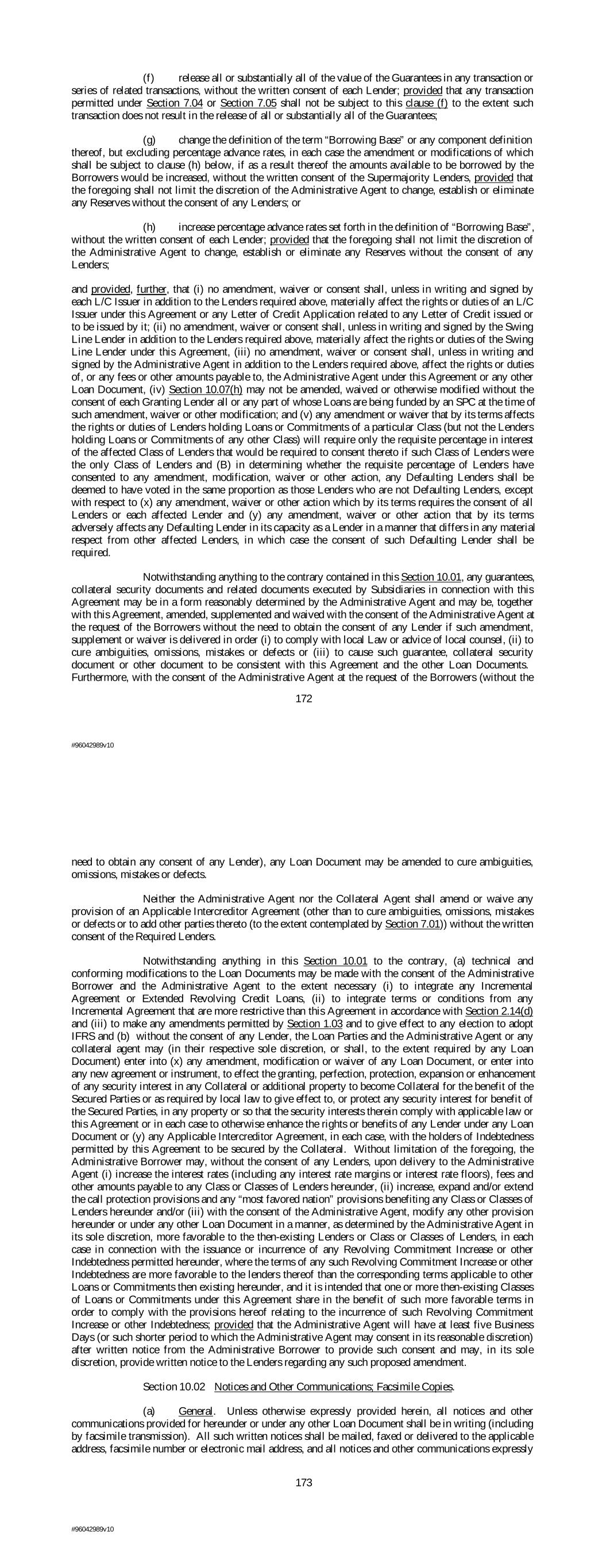 (f) release all or substantially all of the value of the Guarantees in any transaction or series of related transactions, without the written consent of each Lender; provided that any transaction permitted under Section 7.04 or Section 7.05 shall not be subject to this clause (f) to the extent such transaction does not result in the release of all or substantially all of the Guarantees; (g) change the definition of the term “Borrowing Base” or any component definition thereof, but excluding percentage advance rates, in each case the amendment or modifications of which shall be subject to clause (h) below, if as a result thereof the amounts available to be borrowed by the Borrowers would be increased, without the written consent of the Supermajority Lenders, provided that the foregoing shall not limit the discretion of the Administrative Agent to change, establish or eliminate any Reserves without the consent of any Lenders; or (h) increase percentage advance rates set forth in the definition of “Borrowing Base”, without the written consent of each Lender; provided that the foregoing shall not limit the discretion of the Administrative Agent to change, establish or eliminate any Reserves without the consent of any Lenders; and provided, further, that (i) no amendment, waiver or consent shall, unless in writing and signed by each L/C Issuer in addition to the Lenders required above, materially affect the rights or duties of an L/C Issuer under this Agreement or any Letter of Credit Application related to any Letter of Credit issued or to be issued by it; (ii) no amendment, waiver or consent shall, unless in writing and signed by the Swing Line Lender in addition to the Lenders required above, materially affect the rights or duties of the Swing Line Lender under this Agreement, (iii) no amendment, waiver or consent shall, unless in writing and signed by the Administrative Agent in addition to the Lenders required above, affect the rights or duties of, or any fees or other amounts payable to, the Administrative Agent under this Agreement or any other Loan Document, (iv) Section 10.07(h) may not be amended, waived or otherwise modified without the consent of each Granting Lender all or any part of whose Loans are being funded by an SPC at the time of such amendment, waiver or other modification; and (v) any amendment or waiver that by its terms affects the rights or duties of Lenders holding Loans or Commitments of a particular Class (but not the Lenders holding Loans or Commitments of any other Class) will require only the requisite percentage in interest of the affected Class of Lenders that would be required to consent thereto if such Class of Lenders were the only Class of Lenders and (B) in determining whether the requisite percentage of Lenders have consented to any amendment, modification, waiver or other action, any Defaulting Lenders shall be deemed to have voted in the same proportion as those Lenders who are not Defaulting Lenders, except with respect to (x) any amendment, waiver or other action which by its terms requires the consent of all Lenders or each affected Lender and (y) any amendment, waiver or other action that by its terms adversely affects any Defaulting Lender in its capacity as a Lender in a manner that differs in any material respect from other affected Lenders, in which case the consent of such Defaulting Lender shall be required. Notwithstanding anything to the contrary contained in this Section 10.01, any guarantees, collateral security documents and related documents executed by Subsidiaries in connection with this Agreement may be in a form reasonably determined by the Administrative Agent and may be, together with this Agreement, amended, supplemented and waived with the consent of the Administrative Agent at the request of the Borrowers without the need to obtain the consent of any Lender if such amendment, supplement or waiver is delivered in order (i) to comply with local Law or advice of local counsel, (ii) to cure ambiguities, omissions, mistakes or defects or (iii) to cause such guarantee, collateral security document or other document to be consistent with this Agreement and the other Loan Documents. Furthermore, with the consent of the Administrative Agent at the request of the Borrowers (without the 172 #96042989v10 need to obtain any consent of any Lender), any Loan Document may be amended to cure ambiguities, omissions, mistakes or defects. Neither the Administrative Agent nor the Collateral Agent shall amend or waive any provision of an Applicable Intercreditor Agreement (other than to cure ambiguities, omissions, mistakes or defects or to add other parties thereto (to the extent contemplated by Section 7.01)) without the written consent of the Required Lenders. Notwithstanding anything in this Section 10.01 to the contrary, (a) technical and conforming modifications to the Loan Documents may be made with the consent of the Administrative Borrower and the Administrative Agent to the extent necessary (i) to integrate any Incremental Agreement or Extended Revolving Credit Loans, (ii) to integrate terms or conditions from any Incremental Agreement that are more restrictive than this Agreement in accordance with Section 2.14(d) and (iii) to make any amendments permitted by Section 1.03 and to give effect to any election to adopt IFRS and (b) without the consent of any Lender, the Loan Parties and the Administrative Agent or any collateral agent may (in their respective sole discretion, or shall, to the extent required by any Loan Document) enter into (x) any amendment, modification or waiver of any Loan Document, or enter into any new agreement or instrument, to effect the granting, perfection, protection, expansion or enhancement of any security interest in any Collateral or additional property to become Collateral for the benefit of the Secured Parties or as required by local law to give effect to, or protect any security interest for benefi