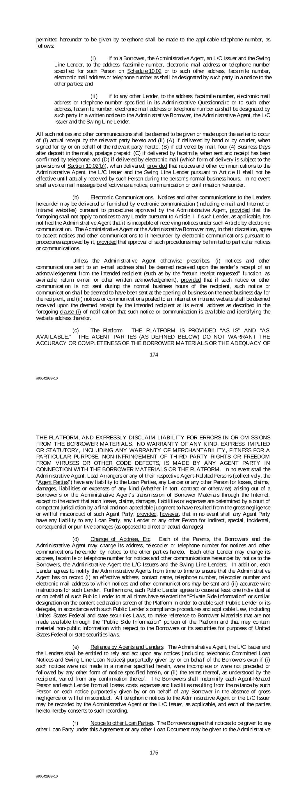 permitted hereunder to be given by telephone shall be made to the applicable telephone number, as follows: (i) if to a Borrower, the Administrative Agent, an L/C Issuer and the Swing Line Lender, to the address, facsimile number, electronic mail address or telephone number specified for such Person on Schedule 10.02 or to such other address, facsimile number, electronic mail address or telephone number as shall be designated by such party in a notice to the other parties; and (ii) if to any other Lender, to the address, facsimile number, electronic mail address or telephone number specified in its Administrative Questionnaire or to such other address, facsimile number, electronic mail address or telephone number as shall be designated by such party in a written notice to the Administrative Borrower, the Administrative Agent, the L/C Issuer and the Swing Line Lender. All such notices and other communications shall be deemed to be given or made upon the earlier to occur of (i) actual receipt by the relevant party hereto and (ii) (A) if delivered by hand or by courier, when signed for by or on behalf of the relevant party hereto; (B) if delivered by mail, four (4) Business Days after deposit in the mails, postage prepaid; (C) if delivered by facsimile, when sent and receipt has been confirmed by telephone; and (D) if delivered by electronic mail (which form of delivery is subject to the provisions of Section 10.02(b)), when delivered; provided that notices and other communications to the Administrative Agent, the L/C Issuer and the Swing Line Lender pursuant to Article II shall not be effective until actually received by such Person during the person’s normal business hours. In no event shall a voice mail message be effective as a notice, communication or confirmation hereunder. (b) Electronic Communications. Notices and other communications to the Lenders hereunder may be delivered or furnished by electronic communication (including e-mail and Internet or intranet websites) pursuant to procedures approved by the Administrative Agent, provided that the foregoing shall not apply to notices to any Lender pursuant to Article II if such Lender, as applicable, has notified the Administrative Agent that it is incapable of receiving notices under such Article by electronic communication. The Administrative Agent or the Administrative Borrower may, in their discretion, agree to accept notices and other communications to it hereunder by electronic communications pursuant to procedures approved by it, provided that approval of such procedures may be limited to particular notices or communications. Unless the Administrative Agent otherwise prescribes, (i) notices and other communications sent to an e-mail address shall be deemed received upon the sender’s receipt of an acknowledgement from the intended recipient (such as by the “return receipt requested” function, as available, return e-mail or other written acknowledgement), provided that if such notice or other communication is not sent during the normal business hours of the recipient, such notice or communication shall be deemed to have been sent at the opening of business on the next business day for the recipient, and (ii) notices or communications posted to an Internet or intranet website shall be deemed received upon the deemed receipt by the intended recipient at its e-mail address as described in the foregoing clause (i) of notification that such notice or communication is available and identifying the website address therefor. (c) The Platform. THE PLATFORM IS PROVIDED “AS IS” AND “AS AVAILABLE.” THE AGENT PARTIES (AS DEFINED BELOW) DO NOT WARRANT THE ACCURACY OR COMPLETENESS OF THE BORROWER MATERIALS OR THE ADEQUACY OF 174 #96042989v10 THE PLATFORM, AND EXPRESSLY DISCLAIM LIABILITY FOR ERRORS IN OR OMISSIONS FROM THE BORROWER MATERIALS. NO WARRANTY OF ANY KIND, EXPRESS, IMPLIED OR STATUTORY, INCLUDING ANY WARRANTY OF MERCHANTABILITY, FITNESS FOR A PARTICULAR PURPOSE, NON-INFRINGEMENT OF THIRD PARTY RIGHTS OR FREEDOM FROM VIRUSES OR OTHER CODE DEFECTS, IS MADE BY ANY AGENT PARTY IN CONNECTION WITH THE BORROWER MATERIALS OR THE PLATFORM. In no event shall the Administrative Agent, Lead Arrangers or any of their respective Agent-Related Persons (collectively, the “Agent Parties”) have any liability to the Loan Parties, any Lender or any other Person for losses, claims, damages, liabilities or expenses of any kind (whether in tort, contract or otherwise) arising out of a Borrower’s or the Administrative Agent’s transmission of Borrower Materials through the Internet, except to the extent that such losses, claims, damages, liabilities or expenses are determined by a court of competent jurisdiction by a final and non-appealable judgment to have resulted from the gross negligence or willful misconduct of such Agent Party; provided, however, that in no event shall any Agent Party have any liability to any Loan Party, any Lender or any other Person for indirect, special, incidental, consequential or punitive damages (as opposed to direct or actual damages). (d) Change of Address, Etc. Each of the Parents, the Borrowers and the Administrative Agent may change its address, telecopier or telephone number for notices and other communications hereunder by notice to the other parties hereto. Each other Lender may change its address, facsimile or telephone number for notices and other communications hereunder by notice to the Borrowers, the Administrative Agent the L/C Issuers and the Swing Line Lenders. In addition, each Lender agrees to notify the Administrative Agents from time to time to ensure that the Administrative Agent has on record (i) an effective address, contact name, telephone number, telecopier number and electronic mail address to which notices and other communications may be sent and (ii) accurate wire instructions for such Lender. Furthermore, each Public Lender agrees to cause at least one individual at or on beh