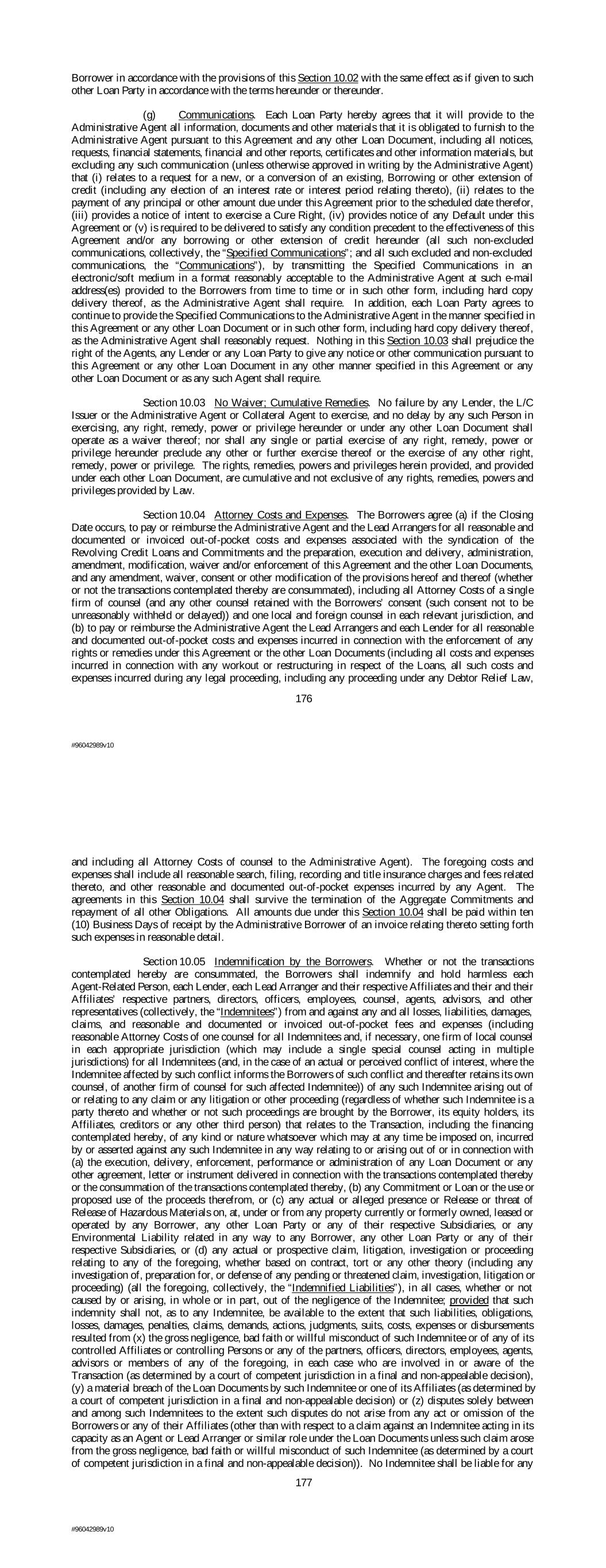 Borrower in accordance with the provisions of this Section 10.02 with the same effect as if given to such other Loan Party in accordance with the terms hereunder or thereunder. (g) Communications. Each Loan Party hereby agrees that it will provide to the Administrative Agent all information, documents and other materials that it is obligated to furnish to the Administrative Agent pursuant to this Agreement and any other Loan Document, including all notices, requests, financial statements, financial and other reports, certificates and other information materials, but excluding any such communication (unless otherwise approved in writing by the Administrative Agent) that (i) relates to a request for a new, or a conversion of an existing, Borrowing or other extension of credit (including any election of an interest rate or interest period relating thereto), (ii) relates to the payment of any principal or other amount due under this Agreement prior to the scheduled date therefor, (iii) provides a notice of intent to exercise a Cure Right, (iv) provides notice of any Default under this Agreement or (v) is required to be delivered to satisfy any condition precedent to the effectiveness of this Agreement and/or any borrowing or other extension of credit hereunder (all such non-excluded communications, collectively, the “Specified Communications”; and all such excluded and non-excluded communications, the “Communications”), by transmitting the Specified Communications in an electronic/soft medium in a format reasonably acceptable to the Administrative Agent at such e-mail address(es) provided to the Borrowers from time to time or in such other form, including hard copy delivery thereof, as the Administrative Agent shall require. In addition, each Loan Party agrees to continue to provide the Specified Communications to the Administrative Agent in the manner specified in this Agreement or any other Loan Document or in such other form, including hard copy delivery thereof, as the Administrative Agent shall reasonably request. Nothing in this Section 10.03 shall prejudice the right of the Agents, any Lender or any Loan Party to give any notice or other communication pursuant to this Agreement or any other Loan Document in any other manner specified in this Agreement or any other Loan Document or as any such Agent shall require. Section 10.03 No Waiver; Cumulative Remedies. No failure by any Lender, the L/C Issuer or the Administrative Agent or Collateral Agent to exercise, and no delay by any such Person in exercising, any right, remedy, power or privilege hereunder or under any other Loan Document shall operate as a waiver thereof; nor shall any single or partial exercise of any right, remedy, power or privilege hereunder preclude any other or further exercise thereof or the exercise of any other right, remedy, power or privilege. The rights, remedies, powers and privileges herein provided, and provided under each other Loan Document, are cumulative and not exclusive of any rights, remedies, powers and privileges provided by Law. Section 10.04 Attorney Costs and Expenses. The Borrowers agree (a) if the Closing Date occurs, to pay or reimburse the Administrative Agent and the Lead Arrangers for all reasonable and documented or invoiced out-of-pocket costs and expenses associated with the syndication of the Revolving Credit Loans and Commitments and the preparation, execution and delivery, administration, amendment, modification, waiver and/or enforcement of this Agreement and the other Loan Documents, and any amendment, waiver, consent or other modification of the provisions hereof and thereof (whether or not the transactions contemplated thereby are consummated), including all Attorney Costs of a single firm of counsel (and any other counsel retained with the Borrowers’ consent (such consent not to be unreasonably withheld or delayed)) and one local and foreign counsel in each relevant jurisdiction, and (b) to pay or reimburse the Administrative Agent the Lead Arrangers and each Lender for all reasonable and documented out-of-pocket costs and expenses incurred in connection with the enforcement of any rights or remedies under this Agreement or the other Loan Documents (including all costs and expenses incurred in connection with any workout or restructuring in respect of the Loans, all such costs and expenses incurred during any legal proceeding, including any proceeding under any Debtor Relief Law, 176 #96042989v10 and including all Attorney Costs of counsel to the Administrative Agent). The foregoing costs and expenses shall include all reasonable search, filing, recording and title insurance charges and fees related thereto, and other reasonable and documented out-of-pocket expenses incurred by any Agent. The agreements in this Section 10.04 shall survive the termination of the Aggregate Commitments and repayment of all other Obligations. All amounts due under this Section 10.04 shall be paid within ten (10) Business Days of receipt by the Administrative Borrower of an invoice relating thereto setting forth such expenses in reasonable detail. Section 10.05 Indemnification by the Borrowers. Whether or not the transactions contemplated hereby are consummated, the Borrowers shall indemnify and hold harmless each Agent-Related Person, each Lender, each Lead Arranger and their respective Affiliates and their and their Affiliates’ respective partners, directors, officers, employees, counsel, agents, advisors, and other representatives (collectively, the “Indemnitees”) from and against any and all losses, liabilities, damages, claims, and reasonable and documented or invoiced out-of-pocket fees and expenses (including reasonable Attorney Costs of one counsel for all Indemnitees and, if necessary, one firm of local counsel in each appropriate jurisdiction (which may include a single special counsel acting in multiple jurisdictions) for all Indemnitees (and, in the case of an actual or pe