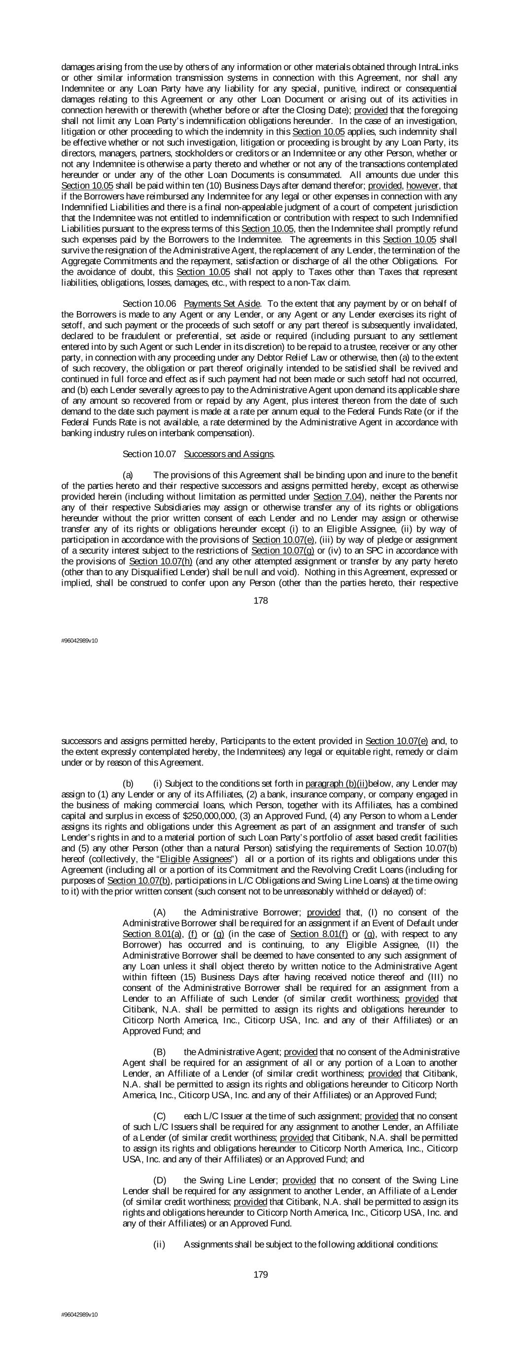 damages arising from the use by others of any information or other materials obtained through IntraLinks or other similar information transmission systems in connection with this Agreement, nor shall any Indemnitee or any Loan Party have any liability for any special, punitive, indirect or consequential damages relating to this Agreement or any other Loan Document or arising out of its activities in connection herewith or therewith (whether before or after the Closing Date); provided that the foregoing shall not limit any Loan Party’s indemnification obligations hereunder. In the case of an investigation, litigation or other proceeding to which the indemnity in this Section 10.05 applies, such indemnity shall be effective whether or not such investigation, litigation or proceeding is brought by any Loan Party, its directors, managers, partners, stockholders or creditors or an Indemnitee or any other Person, whether or not any Indemnitee is otherwise a party thereto and whether or not any of the transactions contemplated hereunder or under any of the other Loan Documents is consummated. All amounts due under this Section 10.05 shall be paid within ten (10) Business Days after demand therefor; provided, however, that if the Borrowers have reimbursed any Indemnitee for any legal or other expenses in connection with any Indemnified Liabilities and there is a final non-appealable judgment of a court of competent jurisdiction that the Indemnitee was not entitled to indemnification or contribution with respect to such Indemnified Liabilities pursuant to the express terms of this Section 10.05, then the Indemnitee shall promptly refund such expenses paid by the Borrowers to the Indemnitee. The agreements in this Section 10.05 shall survive the resignation of the Administrative Agent, the replacement of any Lender, the termination of the Aggregate Commitments and the repayment, satisfaction or discharge of all the other Obligations. For the avoidance of doubt, this Section 10.05 shall not apply to Taxes other than Taxes that represent liabilities, obligations, losses, damages, etc., with respect to a non-Tax claim. Section 10.06 Payments Set Aside. To the extent that any payment by or on behalf of the Borrowers is made to any Agent or any Lender, or any Agent or any Lender exercises its right of setoff, and such payment or the proceeds of such setoff or any part thereof is subsequently invalidated, declared to be fraudulent or preferential, set aside or required (including pursuant to any settlement entered into by such Agent or such Lender in its discretion) to be repaid to a trustee, receiver or any other party, in connection with any proceeding under any Debtor Relief Law or otherwise, then (a) to the extent of such recovery, the obligation or part thereof originally intended to be satisfied shall be revived and continued in full force and effect as if such payment had not been made or such setoff had not occurred, and (b) each Lender severally agrees to pay to the Administrative Agent upon demand its applicable share of any amount so recovered from or repaid by any Agent, plus interest thereon from the date of such demand to the date such payment is made at a rate per annum equal to the Federal Funds Rate (or if the Federal Funds Rate is not available, a rate determined by the Administrative Agent in accordance with banking industry rules on interbank compensation). Section 10.07 Successors and Assigns. (a) The provisions of this Agreement shall be binding upon and inure to the benefit of the parties hereto and their respective successors and assigns permitted hereby, except as otherwise provided herein (including without limitation as permitted under Section 7.04), neither the Parents nor any of their respective Subsidiaries may assign or otherwise transfer any of its rights or obligations hereunder without the prior written consent of each Lender and no Lender may assign or otherwise transfer any of its rights or obligations hereunder except (i) to an Eligible Assignee, (ii) by way of participation in accordance with the provisions of Section 10.07(e), (iii) by way of pledge or assignment of a security interest subject to the restrictions of Section 10.07(g) or (iv) to an SPC in accordance with the provisions of Section 10.07(h) (and any other attempted assignment or transfer by any party hereto (other than to any Disqualified Lender) shall be null and void). Nothing in this Agreement, expressed or implied, shall be construed to confer upon any Person (other than the parties hereto, their respective 178 #96042989v10 successors and assigns permitted hereby, Participants to the extent provided in Section 10.07(e) and, to the extent expressly contemplated hereby, the Indemnitees) any legal or equitable right, remedy or claim under or by reason of this Agreement. (b) (i) Subject to the conditions set forth in paragraph (b)(ii)below, any Lender may assign to (1) any Lender or any of its Affiliates, (2) a bank, insurance company, or company engaged in the business of making commercial loans, which Person, together with its Affiliates, has a combined capital and surplus in excess of $250,000,000, (3) an Approved Fund, (4) any Person to whom a Lender assigns its rights and obligations under this Agreement as part of an assignment and transfer of such Lender’s rights in and to a material portion of such Loan Party’s portfolio of asset based credit facilities and (5) any other Person (other than a natural Person) satisfying the requirements of Section 10.07(b) hereof (collectively, the “Eligible Assignees”) all or a portion of its rights and obligations under this Agreement (including all or a portion of its Commitment and the Revolving Credit Loans (including for purposes of Section 10.07(b), participations in L/C Obligations and Swing Line Loans) at the time owing to it) with the prior written consent (such consent not to be unreasonably withheld or delayed) of: (A) the Administrative Bor