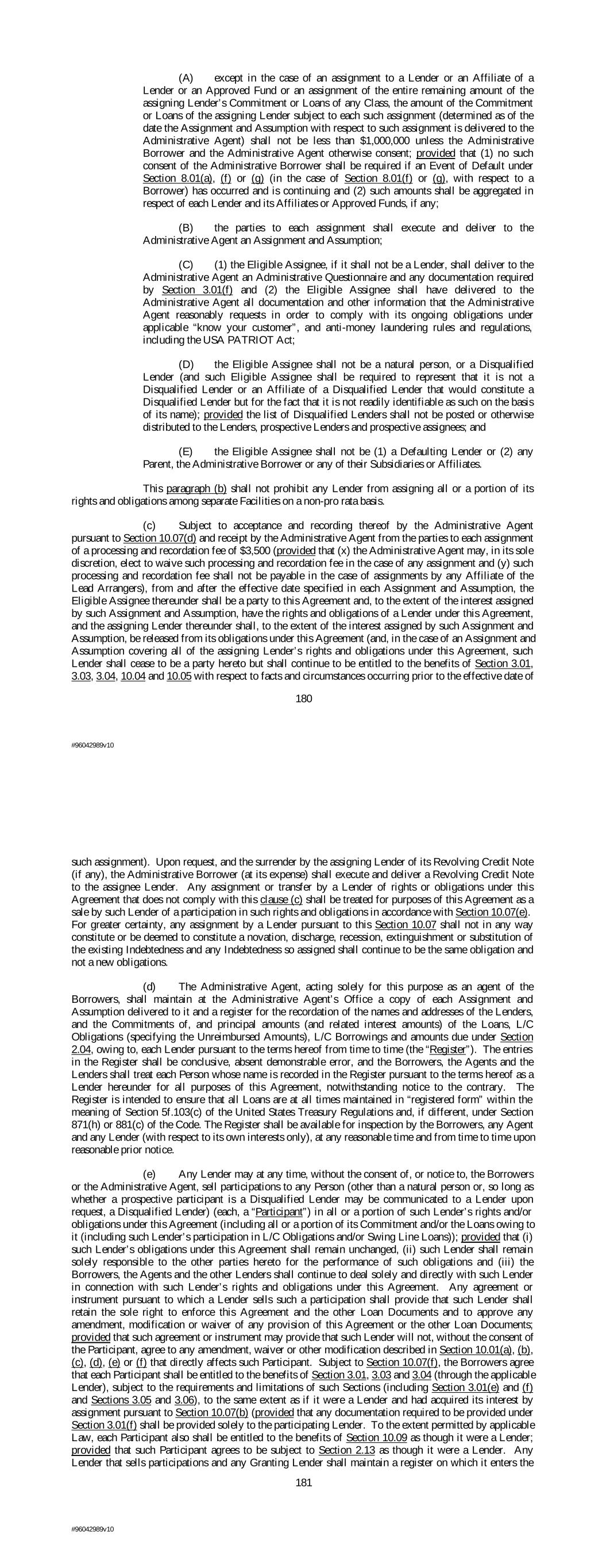 (A) except in the case of an assignment to a Lender or an Affiliate of a Lender or an Approved Fund or an assignment of the entire remaining amount of the assigning Lender’s Commitment or Loans of any Class, the amount of the Commitment or Loans of the assigning Lender subject to each such assignment (determined as of the date the Assignment and Assumption with respect to such assignment is delivered to the Administrative Agent) shall not be less than $1,000,000 unless the Administrative Borrower and the Administrative Agent otherwise consent; provided that (1) no such consent of the Administrative Borrower shall be required if an Event of Default under Section 8.01(a), (f) or (g) (in the case of Section 8.01(f) or (g), with respect to a Borrower) has occurred and is continuing and (2) such amounts shall be aggregated in respect of each Lender and its Affiliates or Approved Funds, if any; (B) the parties to each assignment shall execute and deliver to the Administrative Agent an Assignment and Assumption; (C) (1) the Eligible Assignee, if it shall not be a Lender, shall deliver to the Administrative Agent an Administrative Questionnaire and any documentation required by Section 3.01(f) and (2) the Eligible Assignee shall have delivered to the Administrative Agent all documentation and other information that the Administrative Agent reasonably requests in order to comply with its ongoing obligations under applicable “know your customer”, and anti-money laundering rules and regulations, including the USA PATRIOT Act; (D) the Eligible Assignee shall not be a natural person, or a Disqualified Lender (and such Eligible Assignee shall be required to represent that it is not a Disqualified Lender or an Affiliate of a Disqualified Lender that would constitute a Disqualified Lender but for the fact that it is not readily identifiable as such on the basis of its name); provided the list of Disqualified Lenders shall not be posted or otherwise distributed to the Lenders, prospective Lenders and prospective assignees; and (E) the Eligible Assignee shall not be (1) a Defaulting Lender or (2) any Parent, the Administrative Borrower or any of their Subsidiaries or Affiliates. This paragraph (b) shall not prohibit any Lender from assigning all or a portion of its rights and obligations among separate Facilities on a non-pro rata basis. (c) Subject to acceptance and recording thereof by the Administrative Agent pursuant to Section 10.07(d) and receipt by the Administrative Agent from the parties to each assignment of a processing and recordation fee of $3,500 (provided that (x) the Administrative Agent may, in its sole discretion, elect to waive such processing and recordation fee in the case of any assignment and (y) such processing and recordation fee shall not be payable in the case of assignments by any Affiliate of the Lead Arrangers), from and after the effective date specified in each Assignment and Assumption, the Eligible Assignee thereunder shall be a party to this Agreement and, to the extent of the interest assigned by such Assignment and Assumption, have the rights and obligations of a Lender under this Agreement, and the assigning Lender thereunder shall, to the extent of the interest assigned by such Assignment and Assumption, be released from its obligations under this Agreement (and, in the case of an Assignment and Assumption covering all of the assigning Lender’s rights and obligations under this Agreement, such Lender shall cease to be a party hereto but shall continue to be entitled to the benefits of Section 3.01, 3.03, 3.04, 10.04 and 10.05 with respect to facts and circumstances occurring prior to the effective date of 180 #96042989v10 such assignment). Upon request, and the surrender by the assigning Lender of its Revolving Credit Note (if any), the Administrative Borrower (at its expense) shall execute and deliver a Revolving Credit Note to the assignee Lender. Any assignment or transfer by a Lender of rights or obligations under this Agreement that does not comply with this clause (c) shall be treated for purposes of this Agreement as a sale by such Lender of a participation in such rights and obligations in accordance with Section 10.07(e). For greater certainty, any assignment by a Lender pursuant to this Section 10.07 shall not in any way constitute or be deemed to constitute a novation, discharge, recession, extinguishment or substitution of the existing Indebtedness and any Indebtedness so assigned shall continue to be the same obligation and not a new obligations. (d) The Administrative Agent, acting solely for this purpose as an agent of the Borrowers, shall maintain at the Administrative Agent’s Office a copy of each Assignment and Assumption delivered to it and a register for the recordation of the names and addresses of the Lenders, and the Commitments of, and principal amounts (and related interest amounts) of the Loans, L/C Obligations (specifying the Unreimbursed Amounts), L/C Borrowings and amounts due under Section 2.04, owing to, each Lender pursuant to the terms hereof from time to time (the “Register”). The entries in the Register shall be conclusive, absent demonstrable error, and the Borrowers, the Agents and the Lenders shall treat each Person whose name is recorded in the Register pursuant to the terms hereof as a Lender hereunder for all purposes of this Agreement, notwithstanding notice to the contrary. The Register is intended to ensure that all Loans are at all times maintained in “registered form” within the meaning of Section 5f.103(c) of the United States Treasury Regulations and, if different, under Section 871(h) or 881(c) of the Code. The Register shall be available for inspection by the Borrowers, any Agent and any Lender (with respect to its own interests only), at any reasonable time and from time to time upon reasonable prior notice. (e) Any Lender may at any time, without the consent of, or notice to, the Borrowers or the A