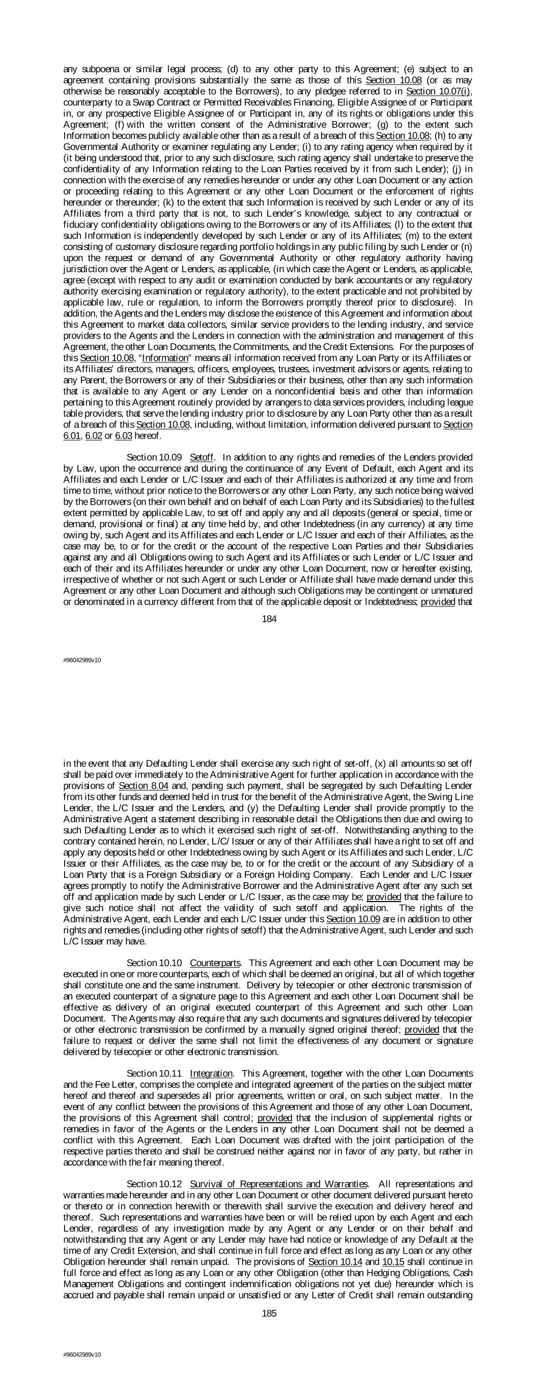 any subpoena or similar legal process; (d) to any other party to this Agreement; (e) subject to an agreement containing provisions substantially the same as those of this Section 10.08 (or as may otherwise be reasonably acceptable to the Borrowers), to any pledgee referred to in Section 10.07(i), counterparty to a Swap Contract or Permitted Receivables Financing, Eligible Assignee of or Participant in, or any prospective Eligible Assignee of or Participant in, any of its rights or obligations under this Agreement; (f) with the written consent of the Administrative Borrower; (g) to the extent such Information becomes publicly available other than as a result of a breach of this Section 10.08; (h) to any Governmental Authority or examiner regulating any Lender; (i) to any rating agency when required by it (it being understood that, prior to any such disclosure, such rating agency shall undertake to preserve the confidentiality of any Information relating to the Loan Parties received by it from such Lender); (j) in connection with the exercise of any remedies hereunder or under any other Loan Document or any action or proceeding relating to this Agreement or any other Loan Document or the enforcement of rights hereunder or thereunder; (k) to the extent that such Information is received by such Lender or any of its Affiliates from a third party that is not, to such Lender’s knowledge, subject to any contractual or fiduciary confidentiality obligations owing to the Borrowers or any of its Affiliates; (l) to the extent that such Information is independently developed by such Lender or any of its Affiliates; (m) to the extent consisting of customary disclosure regarding portfolio holdings in any public filing by such Lender or (n) upon the request or demand of any Governmental Authority or other regulatory authority having jurisdiction over the Agent or Lenders, as applicable, (in which case the Agent or Lenders, as applicable, agree (except with respect to any audit or examination conducted by bank accountants or any regulatory authority exercising examination or regulatory authority), to the extent practicable and not prohibited by applicable law, rule or regulation, to inform the Borrowers promptly thereof prior to disclosure). In addition, the Agents and the Lenders may disclose the existence of this Agreement and information about this Agreement to market data collectors, similar service providers to the lending industry, and service providers to the Agents and the Lenders in connection with the administration and management of this Agreement, the other Loan Documents, the Commitments, and the Credit Extensions. For the purposes of this Section 10.08, “Information” means all information received from any Loan Party or its Affiliates or its Affiliates’ directors, managers, officers, employees, trustees, investment advisors or agents, relating to any Parent, the Borrowers or any of their Subsidiaries or their business, other than any such information that is available to any Agent or any Lender on a nonconfidential basis and other than information pertaining to this Agreement routinely provided by arrangers to data services providers, including league table providers, that serve the lending industry prior to disclosure by any Loan Party other than as a result of a breach of this Section 10.08, including, without limitation, information delivered pursuant to Section 6.01, 6.02 or 6.03 hereof. Section 10.09 Setoff. In addition to any rights and remedies of the Lenders provided by Law, upon the occurrence and during the continuance of any Event of Default, each Agent and its Affiliates and each Lender or L/C Issuer and each of their Affiliates is authorized at any time and from time to time, without prior notice to the Borrowers or any other Loan Party, any such notice being waived by the Borrowers (on their own behalf and on behalf of each Loan Party and its Subsidiaries) to the fullest extent permitted by applicable Law, to set off and apply any and all deposits (general or special, time or demand, provisional or final) at any time held by, and other Indebtedness (in any currency) at any time owing by, such Agent and its Affiliates and each Lender or L/C Issuer and each of their Affiliates, as the case may be, to or for the credit or the account of the respective Loan Parties and their Subsidiaries against any and all Obligations owing to such Agent and its Affiliates or such Lender or L/C Issuer and each of their and its Affiliates hereunder or under any other Loan Document, now or hereafter existing, irrespective of whether or not such Agent or such Lender or Affiliate shall have made demand under this Agreement or any other Loan Document and although such Obligations may be contingent or unmatured or denominated in a currency different from that of the applicable deposit or Indebtedness; provided that 184 #96042989v10 in the event that any Defaulting Lender shall exercise any such right of set-off, (x) all amounts so set off shall be paid over immediately to the Administrative Agent for further application in accordance with the provisions of Section 8.04 and, pending such payment, shall be segregated by such Defaulting Lender from its other funds and deemed held in trust for the benefit of the Administrative Agent, the Swing Line Lender, the L/C Issuer and the Lenders, and (y) the Defaulting Lender shall provide promptly to the Administrative Agent a statement describing in reasonable detail the Obligations then due and owing to such Defaulting Lender as to which it exercised such right of set-off. Notwithstanding anything to the contrary contained herein, no Lender, L/C/ Issuer or any of their Affiliates shall have a right to set off and apply any deposits held or other Indebtedness owing by such Agent or its Affiliates and such Lender, L/C Issuer or their Affiliates, as the case may be, to or for the credit or the account of any Subsidiary of a Loan Party that is a Foreign Subsi