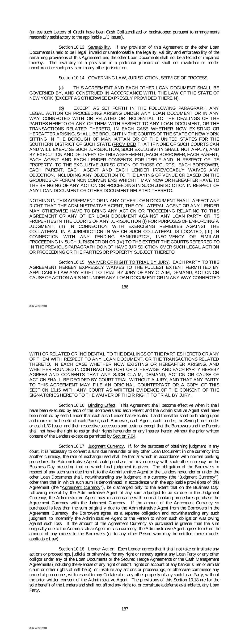 (unless such Letters of Credit have been Cash Collateralized or backstopped pursuant to arrangements reasonably satisfactory to the applicable L/C Issuer). Section 10.13 Severability. If any provision of this Agreement or the other Loan Documents is held to be illegal, invalid or unenforceable, the legality, validity and enforceability of the remaining provisions of this Agreement and the other Loan Documents shall not be affected or impaired thereby. The invalidity of a provision in a particular jurisdiction shall not invalidate or render unenforceable such provision in any other jurisdiction. Section 10.14 GOVERNING LAW, JURISDICTION, SERVICE OF PROCESS. (a) THIS AGREEMENT AND EACH OTHER LOAN DOCUMENT SHALL BE GOVERNED BY, AND CONSTRUED IN ACCORDANCE WITH, THE LAW OF THE STATE OF NEW YORK (EXCEPT AS OTHERWISE EXPRESSLY PROVIDED THEREIN). (b) EXCEPT AS SET FORTH IN THE FOLLOWING PARAGRAPH, ANY LEGAL ACTION OR PROCEEDING ARISING UNDER ANY LOAN DOCUMENT OR IN ANY WAY CONNECTED WITH OR RELATED OR INCIDENTAL TO THE DEALINGS OF THE PARTIES HERETO OR ANY OF THEM WITH RESPECT TO ANY LOAN DOCUMENT, OR THE TRANSACTIONS RELATED THERETO, IN EACH CASE WHETHER NOW EXISTING OR HEREAFTER ARISING, SHALL BE BROUGHT IN THE COURTS OF THE STATE OF NEW YORK SITTING IN THE BOROUGH OF MANHATTAN OR OF THE UNITED STATES FOR THE SOUTHERN DISTRICT OF SUCH STATE (PROVIDED THAT IF NONE OF SUCH COURTS CAN AND WILL EXERCISE SUCH JURISDICTION, SUCH EXCLUSIVITY SHALL NOT APPLY), AND BY EXECUTION AND DELIVERY OF THIS AGREEMENT, EACH BORROWER, EACH PARENT, EACH AGENT AND EACH LENDER CONSENTS, FOR ITSELF AND IN RESPECT OF ITS PROPERTY, TO THE EXCLUSIVE JURISDICTION OF THOSE COURTS. EACH BORROWER, EACH PARENT, EACH AGENT AND EACH LENDER IRREVOCABLY WAIVES ANY OBJECTION, INCLUDING ANY OBJECTION TO THE LAYING OF VENUE OR BASED ON THE GROUNDS OF FORUM NON CONVENIENS, WHICH IT MAY NOW OR HEREAFTER HAVE TO THE BRINGING OF ANY ACTION OR PROCEEDING IN SUCH JURISDICTION IN RESPECT OF ANY LOAN DOCUMENT OR OTHER DOCUMENT RELATED THERETO. NOTHING IN THIS AGREEMENT OR IN ANY OTHER LOAN DOCUMENT SHALL AFFECT ANY RIGHT THAT THE ADMINISTRATIVE AGENT, THE COLLATERAL AGENT OR ANY LENDER MAY OTHERWISE HAVE TO BRING ANY ACTION OR PROCEEDING RELATING TO THIS AGREEMENT OR ANY OTHER LOAN DOCUMENT AGAINST ANY LOAN PARTY OR ITS PROPERTIES IN THE COURTS OF ANY JURISDICTION (I) FOR PURPOSES OF ENFORCING A JUDGMENT, (II) IN CONNECTION WITH EXERCISING REMEDIES AGAINST THE COLLATERAL IN A JURISDICTION IN WHICH SUCH COLLATERAL IS LOCATED, (III) IN CONNECTION WITH ANY PENDING BANKRUPTCY, INSOLVENCY OR SIMILAR PROCEEDING IN SUCH JURISDICTION OR (IV) TO THE EXTENT THE COURTS REFERRED TO IN THE PREVIOUS PARAGRAPH DO NOT HAVE JURISDICTION OVER SUCH LEGAL ACTION OR PROCEEDING OR THE PARTIES OR PROPERTY SUBJECT THERETO. Section 10.15 WAIVER OF RIGHT TO TRIAL BY JURY. EACH PARTY TO THIS AGREEMENT HEREBY EXPRESSLY WAIVES TO THE FULLEST EXTENT PERMITTED BY APPLICABLE LAW ANY RIGHT TO TRIAL BY JURY OF ANY CLAIM, DEMAND, ACTION OR CAUSE OF ACTION ARISING UNDER ANY LOAN DOCUMENT OR IN ANY WAY CONNECTED 186 #96042989v10 WITH OR RELATED OR INCIDENTAL TO THE DEALINGS OF THE PARTIES HERETO OR ANY OF THEM WITH RESPECT TO ANY LOAN DOCUMENT, OR THE TRANSACTIONS RELATED THERETO, IN EACH CASE WHETHER NOW EXISTING OR HEREAFTER ARISING, AND WHETHER FOUNDED IN CONTRACT OR TORT OR OTHERWISE; AND EACH PARTY HEREBY AGREES AND CONSENTS THAT ANY SUCH CLAIM, DEMAND, ACTION OR CAUSE OF ACTION SHALL BE DECIDED BY COURT TRIAL WITHOUT A JURY, AND THAT ANY PARTY TO THIS AGREEMENT MAY FILE AN ORIGINAL COUNTERPART OR A COPY OF THIS SECTION 10.15 WITH ANY COURT AS WRITTEN EVIDENCE OF THE CONSENT OF THE SIGNATORIES HERETO TO THE WAIVER OF THEIR RIGHT TO TRIAL BY JURY. Section 10.16 Binding Effect. This Agreement shall become effective when it shall have been executed by each of the Borrowers and each Parent and the Administrative Agent shall have been notified by each Lender that each such Lender has executed it and thereafter shall be binding upon and inure to the benefit of each Parent, each Borrower, each Agent, each Lender, the Swing Line Lender or each L/C Issuer and their respective successors and assigns, except that the Borrowers and the Parents shall not have the right to assign their rights hereunder or any interest herein without the prior written consent of the Lenders except as permitted by Section 7.04. Section 10.17 Judgment Currency. If, for the purposes of obtaining judgment in any court, it is necessary to convert a sum due hereunder or any other Loan Document in one currency into another currency, the rate of exchange used shall be that at which in accordance with normal banking procedures the Administrative Agent could purchase the first currency with such other currency on the Business Day preceding that on which final judgment is given. The obligation of the Borrowers in respect of any such sum due from it to the Administrative Agent or the Lenders hereunder or under the other Loan Documents shall, notwithstanding any judgment in a currency (the “Judgment Currency”) other than that in which such sum is denominated in accordance with the applicable provisions of this Agreement (the “Agreement Currency”), be discharged only to the extent that on the Business Day following receipt by the Administrative Agent of any sum adjudged to be so due in the Judgment Currency, the Administrative Agent may in accordance with normal banking procedures purchase the Agreement Currency with the Judgment Currency. If the amount of the Agreement Currency so purchased is less than the sum originally due to the Administrative Agent from the Borrowers in the Agreement Currency, the Borrowers agree, as a separate obligation and notwithstanding any such judgment, to indemnify the Administrative Agent or the Person to whom such obligation was owing against such loss. If the amount of the Agreement Currency so purchased is greater than the sum originally due to the Administrative Agent in 