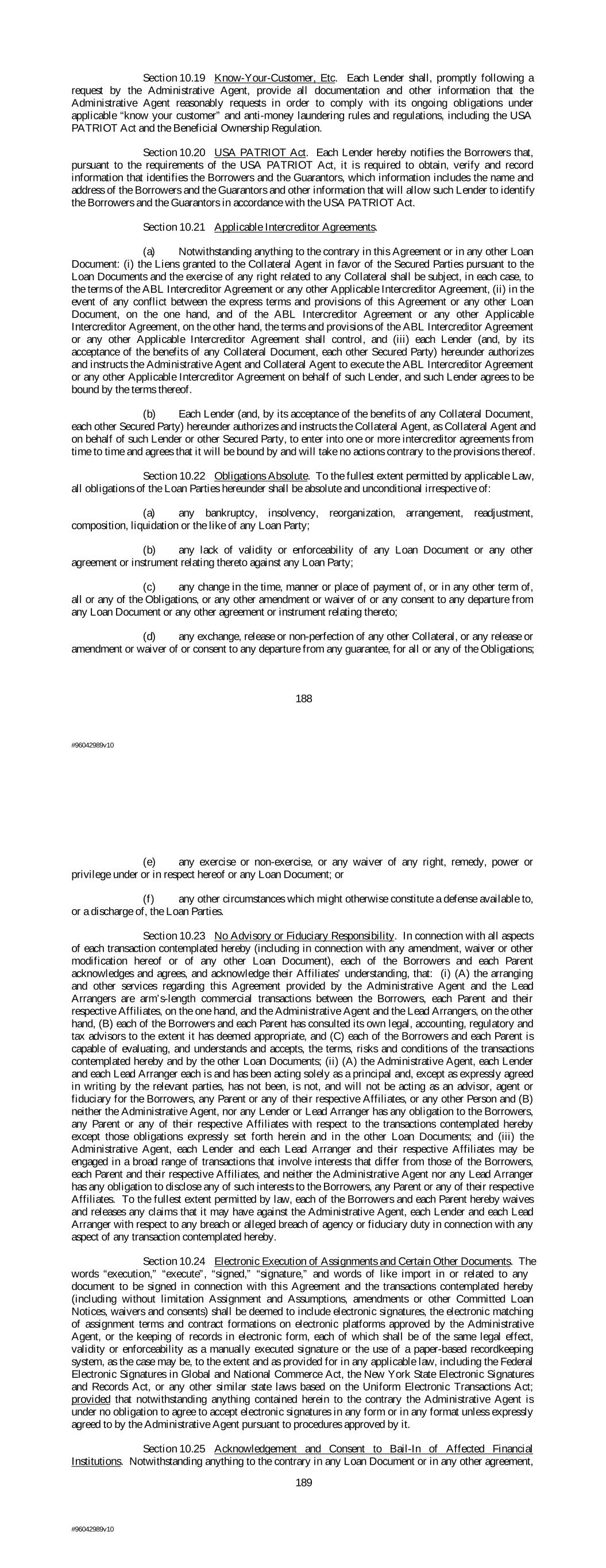 Section 10.19 Know-Your-Customer, Etc. Each Lender shall, promptly following a request by the Administrative Agent, provide all documentation and other information that the Administrative Agent reasonably requests in order to comply with its ongoing obligations under applicable “know your customer” and anti-money laundering rules and regulations, including the USA PATRIOT Act and the Beneficial Ownership Regulation. Section 10.20 USA PATRIOT Act. Each Lender hereby notifies the Borrowers that, pursuant to the requirements of the USA PATRIOT Act, it is required to obtain, verify and record information that identifies the Borrowers and the Guarantors, which information includes the name and address of the Borrowers and the Guarantors and other information that will allow such Lender to identify the Borrowers and the Guarantors in accordance with the USA PATRIOT Act. Section 10.21 Applicable Intercreditor Agreements. (a) Notwithstanding anything to the contrary in this Agreement or in any other Loan Document: (i) the Liens granted to the Collateral Agent in favor of the Secured Parties pursuant to the Loan Documents and the exercise of any right related to any Collateral shall be subject, in each case, to the terms of the ABL Intercreditor Agreement or any other Applicable Intercreditor Agreement, (ii) in the event of any conflict between the express terms and provisions of this Agreement or any other Loan Document, on the one hand, and of the ABL Intercreditor Agreement or any other Applicable Intercreditor Agreement, on the other hand, the terms and provisions of the ABL Intercreditor Agreement or any other Applicable Intercreditor Agreement shall control, and (iii) each Lender (and, by its acceptance of the benefits of any Collateral Document, each other Secured Party) hereunder authorizes and instructs the Administrative Agent and Collateral Agent to execute the ABL Intercreditor Agreement or any other Applicable Intercreditor Agreement on behalf of such Lender, and such Lender agrees to be bound by the terms thereof. (b) Each Lender (and, by its acceptance of the benefits of any Collateral Document, each other Secured Party) hereunder authorizes and instructs the Collateral Agent, as Collateral Agent and on behalf of such Lender or other Secured Party, to enter into one or more intercreditor agreements from time to time and agrees that it will be bound by and will take no actions contrary to the provisions thereof. Section 10.22 Obligations Absolute. To the fullest extent permitted by applicable Law, all obligations of the Loan Parties hereunder shall be absolute and unconditional irrespective of: (a) any bankruptcy, insolvency, reorganization, arrangement, readjustment, composition, liquidation or the like of any Loan Party; (b) any lack of validity or enforceability of any Loan Document or any other agreement or instrument relating thereto against any Loan Party; (c) any change in the time, manner or place of payment of, or in any other term of, all or any of the Obligations, or any other amendment or waiver of or any consent to any departure from any Loan Document or any other agreement or instrument relating thereto; (d) any exchange, release or non-perfection of any other Collateral, or any release or amendment or waiver of or consent to any departure from any guarantee, for all or any of the Obligations; 188 #96042989v10 (e) any exercise or non-exercise, or any waiver of any right, remedy, power or privilege under or in respect hereof or any Loan Document; or (f) any other circumstances which might otherwise constitute a defense available to, or a discharge of, the Loan Parties. Section 10.23 No Advisory or Fiduciary Responsibility. In connection with all aspects of each transaction contemplated hereby (including in connection with any amendment, waiver or other modification hereof or of any other Loan Document), each of the Borrowers and each Parent acknowledges and agrees, and acknowledge their Affiliates’ understanding, that: (i) (A) the arranging and other services regarding this Agreement provided by the Administrative Agent and the Lead Arrangers are arm’s-length commercial transactions between the Borrowers, each Parent and their respective Affiliates, on the one hand, and the Administrative Agent and the Lead Arrangers, on the other hand, (B) each of the Borrowers and each Parent has consulted its own legal, accounting, regulatory and tax advisors to the extent it has deemed appropriate, and (C) each of the Borrowers and each Parent is capable of evaluating, and understands and accepts, the terms, risks and conditions of the transactions contemplated hereby and by the other Loan Documents; (ii) (A) the Administrative Agent, each Lender and each Lead Arranger each is and has been acting solely as a principal and, except as expressly agreed in writing by the relevant parties, has not been, is not, and will not be acting as an advisor, agent or fiduciary for the Borrowers, any Parent or any of their respective Affiliates, or any other Person and (B) neither the Administrative Agent, nor any Lender or Lead Arranger has any obligation to the Borrowers, any Parent or any of their respective Affiliates with respect to the transactions contemplated hereby except those obligations expressly set forth herein and in the other Loan Documents; and (iii) the Administrative Agent, each Lender and each Lead Arranger and their respective Affiliates may be engaged in a broad range of transactions that involve interests that differ from those of the Borrowers, each Parent and their respective Affiliates, and neither the Administrative Agent nor any Lead Arranger has any obligation to disclose any of such interests to the Borrowers, any Parent or any of their respective Affiliates. To the fullest extent permitted by law, each of the Borrowers and each Parent hereby waives and releases any claims that it may have against the Administrative Agent, each Lender and each Lead Arranger wit
