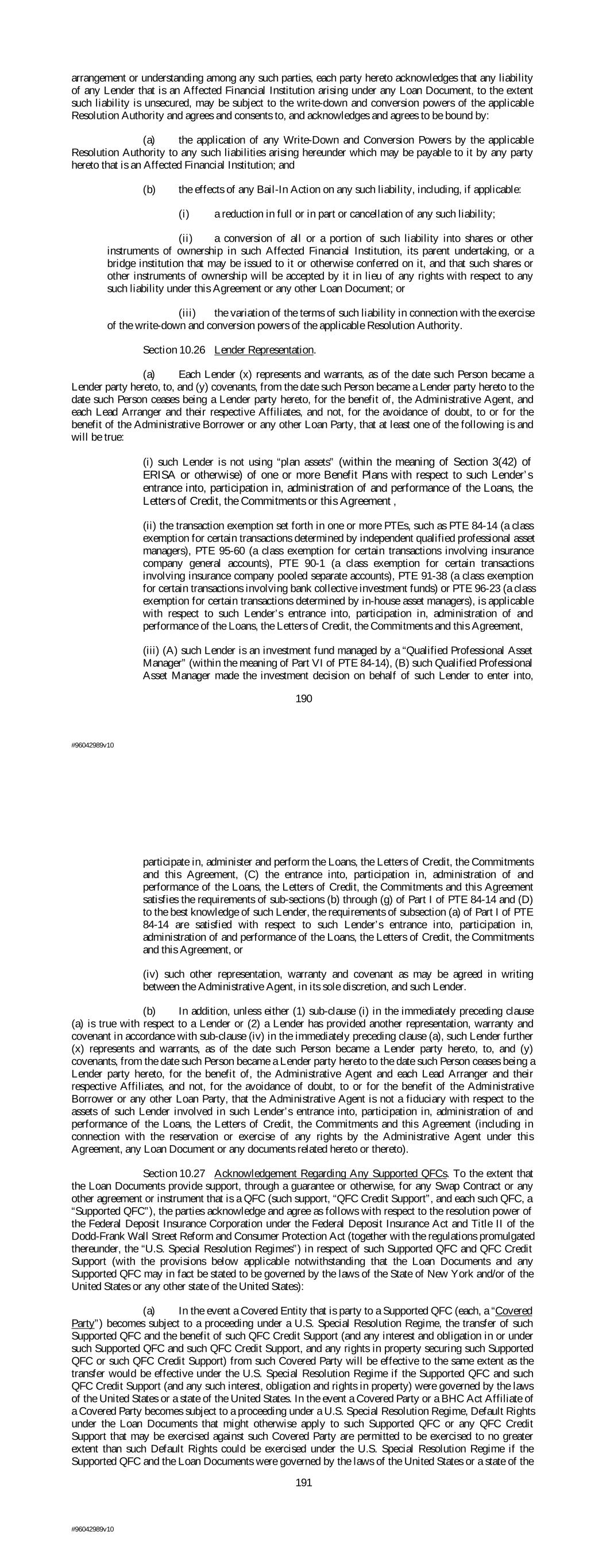 arrangement or understanding among any such parties, each party hereto acknowledges that any liability of any Lender that is an Affected Financial Institution arising under any Loan Document, to the extent such liability is unsecured, may be subject to the write-down and conversion powers of the applicable Resolution Authority and agrees and consents to, and acknowledges and agrees to be bound by: (a) the application of any Write-Down and Conversion Powers by the applicable Resolution Authority to any such liabilities arising hereunder which may be payable to it by any party hereto that is an Affected Financial Institution; and (b) the effects of any Bail-In Action on any such liability, including, if applicable: (i) a reduction in full or in part or cancellation of any such liability; (ii) a conversion of all or a portion of such liability into shares or other instruments of ownership in such Affected Financial Institution, its parent undertaking, or a bridge institution that may be issued to it or otherwise conferred on it, and that such shares or other instruments of ownership will be accepted by it in lieu of any rights with respect to any such liability under this Agreement or any other Loan Document; or (iii) the variation of the terms of such liability in connection with the exercise of the write-down and conversion powers of the applicable Resolution Authority. Section 10.26 Lender Representation. (a) Each Lender (x) represents and warrants, as of the date such Person became a Lender party hereto, to, and (y) covenants, from the date such Person became a Lender party hereto to the date such Person ceases being a Lender party hereto, for the benefit of, the Administrative Agent, and each Lead Arranger and their respective Affiliates, and not, for the avoidance of doubt, to or for the benefit of the Administrative Borrower or any other Loan Party, that at least one of the following is and will be true: (i) such Lender is not using “plan assets” (within the meaning of Section 3(42) of ERISA or otherwise) of one or more Benefit Plans with respect to such Lender’s entrance into, participation in, administration of and performance of the Loans, the Letters of Credit, the Commitments or this Agreement , (ii) the transaction exemption set forth in one or more PTEs, such as PTE 84-14 (a class exemption for certain transactions determined by independent qualified professional asset managers), PTE 95-60 (a class exemption for certain transactions involving insurance company general accounts), PTE 90-1 (a class exemption for certain transactions involving insurance company pooled separate accounts), PTE 91-38 (a class exemption for certain transactions involving bank collective investment funds) or PTE 96-23 (a class exemption for certain transactions determined by in-house asset managers), is applicable with respect to such Lender’s entrance into, participation in, administration of and performance of the Loans, the Letters of Credit, the Commitments and this Agreement, (iii) (A) such Lender is an investment fund managed by a “Qualified Professional Asset Manager” (within the meaning of Part VI of PTE 84-14), (B) such Qualified Professional Asset Manager made the investment decision on behalf of such Lender to enter into, 190 #96042989v10 participate in, administer and perform the Loans, the Letters of Credit, the Commitments and this Agreement, (C) the entrance into, participation in, administration of and performance of the Loans, the Letters of Credit, the Commitments and this Agreement satisfies the requirements of sub-sections (b) through (g) of Part I of PTE 84-14 and (D) to the best knowledge of such Lender, the requirements of subsection (a) of Part I of PTE 84-14 are satisfied with respect to such Lender’s entrance into, participation in, administration of and performance of the Loans, the Letters of Credit, the Commitments and this Agreement, or (iv) such other representation, warranty and covenant as may be agreed in writing between the Administrative Agent, in its sole discretion, and such Lender. (b) In addition, unless either (1) sub-clause (i) in the immediately preceding clause (a) is true with respect to a Lender or (2) a Lender has provided another representation, warranty and covenant in accordance with sub-clause (iv) in the immediately preceding clause (a), such Lender further (x) represents and warrants, as of the date such Person became a Lender party hereto, to, and (y) covenants, from the date such Person became a Lender party hereto to the date such Person ceases being a Lender party hereto, for the benefit of, the Administrative Agent and each Lead Arranger and their respective Affiliates, and not, for the avoidance of doubt, to or for the benefit of the Administrative Borrower or any other Loan Party, that the Administrative Agent is not a fiduciary with respect to the assets of such Lender involved in such Lender’s entrance into, participation in, administration of and performance of the Loans, the Letters of Credit, the Commitments and this Agreement (including in connection with the reservation or exercise of any rights by the Administrative Agent under this Agreement, any Loan Document or any documents related hereto or thereto). Section 10.27 Acknowledgement Regarding Any Supported QFCs. To the extent that the Loan Documents provide support, through a guarantee or otherwise, for any Swap Contract or any other agreement or instrument that is a QFC (such support, “QFC Credit Support”, and each such QFC, a “Supported QFC”), the parties acknowledge and agree as follows with respect to the resolution power of the Federal Deposit Insurance Corporation under the Federal Deposit Insurance Act and Title II of the Dodd-Frank Wall Street Reform and Consumer Protection Act (together with the regulations promulgated thereunder, the “U.S. Special Resolution Regimes”) in respect of such Supported QFC and QFC Credit Support (with the provisions b