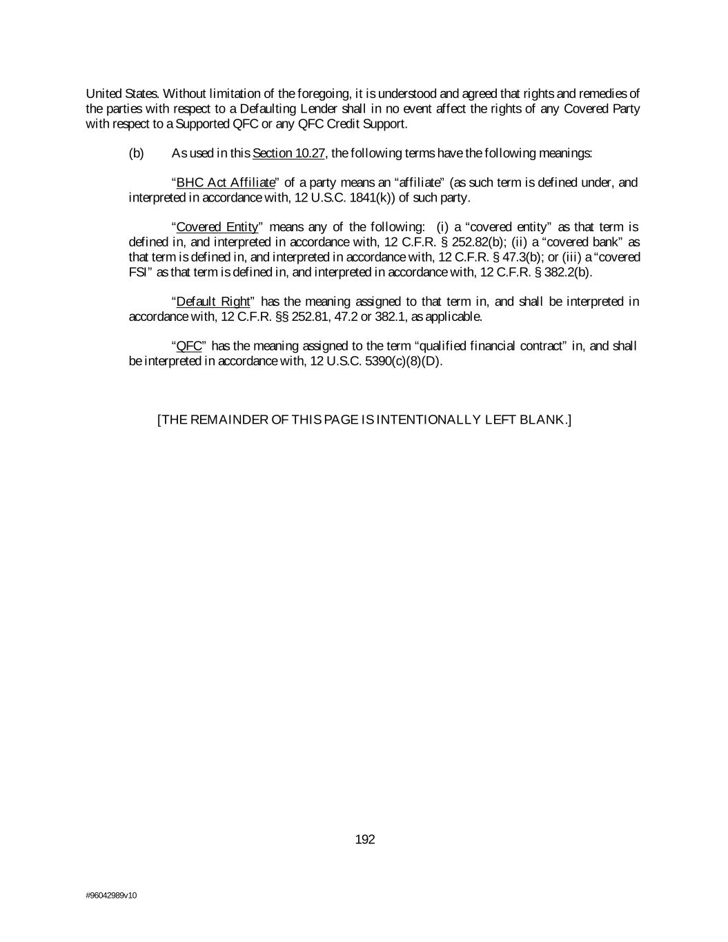 United States. Without limitation of the foregoing, it is understood and agreed that rights and remedies of the parties with respect to a Defaulting Lender shall in no event affect the rights of any Covered Party with respect to a Supported QFC or any QFC Credit Support. (b) As used in this Section 10.27, the following terms have the following meanings: “BHC Act Affiliate” of a party means an “affiliate” (as such term is defined under, and interpreted in accordance with, 12 U.S.C. 1841(k)) of such party. “Covered Entity” means any of the following: (i) a “covered entity” as that term is defined in, and interpreted in accordance with, 12 C.F.R. § 252.82(b); (ii) a “covered bank” as that term is defined in, and interpreted in accordance with, 12 C.F.R. § 47.3(b); or (iii) a “covered FSI” as that term is defined in, and interpreted in accordance with, 12 C.F.R. § 382.2(b). “Default Right” has the meaning assigned to that term in, and shall be interpreted in accordance with, 12 C.F.R. §§ 252.81, 47.2 or 382.1, as applicable. “QFC” has the meaning assigned to the term “qualified financial contract” in, and shall be interpreted in accordance with, 12 U.S.C. 5390(c)(8)(D). [THE REMAINDER OF THIS PAGE IS INTENTIONALLY LEFT BLANK.] 192 #96042989v10