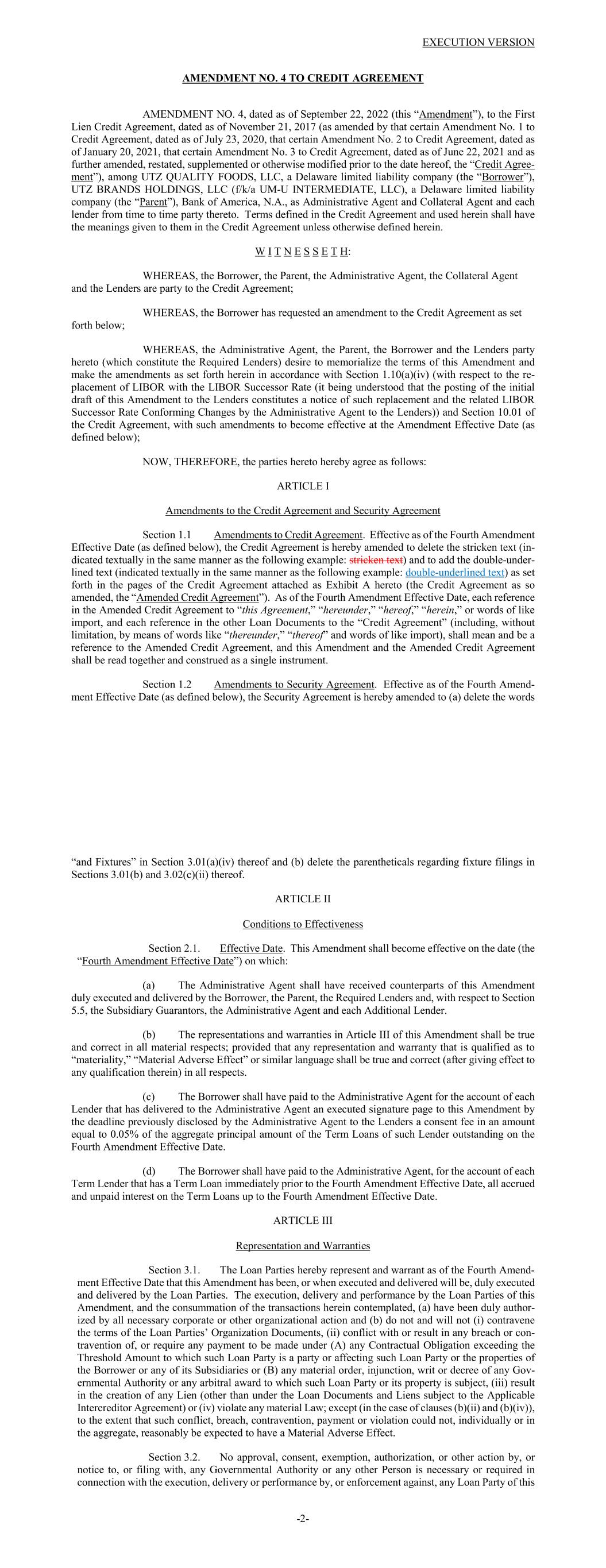 EXECUTION VERSION AMENDMENT NO. 4 TO CREDIT AGREEMENT AMENDMENT NO. 4, dated as of September 22, 2022 (this “Amendment”), to the First Lien Credit Agreement, dated as of November 21, 2017 (as amended by that certain Amendment No. 1 to Credit Agreement, dated as of July 23, 2020, that certain Amendment No. 2 to Credit Agreement, dated as of January 20, 2021, that certain Amendment No. 3 to Credit Agreement, dated as of June 22, 2021 and as further amended, restated, supplemented or otherwise modified prior to the date hereof, the “Credit Agree- ment”), among UTZ QUALITY FOODS, LLC, a Delaware limited liability company (the “Borrower”), UTZ BRANDS HOLDINGS, LLC (f/k/a UM-U INTERMEDIATE, LLC), a Delaware limited liability company (the “Parent”), Bank of America, N.A., as Administrative Agent and Collateral Agent and each lender from time to time party thereto. Terms defined in the Credit Agreement and used herein shall have the meanings given to them in the Credit Agreement unless otherwise defined herein. W I T N E S S E T H: WHEREAS, the Borrower, the Parent, the Administrative Agent, the Collateral Agent and the Lenders are party to the Credit Agreement; WHEREAS, the Borrower has requested an amendment to the Credit Agreement as set forth below; WHEREAS, the Administrative Agent, the Parent, the Borrower and the Lenders party hereto (which constitute the Required Lenders) desire to memorialize the terms of this Amendment and make the amendments as set forth herein in accordance with Section 1.10(a)(iv) (with respect to the re- placement of LIBOR with the LIBOR Successor Rate (it being understood that the posting of the initial draft of this Amendment to the Lenders constitutes a notice of such replacement and the related LIBOR Successor Rate Conforming Changes by the Administrative Agent to the Lenders)) and Section 10.01 of the Credit Agreement, with such amendments to become effective at the Amendment Effective Date (as defined below); NOW, THEREFORE, the parties hereto hereby agree as follows: ARTICLE I Amendments to the Credit Agreement and Security Agreement Section 1.1 Amendments to Credit Agreement. Effective as of the Fourth Amendment Effective Date (as defined below), the Credit Agreement is hereby amended to delete the stricken text (in- dicated textually in the same manner as the following example: stricken text) and to add the double-under- lined text (indicated textually in the same manner as the following example: double-underlined text) as set forth in the pages of the Credit Agreement attached as Exhibit A hereto (the Credit Agreement as so amended, the “Amended Credit Agreement”). As of the Fourth Amendment Effective Date, each reference in the Amended Credit Agreement to “this Agreement,” “hereunder,” “hereof,” “herein,” or words of like import, and each reference in the other Loan Documents to the “Credit Agreement” (including, without limitation, by means of words like “thereunder,” “thereof” and words of like import), shall mean and be a reference to the Amended Credit Agreement, and this Amendment and the Amended Credit Agreement shall be read together and construed as a single instrument. Section 1.2 Amendments to Security Agreement. Effective as of the Fourth Amend- ment Effective Date (as defined below), the Security Agreement is hereby amended to (a) delete the words -2- “and Fixtures” in Section 3.01(a)(iv) thereof and (b) delete the parentheticals regarding fixture filings in Sections 3.01(b) and 3.02(c)(ii) thereof. ARTICLE II Conditions to Effectiveness Section 2.1. Effective Date. This Amendment shall become effective on the date (the “Fourth Amendment Effective Date”) on which: (a) The Administrative Agent shall have received counterparts of this Amendment duly executed and delivered by the Borrower, the Parent, the Required Lenders and, with respect to Section 5.5, the Subsidiary Guarantors, the Administrative Agent and each Additional Lender. (b) The representations and warranties in Article III of this Amendment shall be true and correct in all material respects; provided that any representation and warranty that is qualified as to “materiality,” “Material Adverse Effect” or similar language shall be true and correct (after giving effect to any qualification therein) in all respects. (c) The Borrower shall have paid to the Administrative Agent for the account of each Lender that has delivered to the Administrative Agent an executed signature page to this Amendment by the deadline previously disclosed by the Administrative Agent to the Lenders a consent fee in an amount equal to 0.05% of the aggregate principal amount of the Term Loans of such Lender outstanding on the Fourth Amendment Effective Date. (d) The Borrower shall have paid to the Administrative Agent, for the account of each Term Lender that has a Term Loan immediately prior to the Fourth Amendment Effective Date, all accrued and unpaid interest on the Term Loans up to the Fourth Amendment Effective Date. ARTICLE III Representation and Warranties Section 3.1. The Loan Parties hereby represent and warrant as of the Fourth Amend- ment Effective Date that this Amendment has been, or when executed and delivered will be, duly executed and delivered by the Loan Parties. The execution, delivery and performance by the Loan Parties of this Amendment, and the consummation of the transactions herein contemplated, (a) have been duly author- ized by all necessary corporate or other organizational action and (b) do not and will not (i) contravene the terms of the Loan Parties’ Organization Documents, (ii) conflict with or result in any breach or con- travention of, or require any payment to be made under (A) any Contractual Obligation exceeding the Threshold Amount to which such Loan Party is a party or affecting such Loan Party or the properties of the Borrower or any of its Subsidiaries or (B) any material order, injunction, writ or decree 
