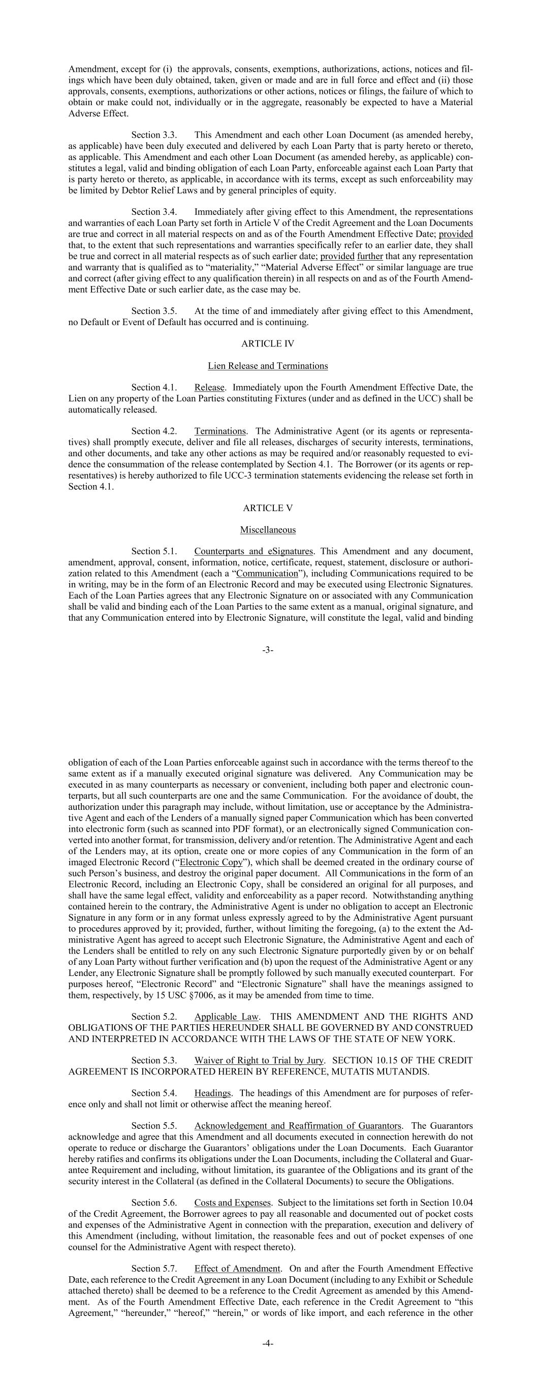 -3- Amendment, except for (i) the approvals, consents, exemptions, authorizations, actions, notices and fil- ings which have been duly obtained, taken, given or made and are in full force and effect and (ii) those approvals, consents, exemptions, authorizations or other actions, notices or filings, the failure of which to obtain or make could not, individually or in the aggregate, reasonably be expected to have a Material Adverse Effect. Section 3.3. This Amendment and each other Loan Document (as amended hereby, as applicable) have been duly executed and delivered by each Loan Party that is party hereto or thereto, as applicable. This Amendment and each other Loan Document (as amended hereby, as applicable) con- stitutes a legal, valid and binding obligation of each Loan Party, enforceable against each Loan Party that is party hereto or thereto, as applicable, in accordance with its terms, except as such enforceability may be limited by Debtor Relief Laws and by general principles of equity. Section 3.4. Immediately after giving effect to this Amendment, the representations and warranties of each Loan Party set forth in Article V of the Credit Agreement and the Loan Documents are true and correct in all material respects on and as of the Fourth Amendment Effective Date; provided that, to the extent that such representations and warranties specifically refer to an earlier date, they shall be true and correct in all material respects as of such earlier date; provided further that any representation and warranty that is qualified as to “materiality,” “Material Adverse Effect” or similar language are true and correct (after giving effect to any qualification therein) in all respects on and as of the Fourth Amend- ment Effective Date or such earlier date, as the case may be. Section 3.5. At the time of and immediately after giving effect to this Amendment, no Default or Event of Default has occurred and is continuing. ARTICLE IV Lien Release and Terminations Section 4.1. Release. Immediately upon the Fourth Amendment Effective Date, the Lien on any property of the Loan Parties constituting Fixtures (under and as defined in the UCC) shall be automatically released. Section 4.2. Terminations. The Administrative Agent (or its agents or representa- tives) shall promptly execute, deliver and file all releases, discharges of security interests, terminations, and other documents, and take any other actions as may be required and/or reasonably requested to evi- dence the consummation of the release contemplated by Section 4.1. The Borrower (or its agents or rep- resentatives) is hereby authorized to file UCC-3 termination statements evidencing the release set forth in Section 4.1. ARTICLE V Miscellaneous Section 5.1. Counterparts and eSignatures. This Amendment and any document, amendment, approval, consent, information, notice, certificate, request, statement, disclosure or authori- zation related to this Amendment (each a “Communication”), including Communications required to be in writing, may be in the form of an Electronic Record and may be executed using Electronic Signatures. Each of the Loan Parties agrees that any Electronic Signature on or associated with any Communication shall be valid and binding each of the Loan Parties to the same extent as a manual, original signature, and that any Communication entered into by Electronic Signature, will constitute the legal, valid and binding -4- obligation of each of the Loan Parties enforceable against such in accordance with the terms thereof to the same extent as if a manually executed original signature was delivered. Any Communication may be executed in as many counterparts as necessary or convenient, including both paper and electronic coun- terparts, but all such counterparts are one and the same Communication. For the avoidance of doubt, the authorization under this paragraph may include, without limitation, use or acceptance by the Administra- tive Agent and each of the Lenders of a manually signed paper Communication which has been converted into electronic form (such as scanned into PDF format), or an electronically signed Communication con- verted into another format, for transmission, delivery and/or retention. The Administrative Agent and each of the Lenders may, at its option, create one or more copies of any Communication in the form of an imaged Electronic Record (“Electronic Copy”), which shall be deemed created in the ordinary course of such Person’s business, and destroy the original paper document. All Communications in the form of an Electronic Record, including an Electronic Copy, shall be considered an original for all purposes, and shall have the same legal effect, validity and enforceability as a paper record. Notwithstanding anything contained herein to the contrary, the Administrative Agent is under no obligation to accept an Electronic Signature in any form or in any format unless expressly agreed to by the Administrative Agent pursuant to procedures approved by it; provided, further, without limiting the foregoing, (a) to the extent the Ad- ministrative Agent has agreed to accept such Electronic Signature, the Administrative Agent and each of the Lenders shall be entitled to rely on any such Electronic Signature purportedly given by or on behalf of any Loan Party without further verification and (b) upon the request of the Administrative Agent or any Lender, any Electronic Signature shall be promptly followed by such manually executed counterpart. For purposes hereof, “Electronic Record” and “Electronic Signature” shall have the meanings assigned to them, respectively, by 15 USC §7006, as it may be amended from time to time. Section 5.2. Applicable Law. THIS AMENDMENT AND THE RIGHTS AND OBLIGATIONS OF THE PARTIES HEREUNDER SHALL BE GOVERNED BY AND CONSTRUED AND INTERPRETED IN ACCORDANCE WITH THE LAWS OF THE STATE OF NEW YORK. Section 5.3. Waiver of Right to Trial by Jury. SECTION 10.15 OF THE