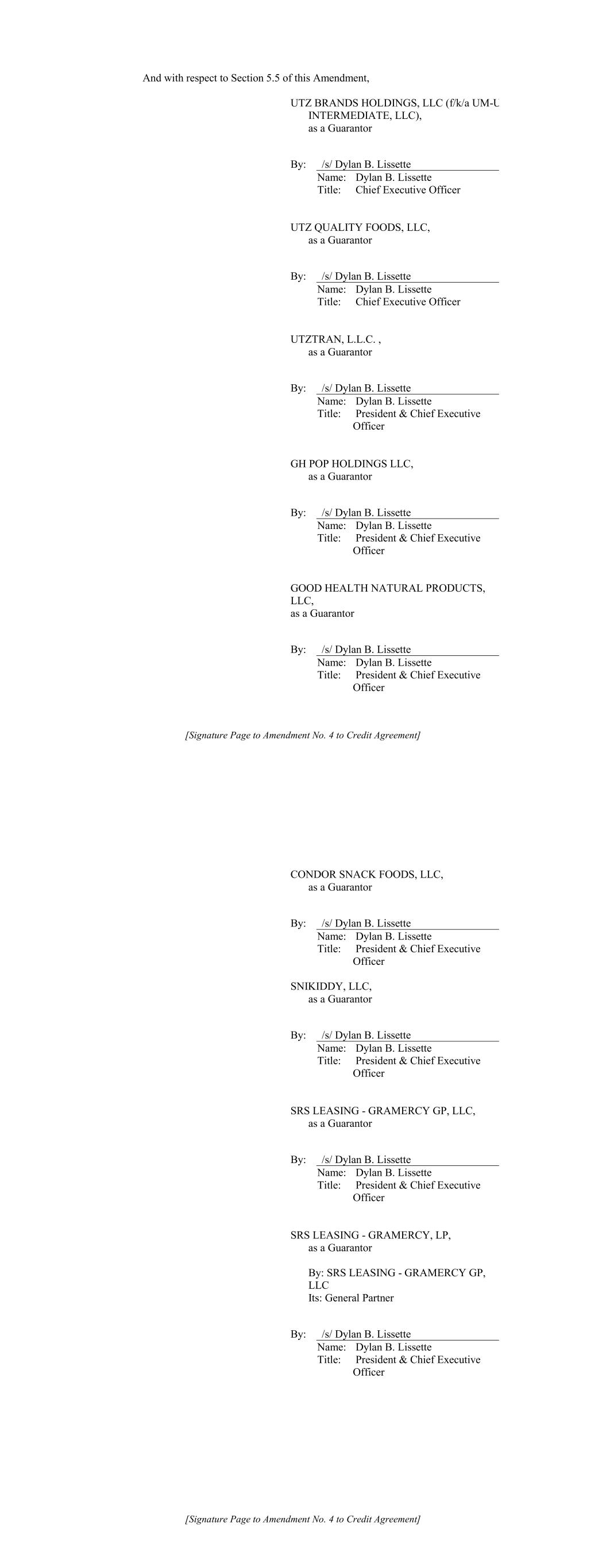 [Signature Page to Amendment No. 4 to Credit Agreement] And with respect to Section 5.5 of this Amendment, UTZ BRANDS HOLDINGS, LLC (f/k/a UM-U INTERMEDIATE, LLC), as a Guarantor By: /s/ Dylan B. Lissette Name: Dylan B. Lissette Title: Chief Executive Officer UTZ QUALITY FOODS, LLC, as a Guarantor By: /s/ Dylan B. Lissette Name: Dylan B. Lissette Title: Chief Executive Officer UTZTRAN, L.L.C. , as a Guarantor By: /s/ Dylan B. Lissette Name: Dylan B. Lissette Title: President & Chief Executive Officer GH POP HOLDINGS LLC, as a Guarantor By: /s/ Dylan B. Lissette Name: Dylan B. Lissette Title: President & Chief Executive Officer GOOD HEALTH NATURAL PRODUCTS, LLC, as a Guarantor By: /s/ Dylan B. Lissette Name: Dylan B. Lissette Title: President & Chief Executive Officer [Signature Page to Amendment No. 4 to Credit Agreement] CONDOR SNACK FOODS, LLC, as a Guarantor By: /s/ Dylan B. Lissette Name: Dylan B. Lissette Title: President & Chief Executive Officer SNIKIDDY, LLC, as a Guarantor By: /s/ Dylan B. Lissette Name: Dylan B. Lissette Title: President & Chief Executive Officer SRS LEASING - GRAMERCY GP, LLC, as a Guarantor By: /s/ Dylan B. Lissette Name: Dylan B. Lissette Title: President & Chief Executive Officer SRS LEASING - GRAMERCY, LP, as a Guarantor By: SRS LEASING - GRAMERCY GP, LLC Its: General Partner By: /s/ Dylan B. Lissette Name: Dylan B. Lissette Title: President & Chief Executive Officer