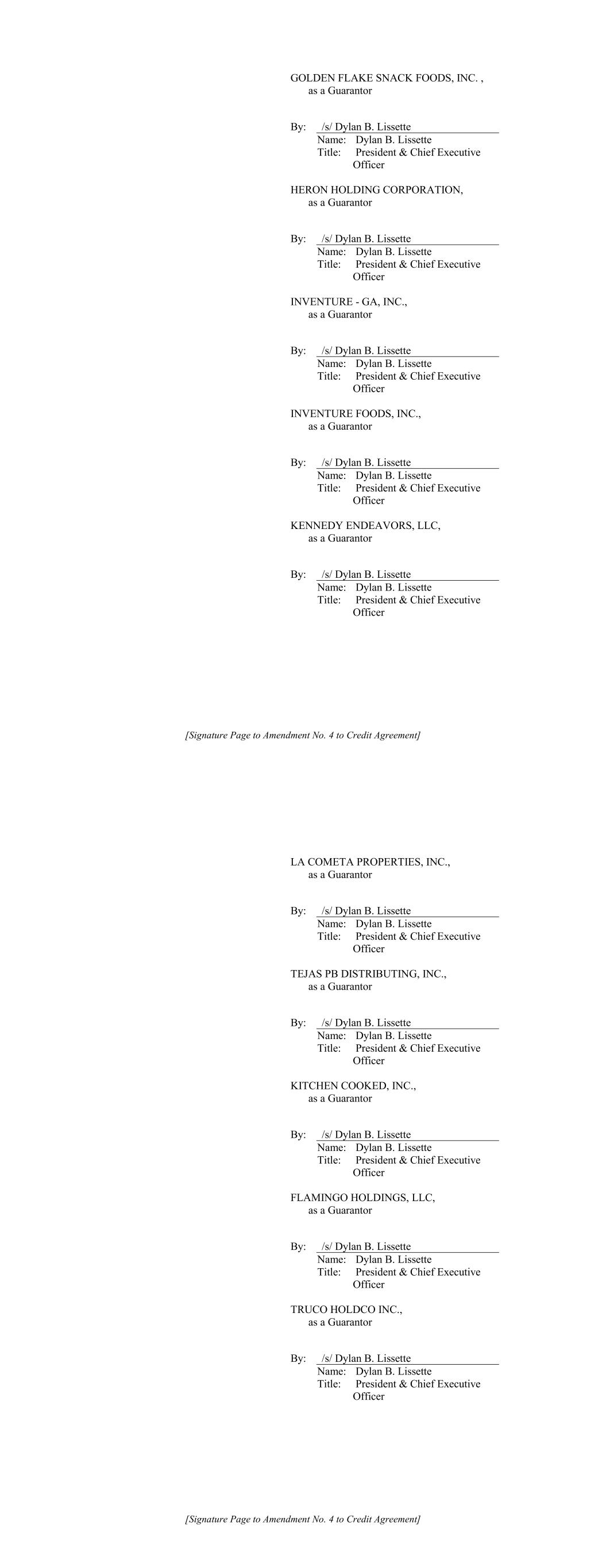 [Signature Page to Amendment No. 4 to Credit Agreement] GOLDEN FLAKE SNACK FOODS, INC. , as a Guarantor By: /s/ Dylan B. Lissette Name: Dylan B. Lissette Title: President & Chief Executive Officer HERON HOLDING CORPORATION, as a Guarantor By: /s/ Dylan B. Lissette Name: Dylan B. Lissette Title: President & Chief Executive Officer INVENTURE - GA, INC., as a Guarantor By: /s/ Dylan B. Lissette Name: Dylan B. Lissette Title: President & Chief Executive Officer INVENTURE FOODS, INC., as a Guarantor By: /s/ Dylan B. Lissette Name: Dylan B. Lissette Title: President & Chief Executive Officer KENNEDY ENDEAVORS, LLC, as a Guarantor By: /s/ Dylan B. Lissette Name: Dylan B. Lissette Title: President & Chief Executive Officer [Signature Page to Amendment No. 4 to Credit Agreement] LA COMETA PROPERTIES, INC., as a Guarantor By: /s/ Dylan B. Lissette Name: Dylan B. Lissette Title: President & Chief Executive Officer TEJAS PB DISTRIBUTING, INC., as a Guarantor By: /s/ Dylan B. Lissette Name: Dylan B. Lissette Title: President & Chief Executive Officer KITCHEN COOKED, INC., as a Guarantor By: /s/ Dylan B. Lissette Name: Dylan B. Lissette Title: President & Chief Executive Officer FLAMINGO HOLDINGS, LLC, as a Guarantor By: /s/ Dylan B. Lissette Name: Dylan B. Lissette Title: President & Chief Executive Officer TRUCO HOLDCO INC., as a Guarantor By: /s/ Dylan B. Lissette Name: Dylan B. Lissette Title: President & Chief Executive Officer