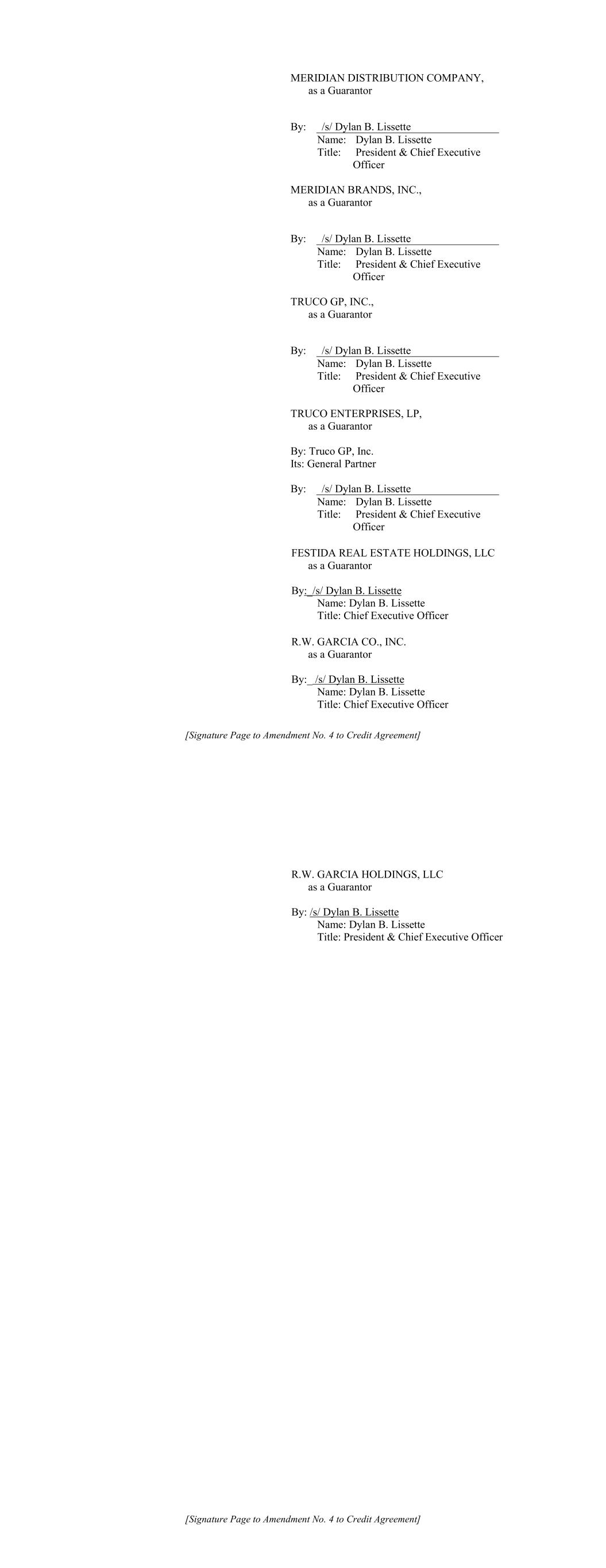 [Signature Page to Amendment No. 4 to Credit Agreement] MERIDIAN DISTRIBUTION COMPANY, as a Guarantor By: /s/ Dylan B. Lissette Name: Dylan B. Lissette Title: President & Chief Executive Officer MERIDIAN BRANDS, INC., as a Guarantor By: /s/ Dylan B. Lissette Name: Dylan B. Lissette Title: President & Chief Executive Officer TRUCO GP, INC., as a Guarantor By: /s/ Dylan B. Lissette Name: Dylan B. Lissette Title: President & Chief Executive Officer TRUCO ENTERPRISES, LP, as a Guarantor By: Truco GP, Inc. Its: General Partner By: /s/ Dylan B. Lissette Name: Dylan B. Lissette Title: President & Chief Executive Officer FESTIDA REAL ESTATE HOLDINGS, LLC as a Guarantor By:_/s/ Dylan B. Lissette Name: Dylan B. Lissette Title: Chief Executive Officer R.W. GARCIA CO., INC. as a Guarantor By:_ /s/ Dylan B. Lissette Name: Dylan B. Lissette Title: Chief Executive Officer [Signature Page to Amendment No. 4 to Credit Agreement] R.W. GARCIA HOLDINGS, LLC as a Guarantor By: /s/ Dylan B. Lissette Name: Dylan B. Lissette Title: President & Chief Executive Officer