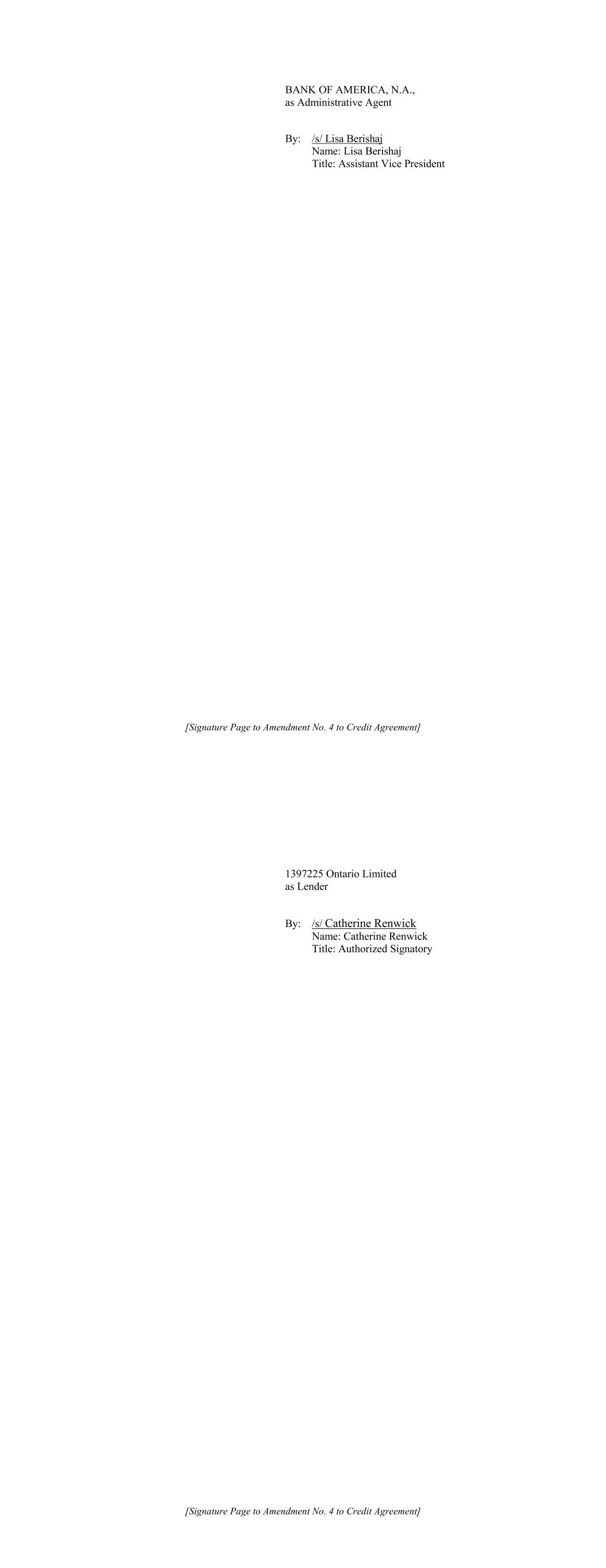 [Signature Page to Amendment No. 4 to Credit Agreement] BANK OF AMERICA, N.A., as Administrative Agent By: /s/ Lisa Berishaj Name: Lisa Berishaj Title: Assistant Vice President [Signature Page to Amendment No. 4 to Credit Agreement] 1397225 Ontario Limited as Lender By: /s/ Catherine Renwick Name: Catherine Renwick Title: Authorized Signatory