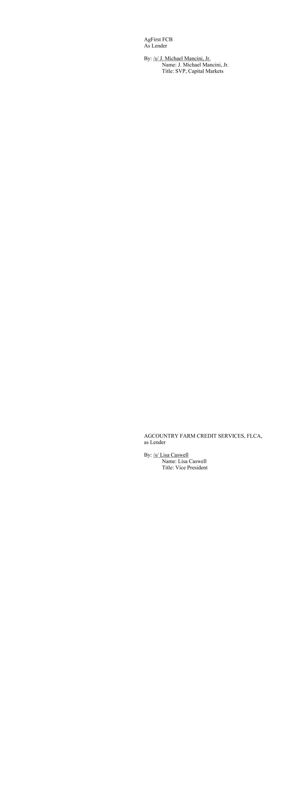 AgFirst FCB As Lender By: /s/ J. Michael Mancini, Jr. Name: J. Michael Mancini, Jr. Title: SVP, Capital Markets AGCOUNTRY FARM CREDIT SERVICES, FLCA, as Lender By: /s/ Lisa Caswell Name: Lisa Caswell Title: Vice President
