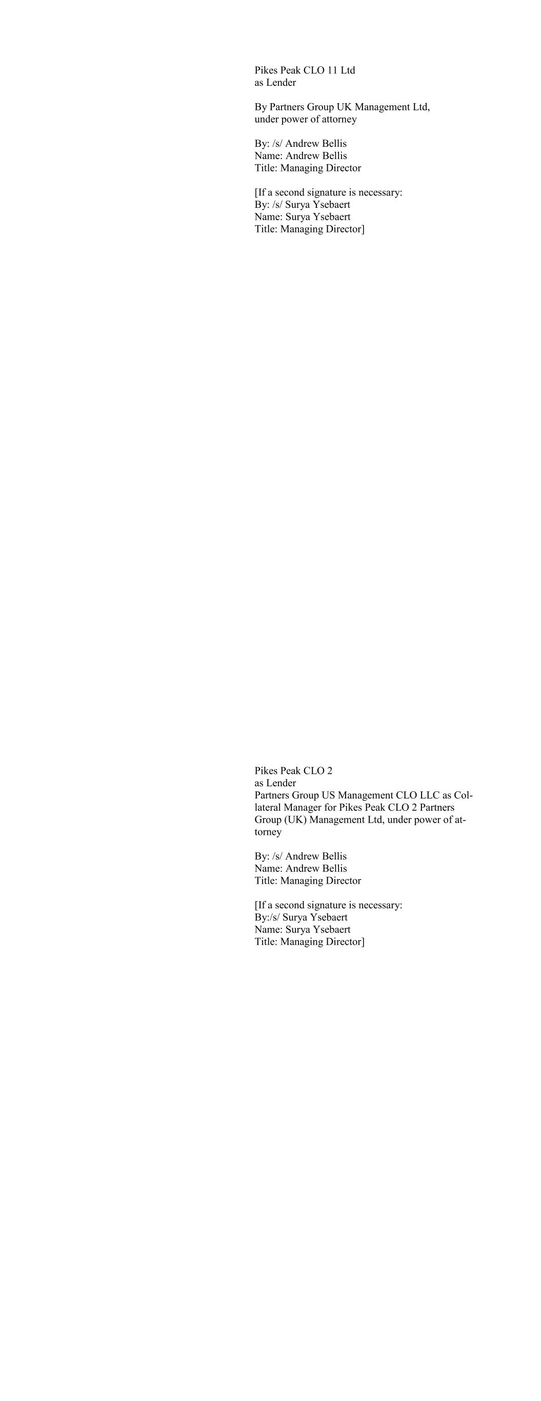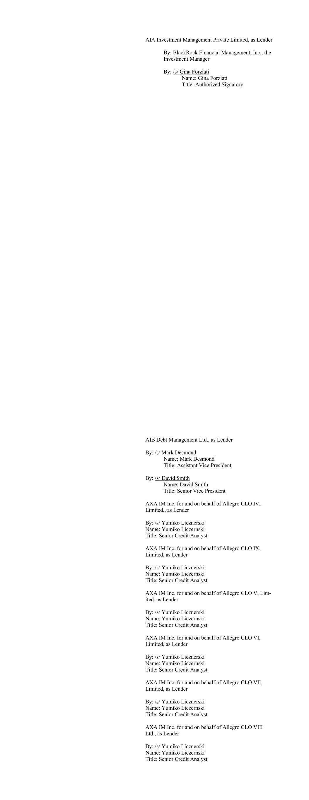 AIA Investment Management Private Limited, as Lender By: BlackRock Financial Management, Inc., the Investment Manager By: /s/ Gina Forziati Name: Gina Forziati Title: Authorized Signatory AIB Debt Management Ltd., as Lender By: /s/ Mark Desmond Name: Mark Desmond Title: Assistant Vice President By: /s/ David Smith Name: David Smith Title: Senior Vice President AXA IM Inc. for and on behalf of Allegro CLO IV, Limited., as Lender By: /s/ Yumiko Licznerski Name: Yumiko Liczernski Title: Senior Credit Analyst AXA IM Inc. for and on behalf of Allegro CLO IX, Limited, as Lender By: /s/ Yumiko Licznerski Name: Yumiko Liczernski Title: Senior Credit Analyst AXA IM Inc. for and on behalf of Allegro CLO V, Lim- ited, as Lender By: /s/ Yumiko Licznerski Name: Yumiko Liczernski Title: Senior Credit Analyst AXA IM Inc. for and on behalf of Allegro CLO VI, Limited, as Lender By: /s/ Yumiko Licznerski Name: Yumiko Liczernski Title: Senior Credit Analyst AXA IM Inc. for and on behalf of Allegro CLO VII, Limited, as Lender By: /s/ Yumiko Licznerski Name: Yumiko Liczernski Title: Senior Credit Analyst AXA IM Inc. for and on behalf of Allegro CLO VIII Ltd., as Lender By: /s/ Yumiko Licznerski Name: Yumiko Liczernski Title: Senior Credit Analyst