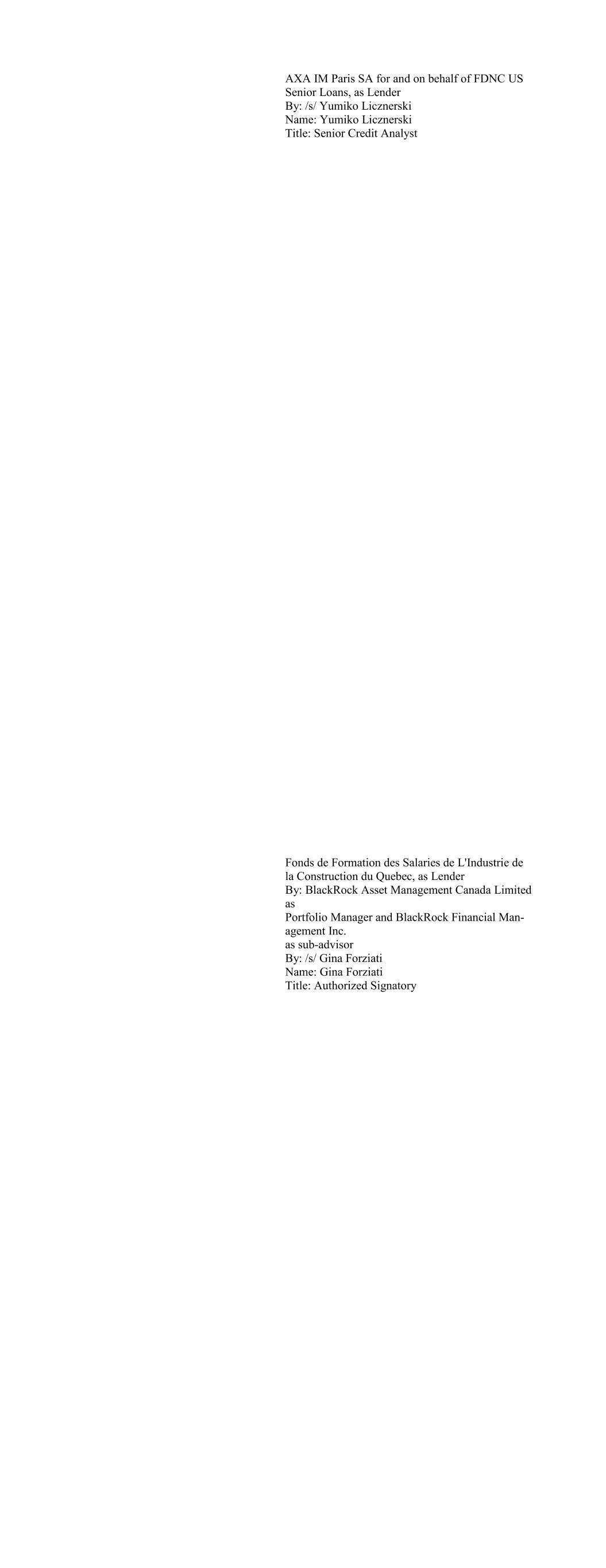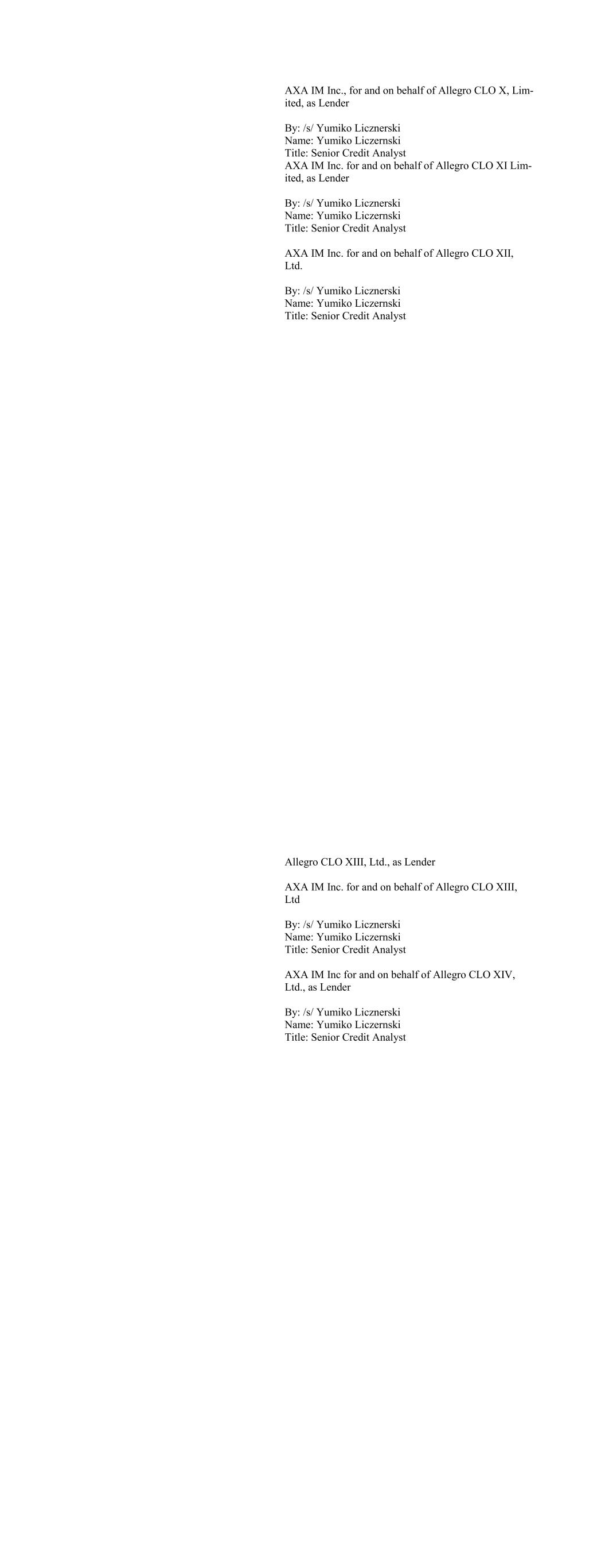 AXA IM Inc., for and on behalf of Allegro CLO X, Lim- ited, as Lender By: /s/ Yumiko Licznerski Name: Yumiko Liczernski Title: Senior Credit Analyst AXA IM Inc. for and on behalf of Allegro CLO XI Lim- ited, as Lender By: /s/ Yumiko Licznerski Name: Yumiko Liczernski Title: Senior Credit Analyst AXA IM Inc. for and on behalf of Allegro CLO XII, Ltd. By: /s/ Yumiko Licznerski Name: Yumiko Liczernski Title: Senior Credit Analyst Allegro CLO XIII, Ltd., as Lender AXA IM Inc. for and on behalf of Allegro CLO XIII, Ltd By: /s/ Yumiko Licznerski Name: Yumiko Liczernski Title: Senior Credit Analyst AXA IM Inc for and on behalf of Allegro CLO XIV, Ltd., as Lender By: /s/ Yumiko Licznerski Name: Yumiko Liczernski Title: Senior Credit Analyst