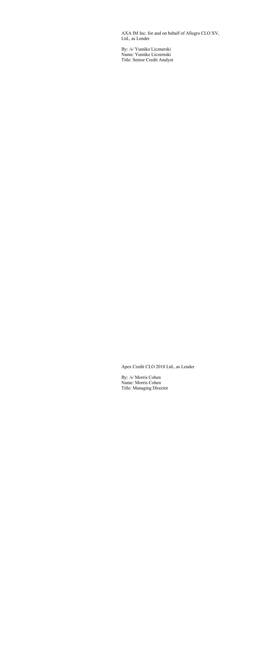 AXA IM Inc. for and on behalf of Allegro CLO XV, Ltd., as Lender By: /s/ Yumiko Licznerski Name: Yumiko Liczernski Title: Senior Credit Analyst Apex Credit CLO 2018 Ltd., as Lender By: /s/ Morris Cohen Name: Morris Cohen Title: Managing Director