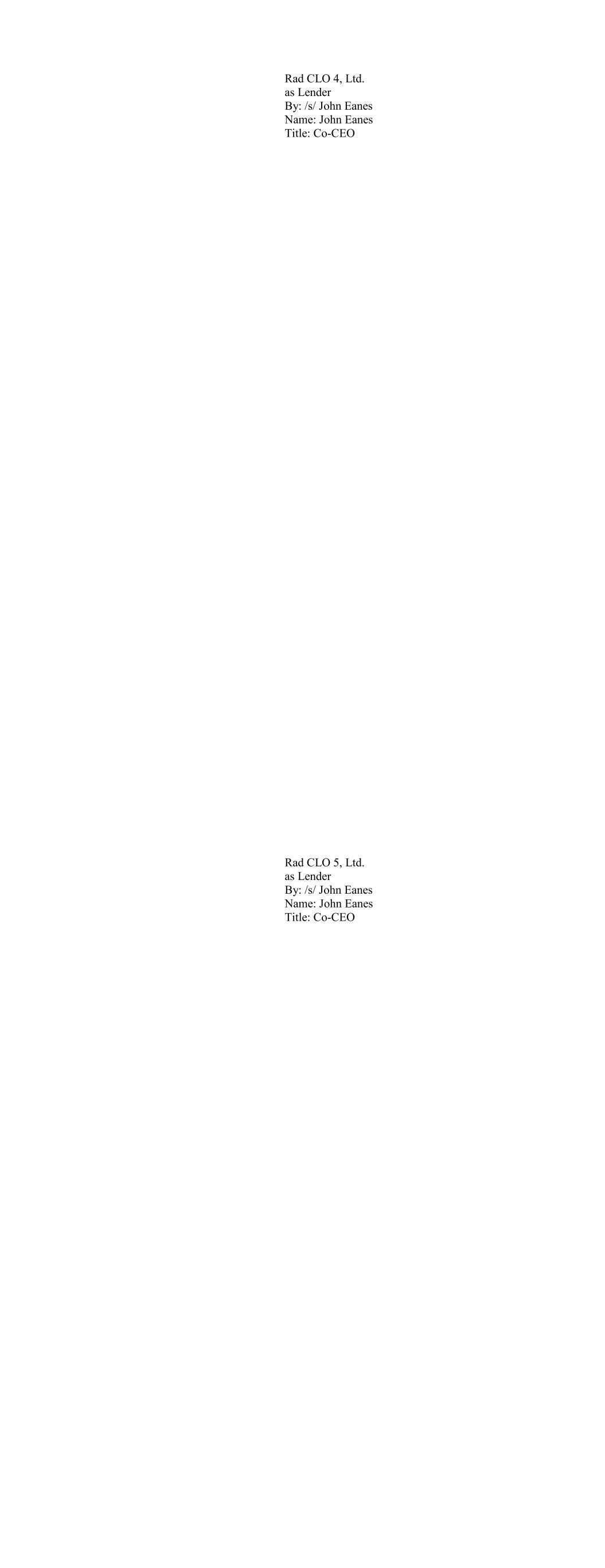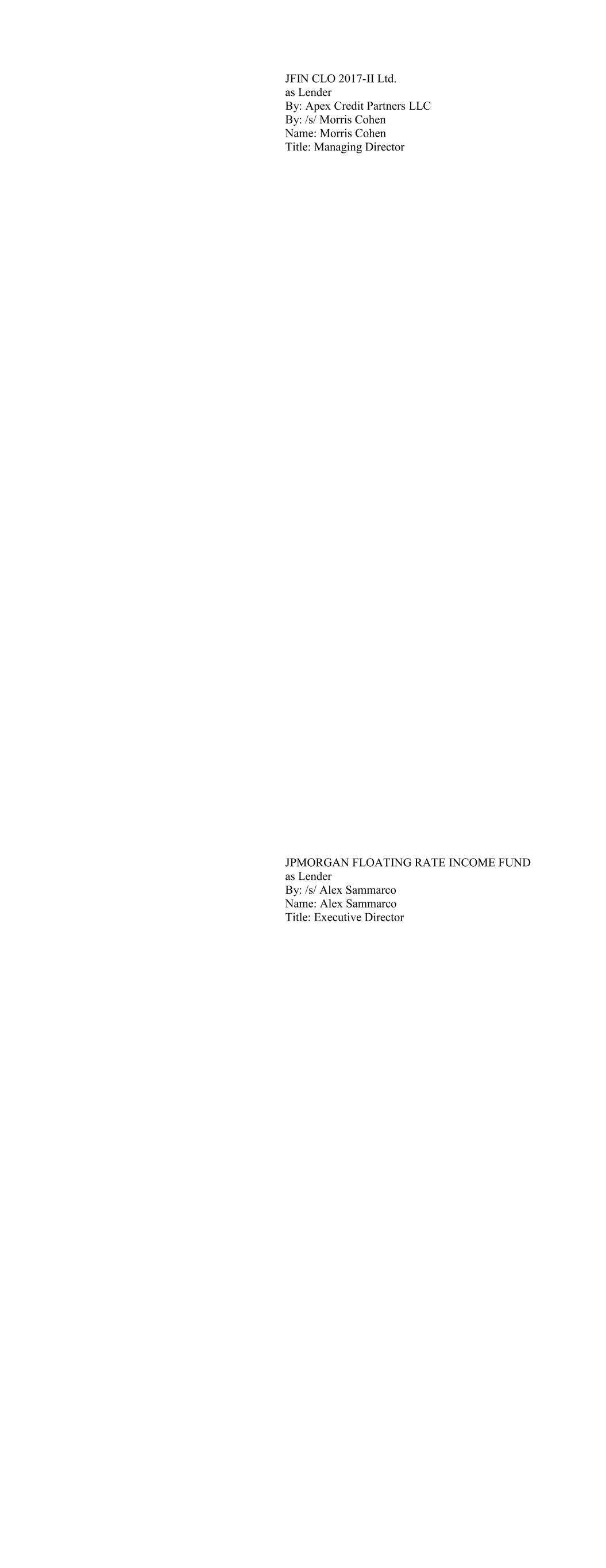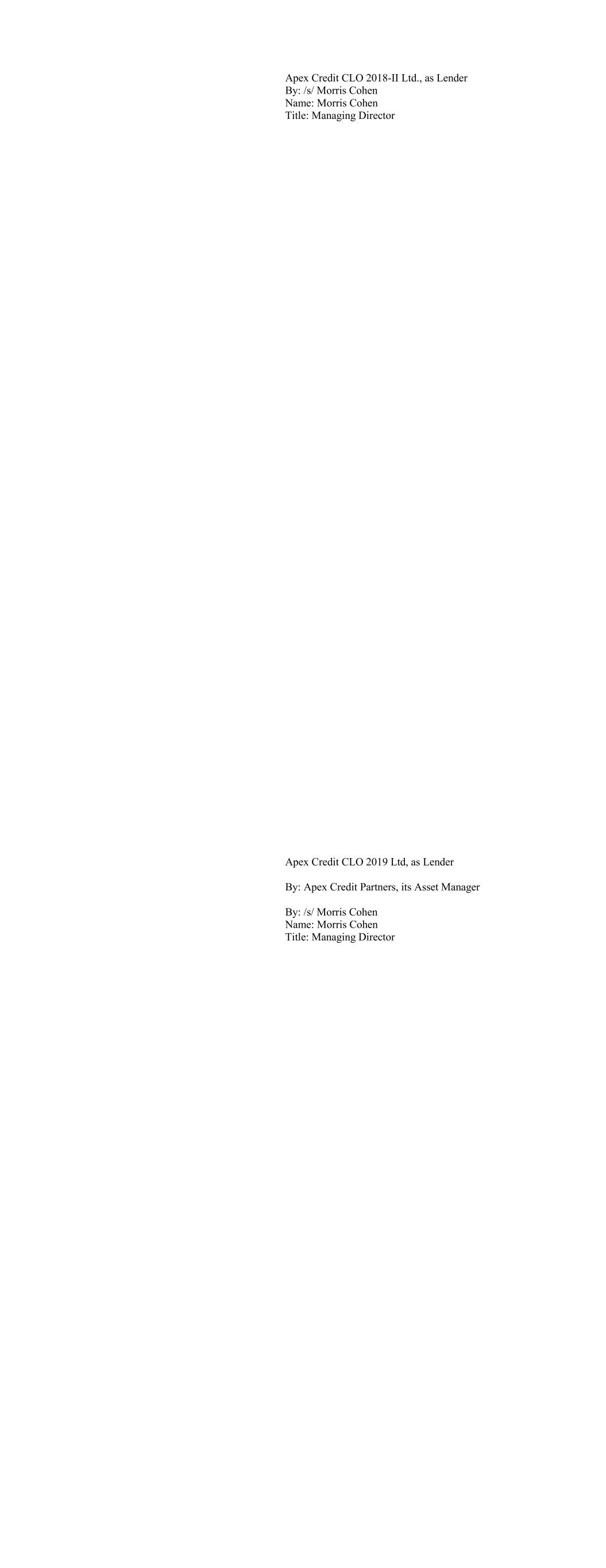 Apex Credit CLO 2018-II Ltd., as Lender By: /s/ Morris Cohen Name: Morris Cohen Title: Managing Director Apex Credit CLO 2019 Ltd, as Lender By: Apex Credit Partners, its Asset Manager By: /s/ Morris Cohen Name: Morris Cohen Title: Managing Director